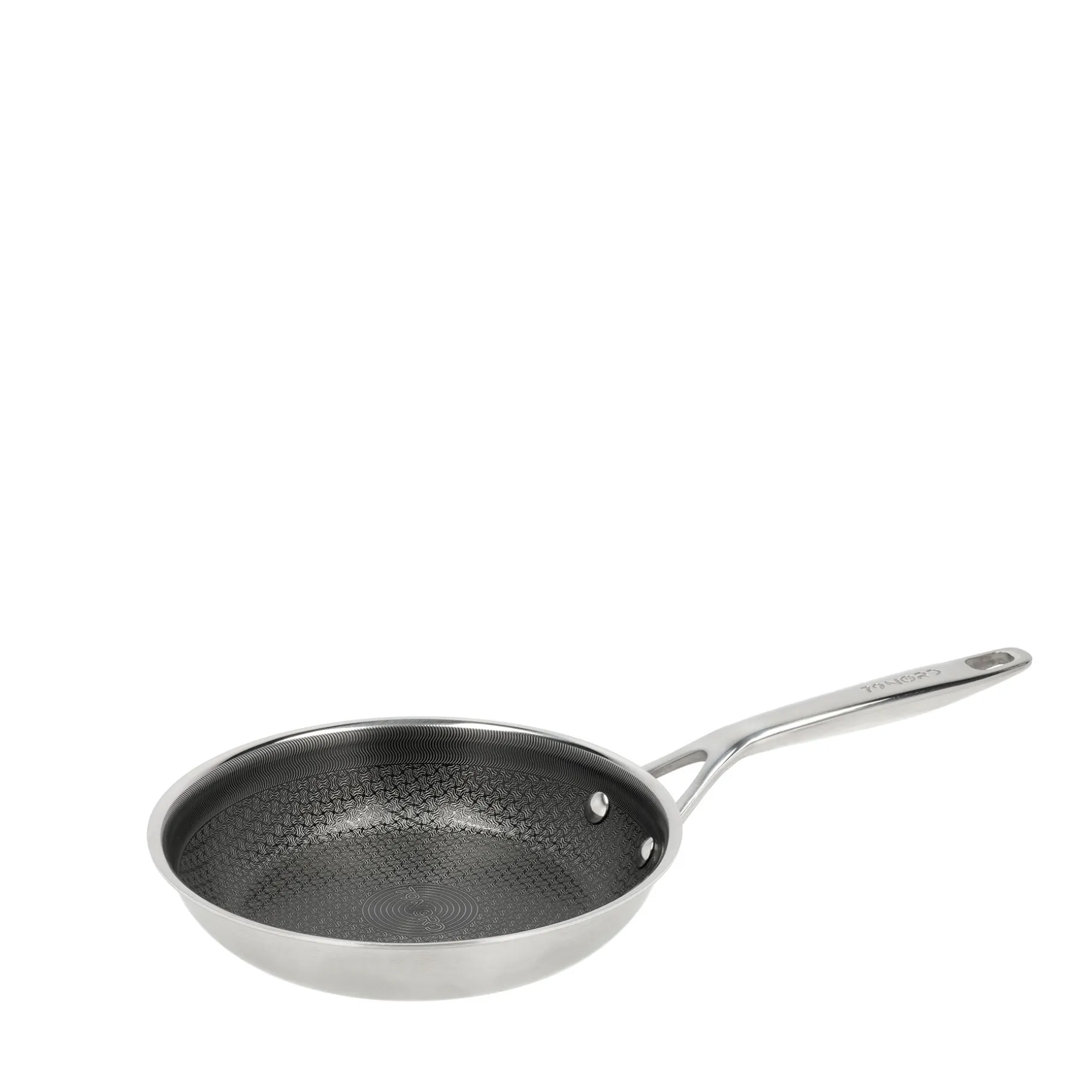 Hybridbelægningen kombinerer et forhøjet mønster i rustfrit stål med en PFAS-fri keramisk belægning, der giver non-stick-effekt og beskytter bunden. Den er let at rengøre og tåler alle redskaber, men træ-, plast- og silikoneværktøjer anbefales.