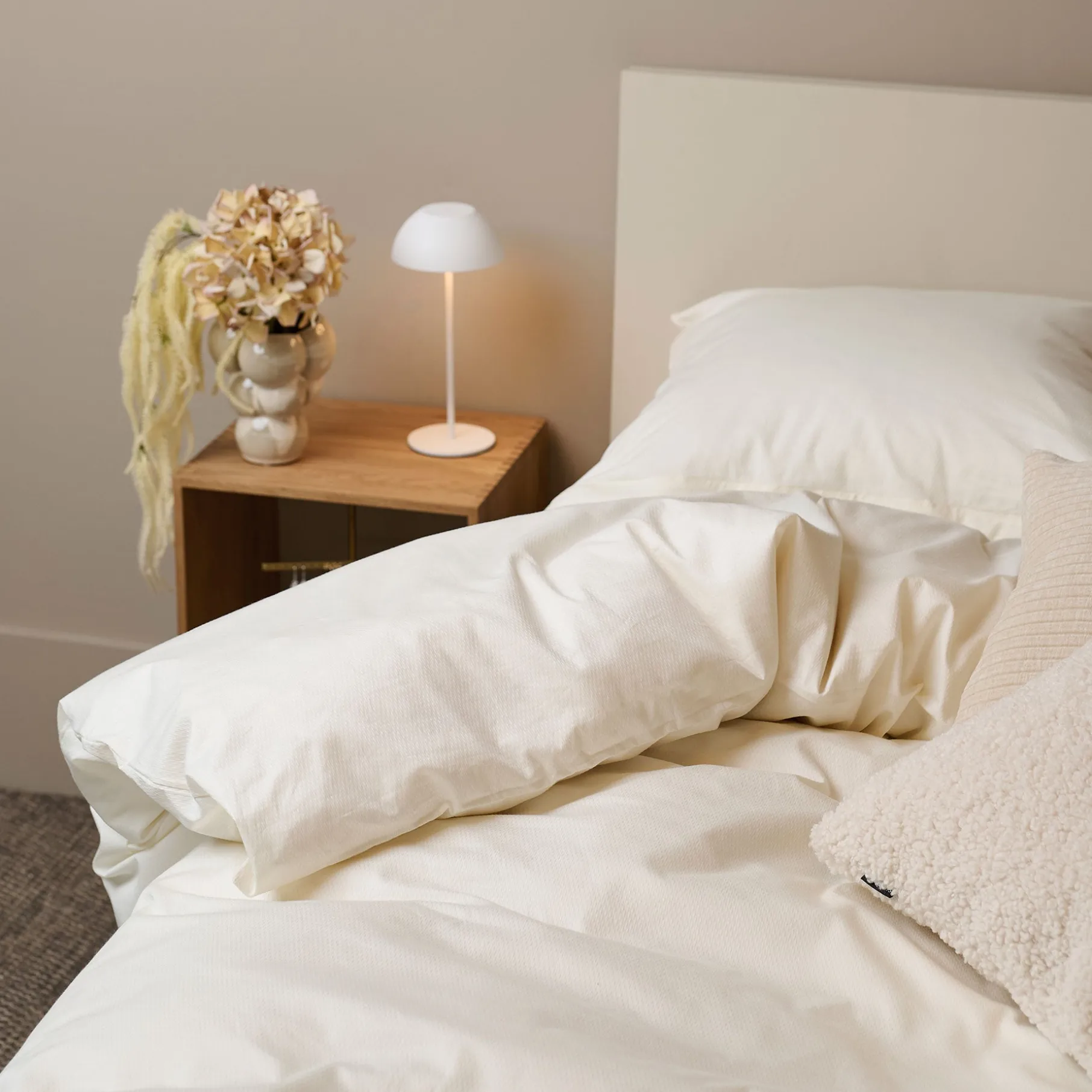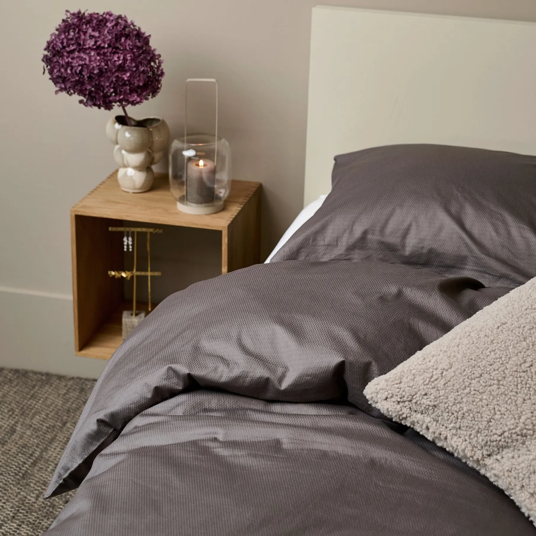 Satin-vævningen giver stoffet en glat, blød og let glansfuld overflade, som ofte forbindes med luksus og hotelstemning. Det føles køligt og silkeblødt mod huden.