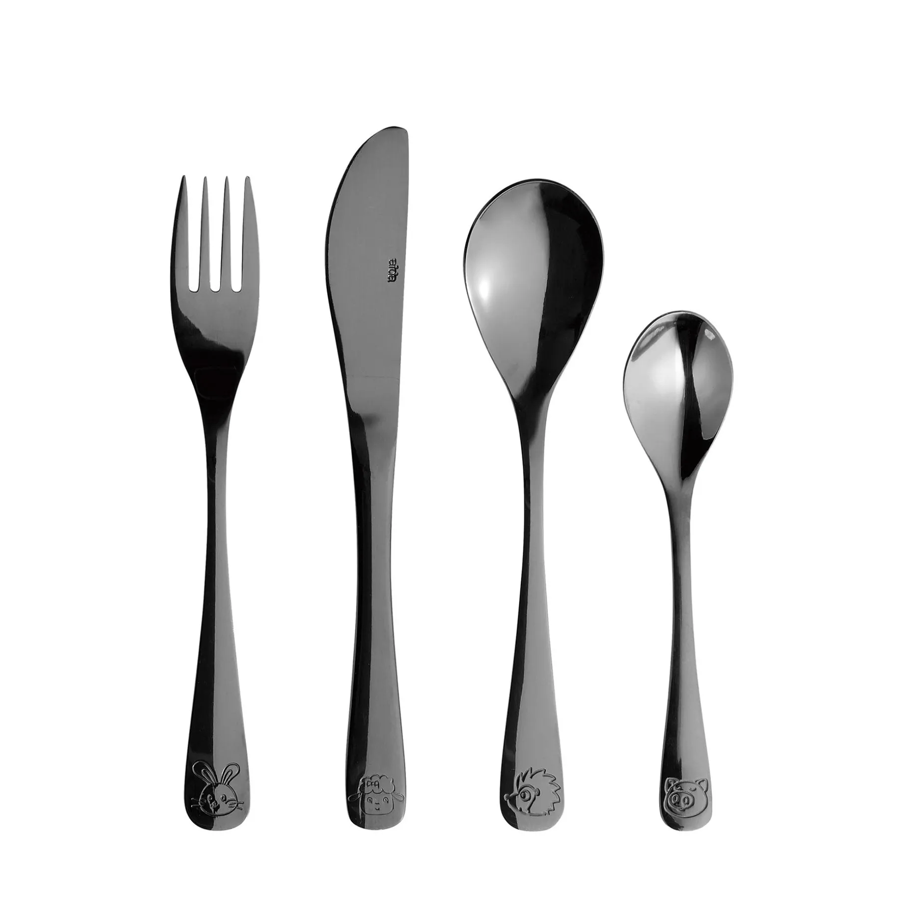 Nu kan de mindste også være med, med deres helt eget bestik, hvor gaffel, kniv, teske og ske føler med. Det flotte bestik er enkelt og klassisk og består af 4 dele, hvor der er små dyr indgraveret, så det bliver lidt sjovere at spise sin mad. Bestikket ligger godt i hånden og er food safe testet.