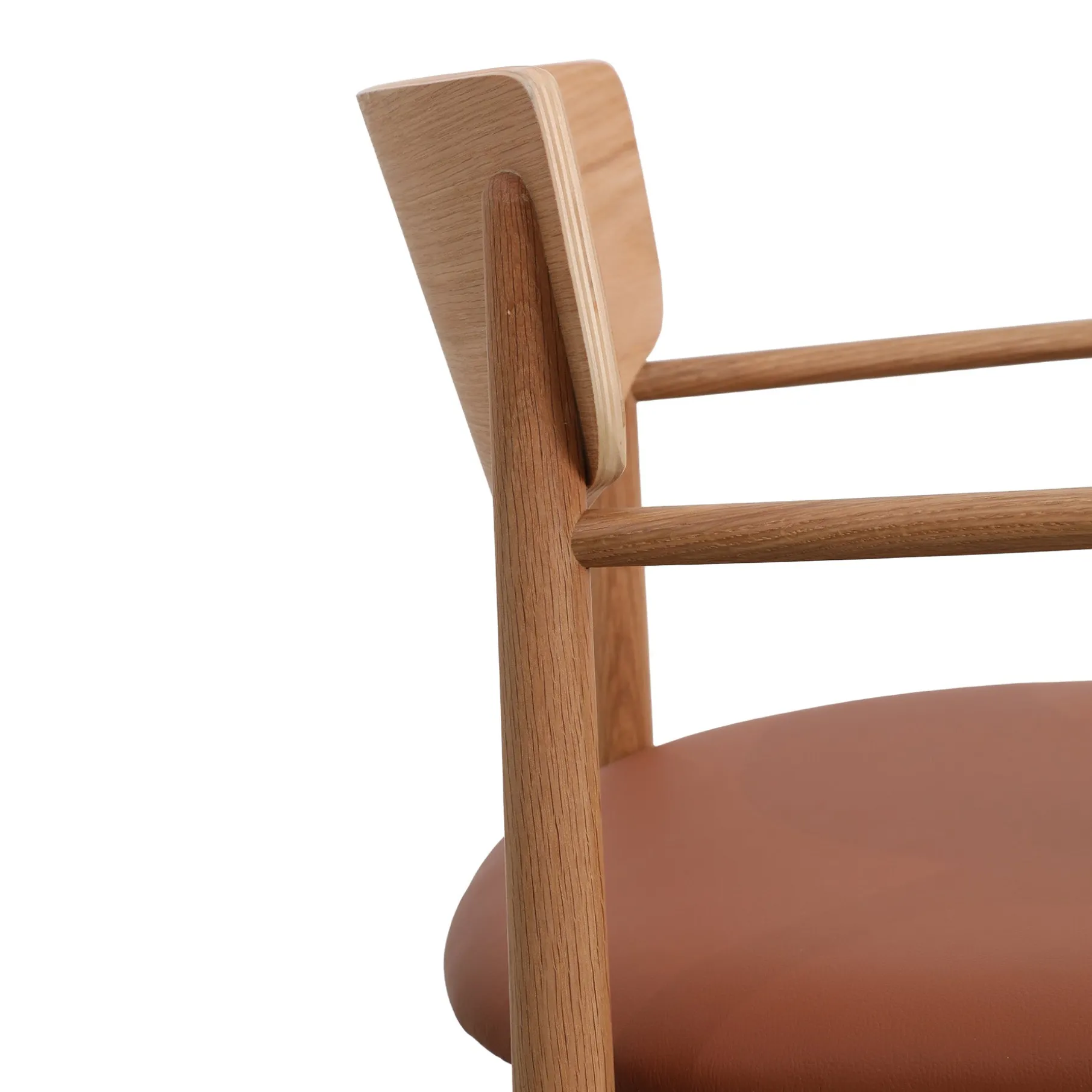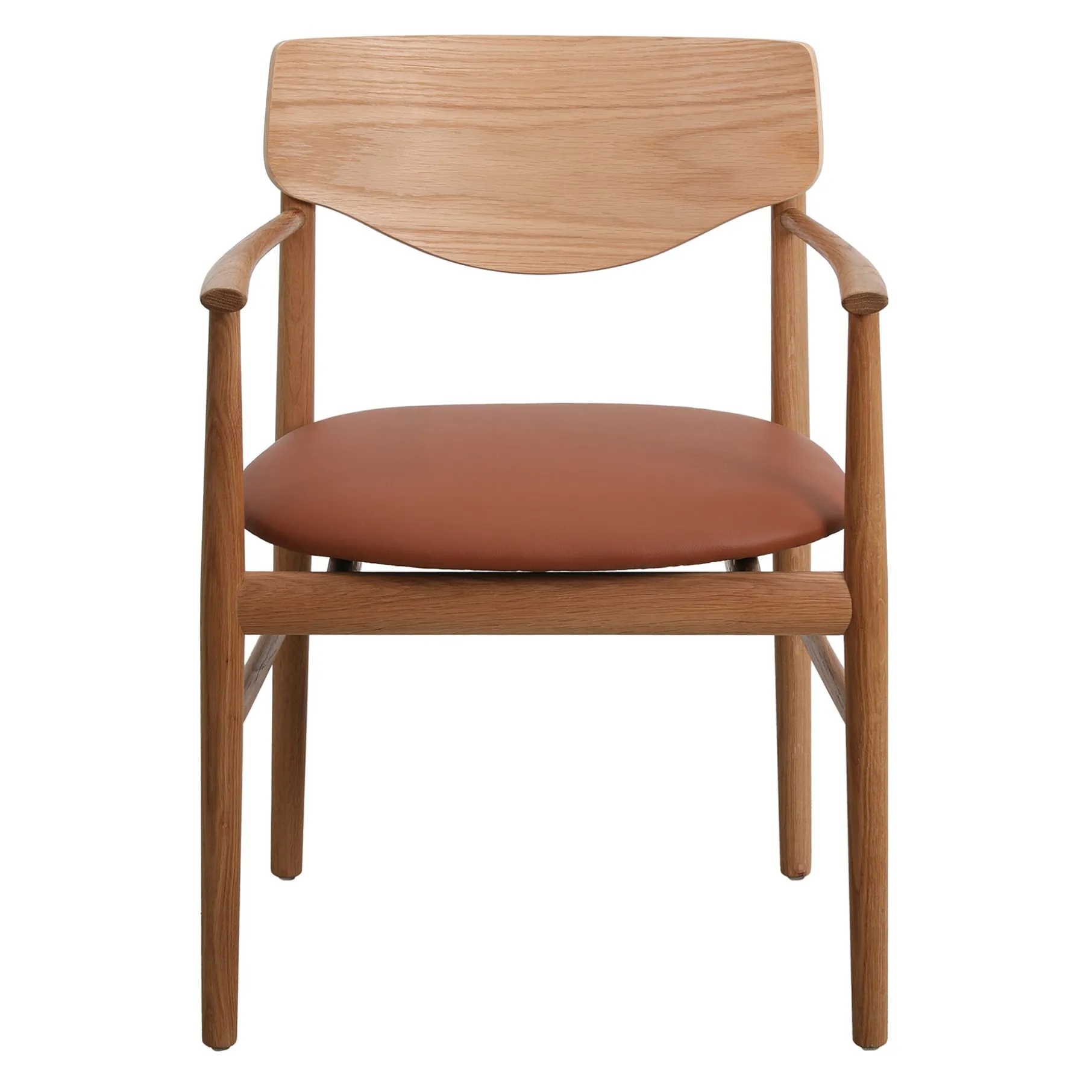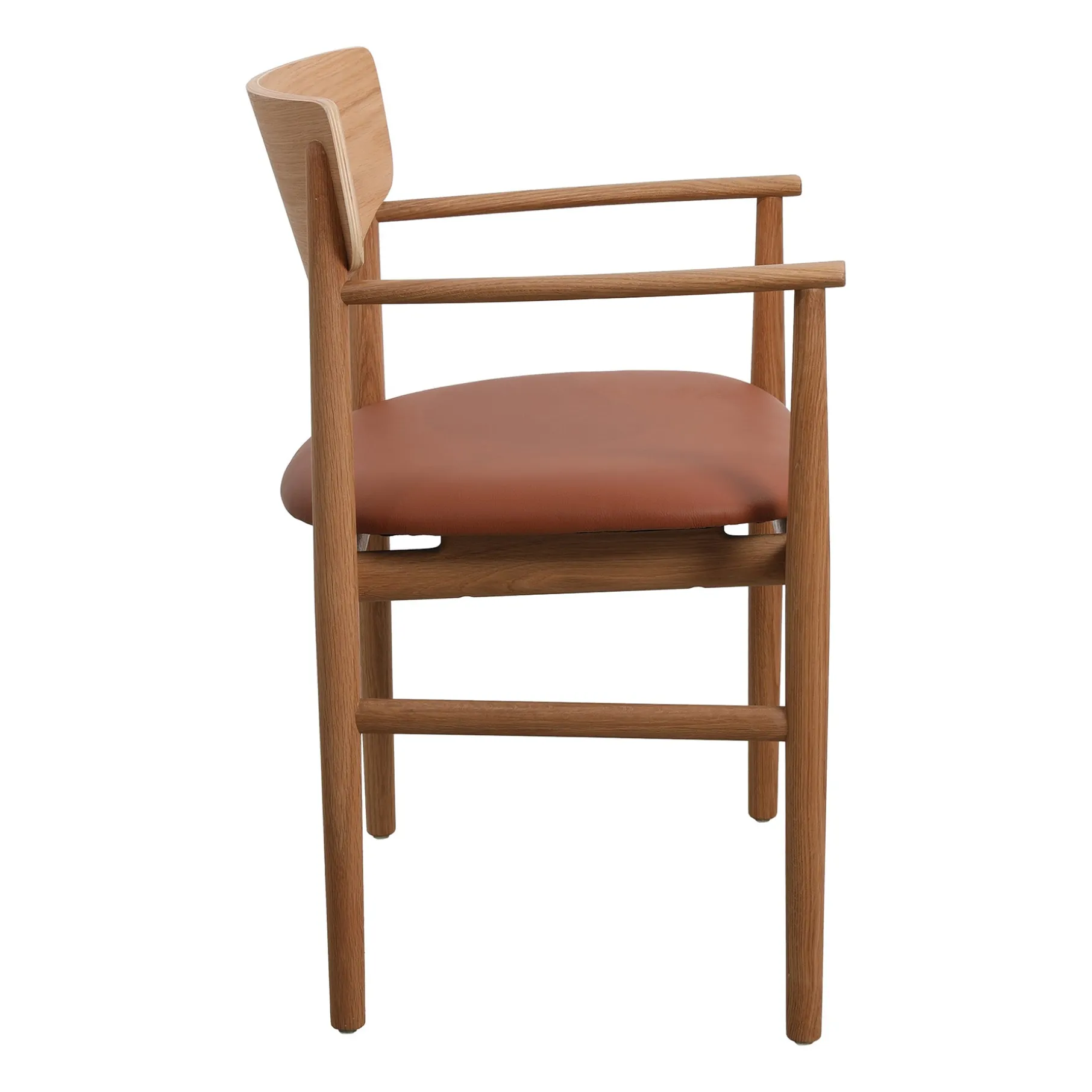 Stolens ramme er lavet af massiv egetræ og krydsfinér, der giver et varmt og naturligt udtryk samtidig med, at det sikrer en robust konstruktion. Det ergonomisk formede sæde er polstret i læder og fås i to elegante farver: dyb sort for et klassisk look eller varm cognac, der tilfører rummet et strejf af eksklusivitet.