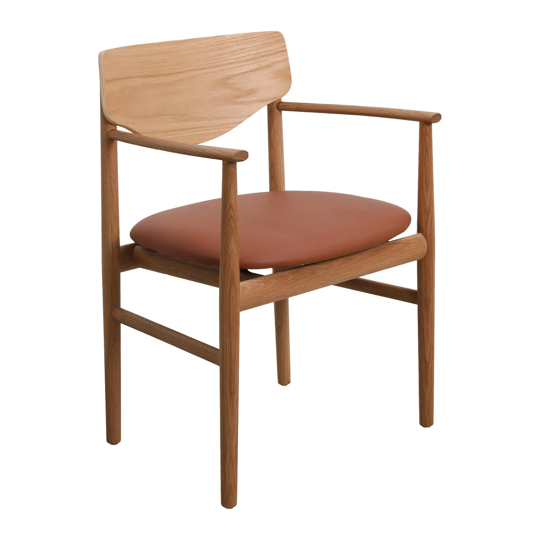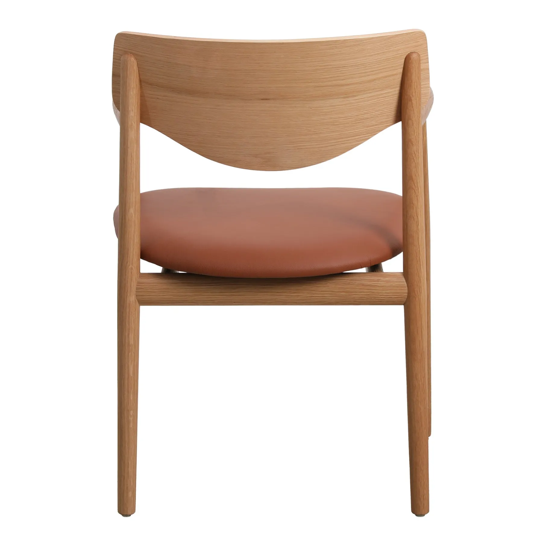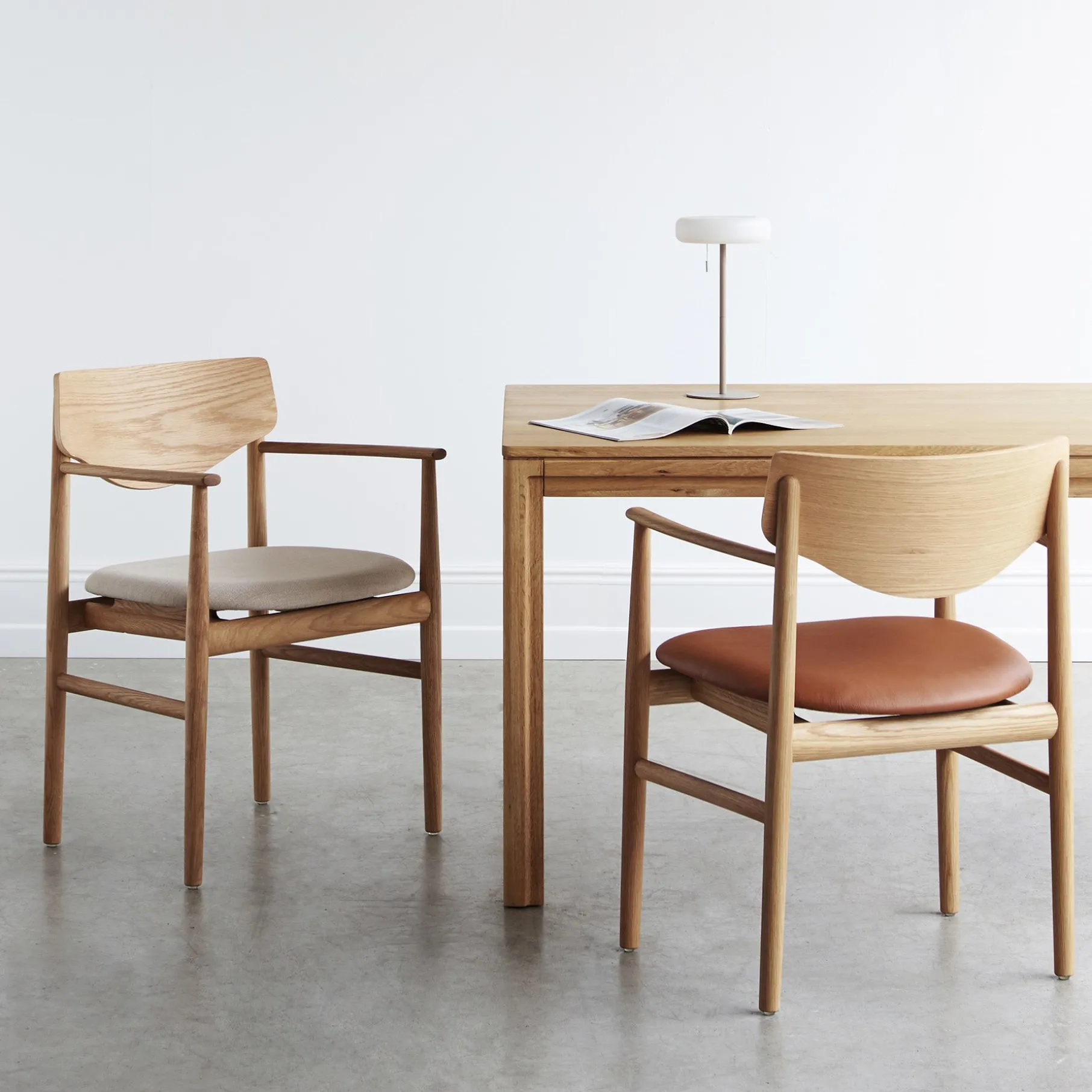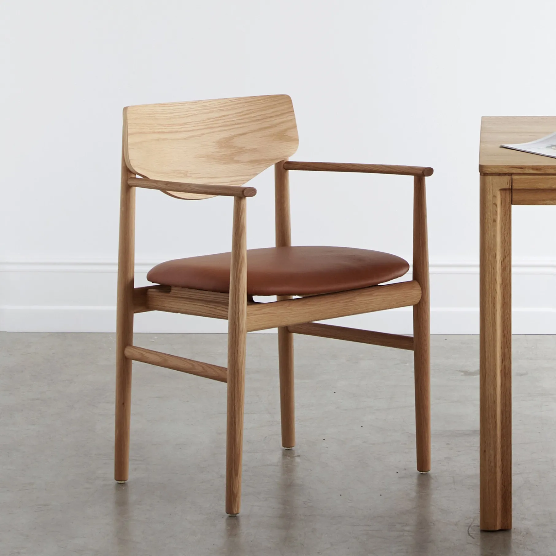 Stolens ramme er lavet af massiv egetræ og krydsfinér, der giver et varmt og naturligt udtryk samtidig med, at det sikrer en robust konstruktion. Det ergonomisk formede sæde er polstret i læder og fås i to elegante farver: dyb sort for et klassisk look eller varm cognac, der tilfører rummet et strejf af eksklusivitet.