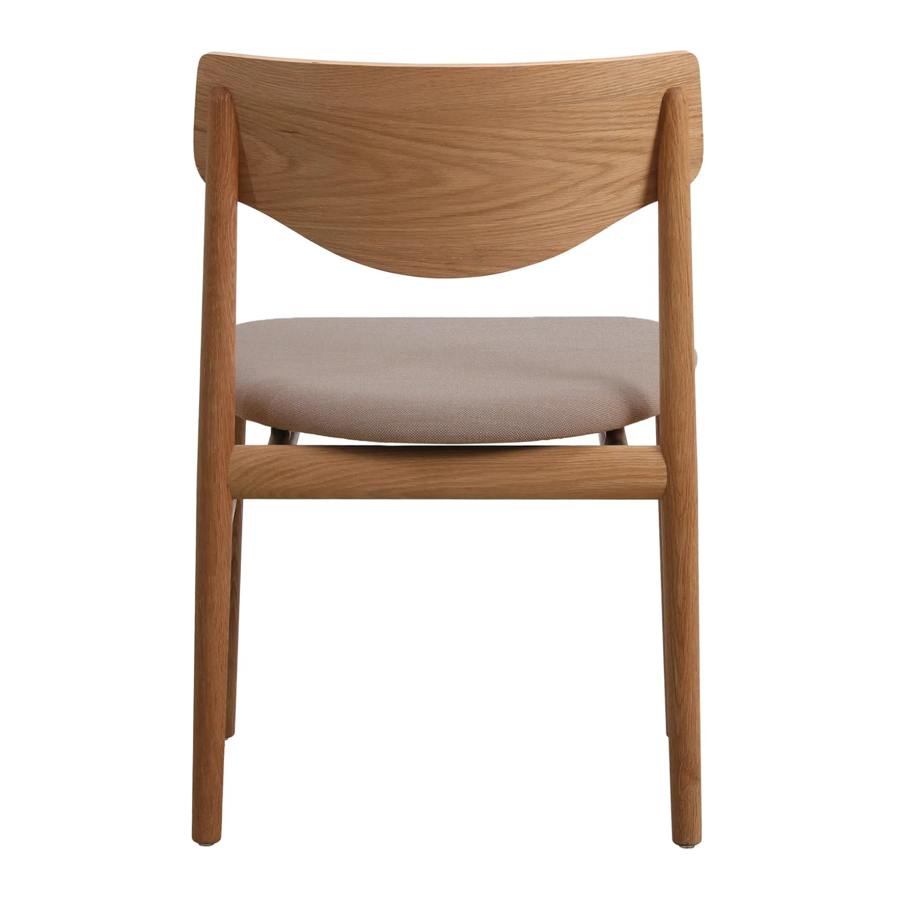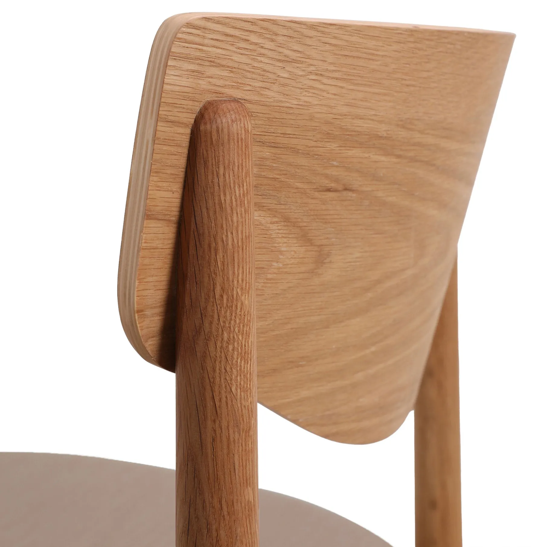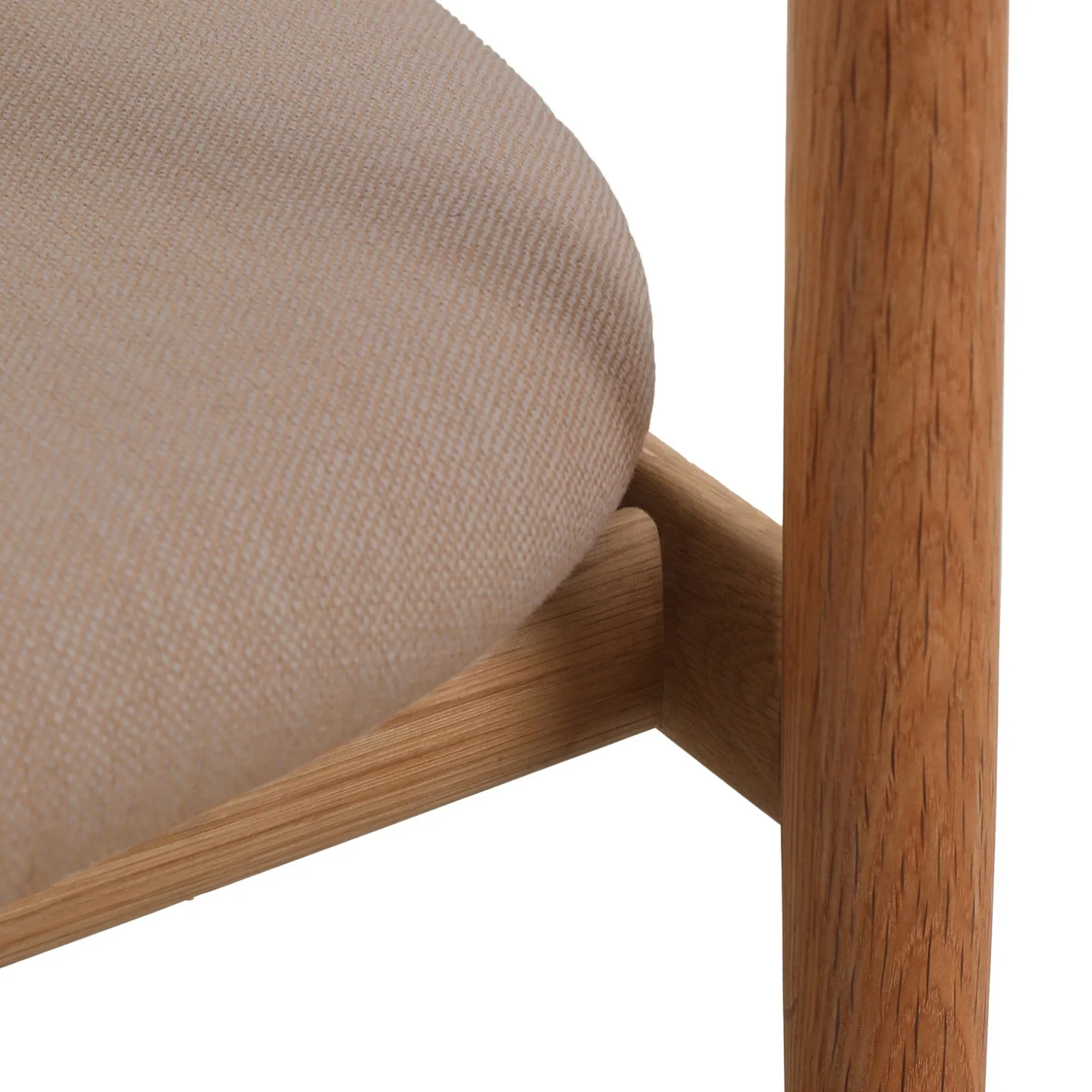 Stolens stel er lavet af massiv egetræ og krydsfiner, hvilket sikrer både holdbarhed og tidløs skønhed. Den varme træstruktur fremhæver de naturlige årer og skaber en organisk følelse, der passer perfekt til moderne, hyggelige hjem.