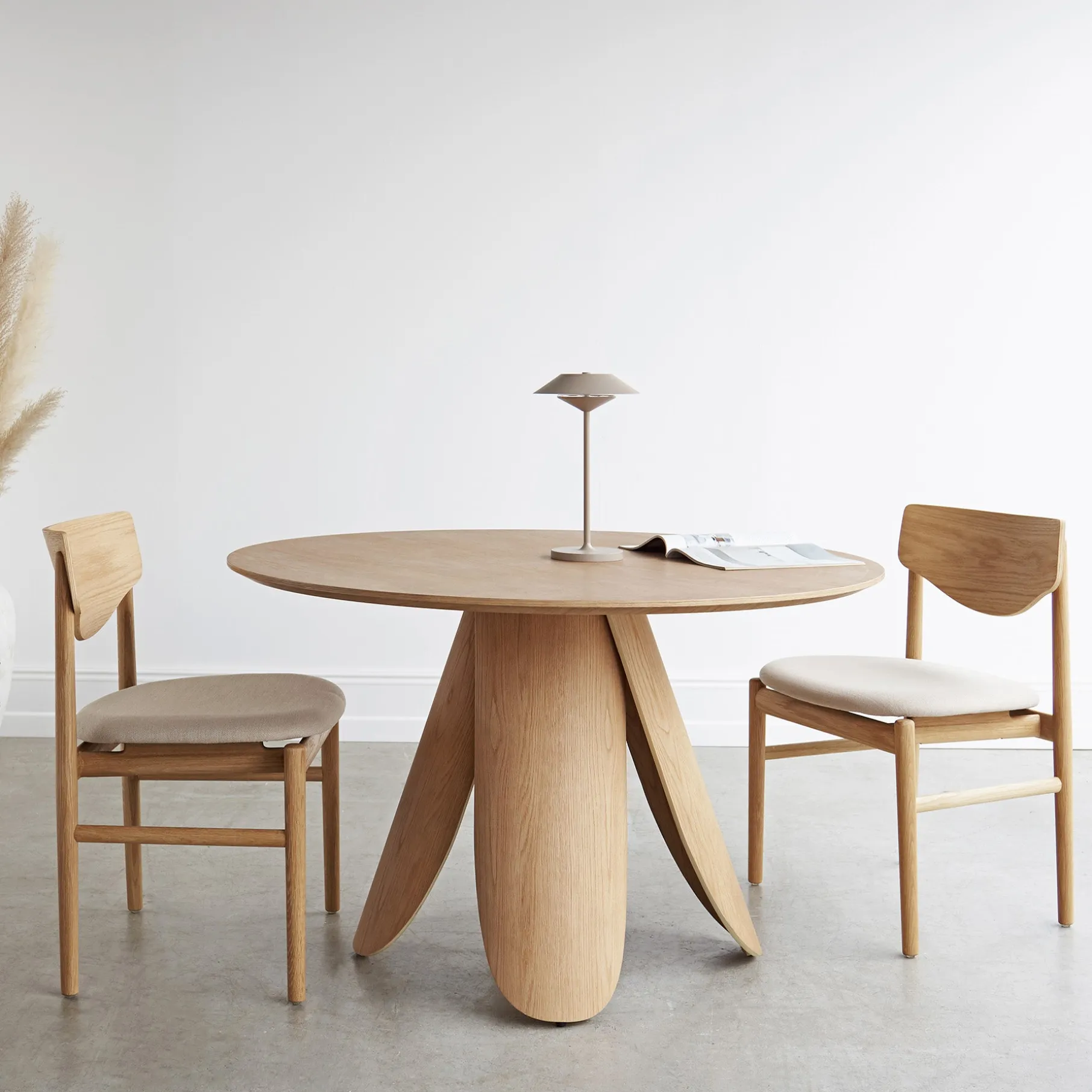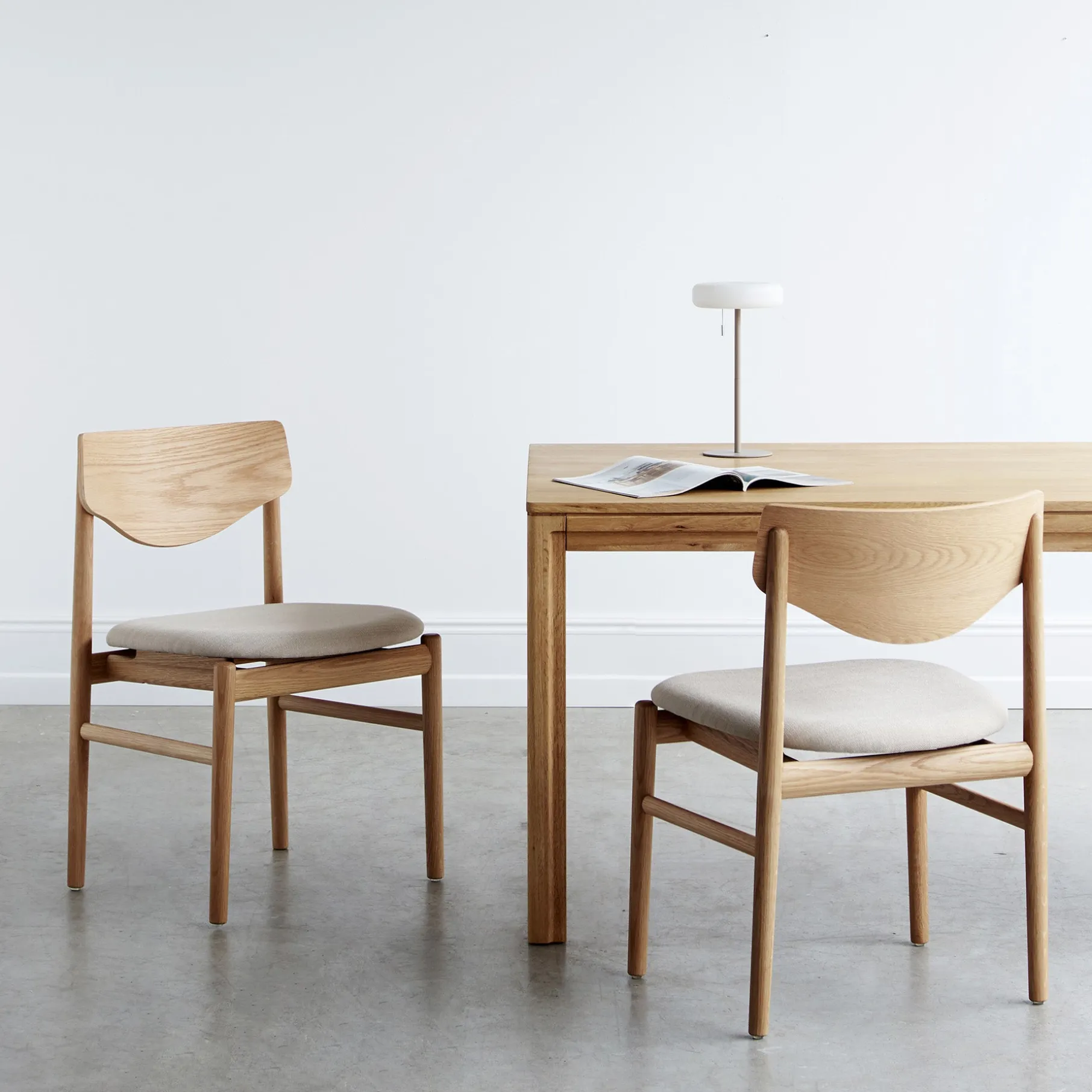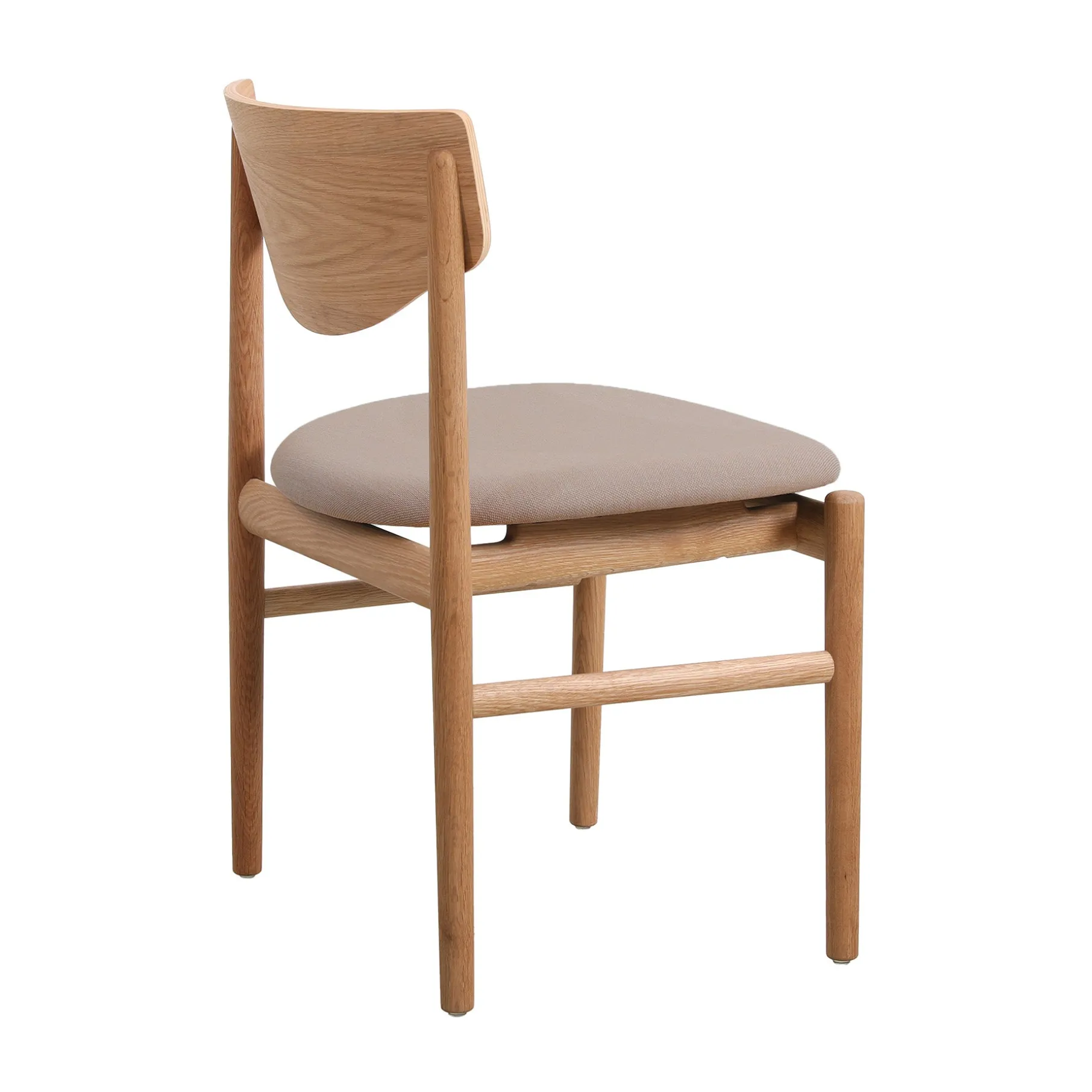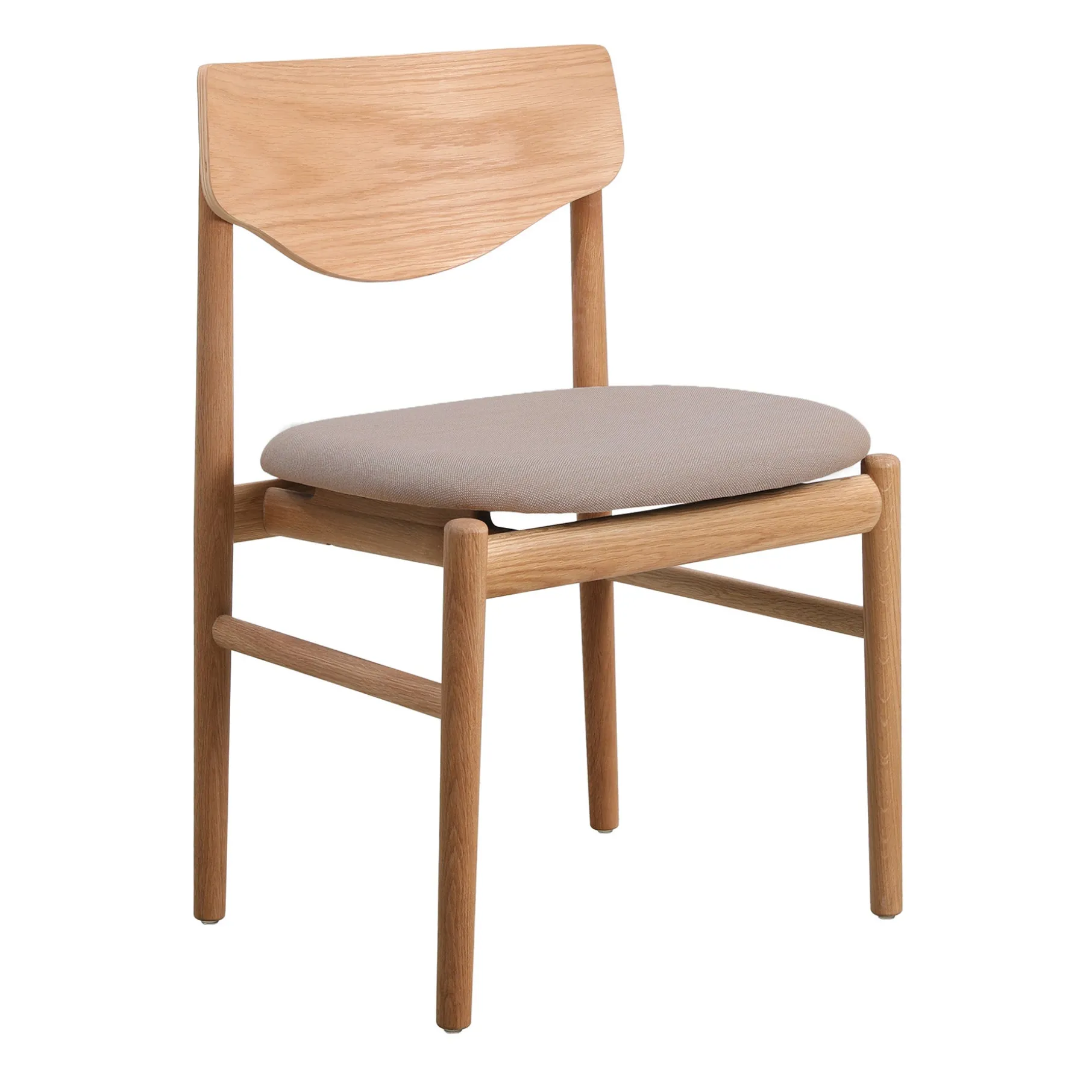Stolens stel er lavet af massiv egetræ og krydsfiner, hvilket sikrer både holdbarhed og tidløs skønhed. Den varme træstruktur fremhæver de naturlige årer og skaber en organisk følelse, der passer perfekt til moderne, hyggelige hjem.