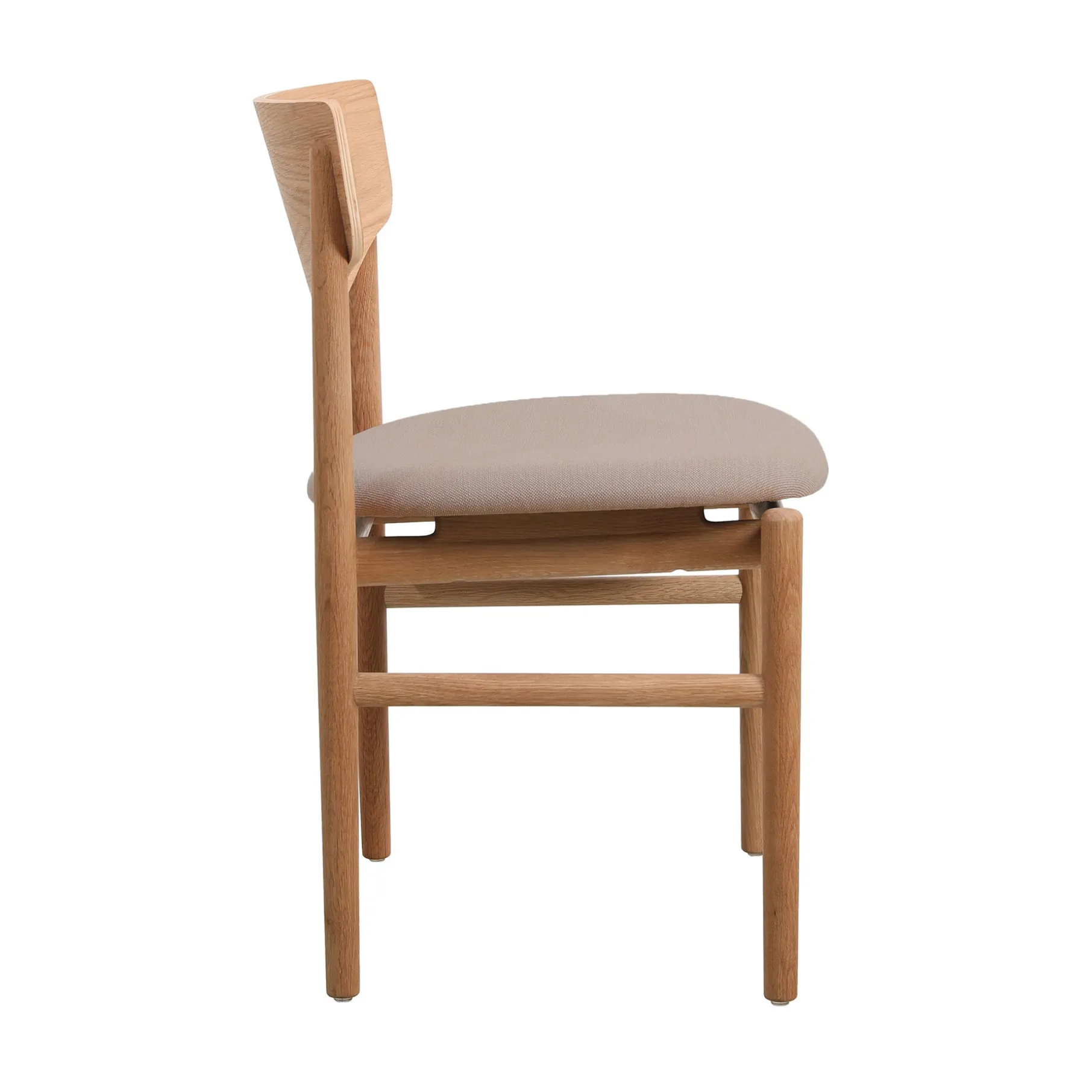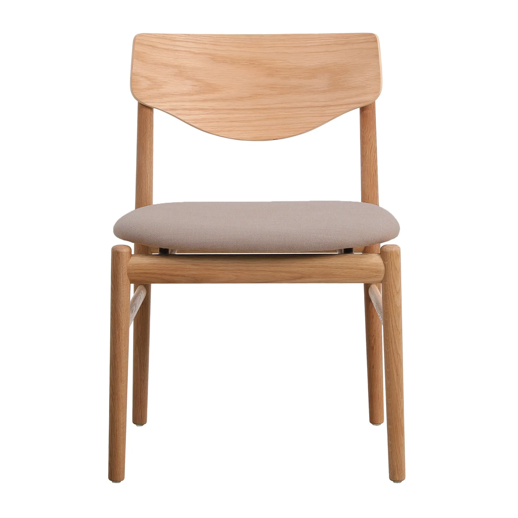 Sædet er betrukket med en blød polyesterpolstring i en stilren lys brun nuance, som både er praktisk og komfortabel. Den enkle og funktionelle form uden armlæn gør Celeste ideel til både små og store spiseområder, da den nemt kan skubbes ind under bordet og sparer plads.