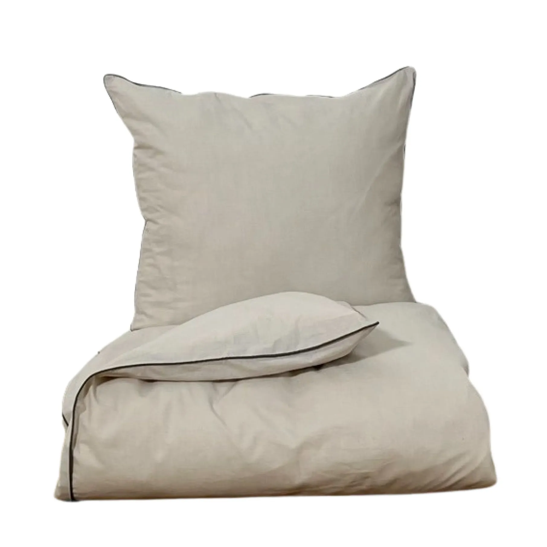 Sengetøjet er fremstillet af 100% økologisk bomuld, vævet i chambré lærredsvævning med en trådtæthed på TC 144. Denne væveteknik giver en meleret overflade og en blød, slidstærk kvalitet, som er egnet til daglig brug. Det ensfarvede design er detaljeret med en kontrastfarvet piping, der tilføjer en diskret visuel markering uden at ændre det enkle helhedsindtryk.