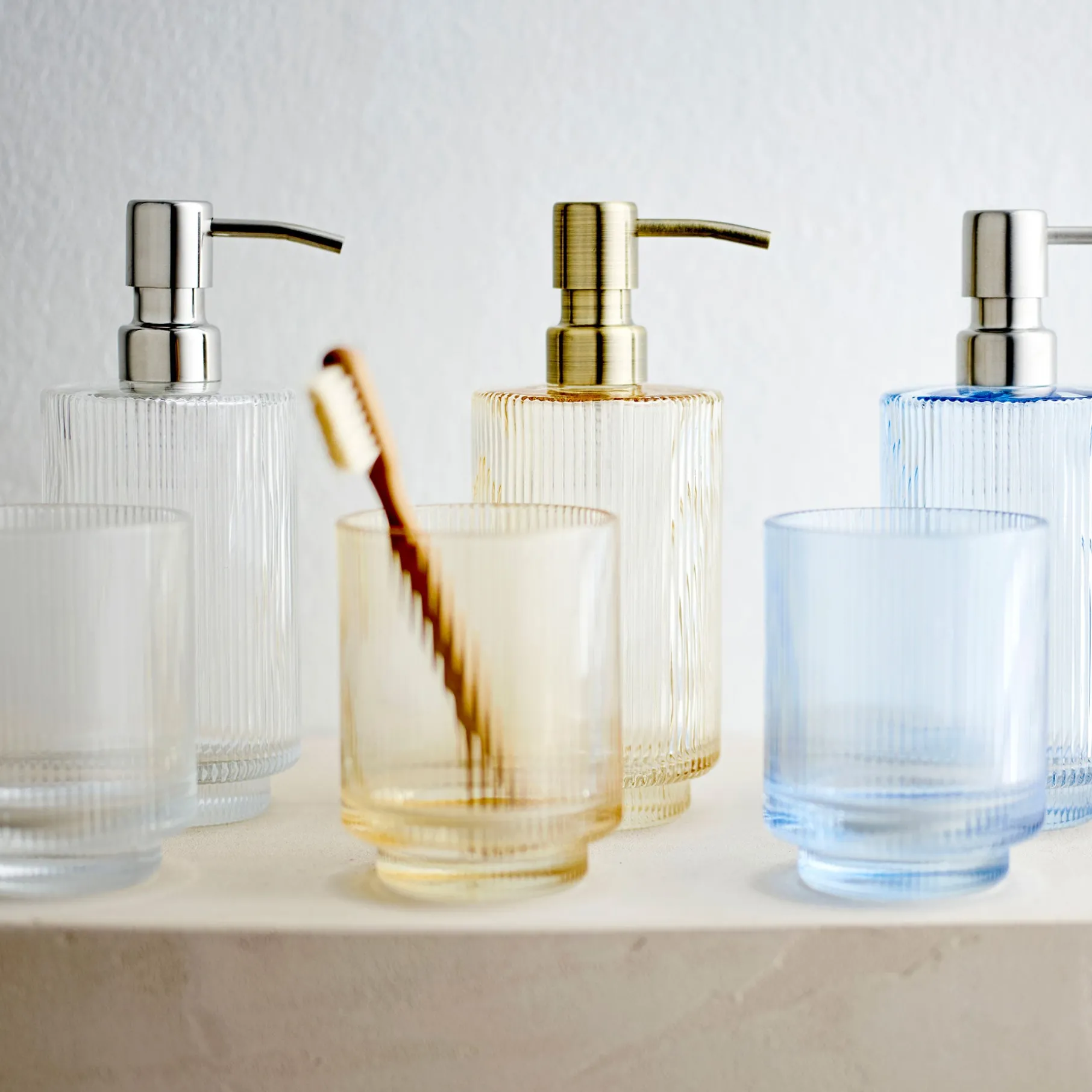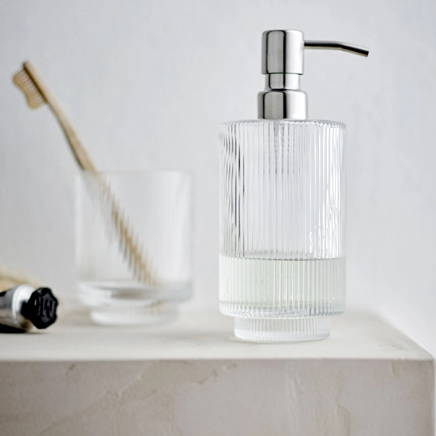 Clarity sæbedispenser er en simpel og elegant sæbedispenser, der vil passe perfekt til enhver badeværelsesindretning. Den er lavet af klart glas og har et smukt plisseret/riflet udtryk, der giver den et unikt og stilfuldt udseende.
