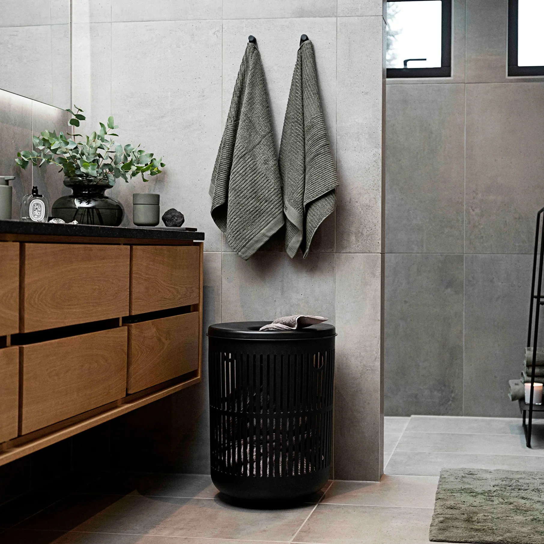Farven olive green giver en elegant og tidløs følelse til dit badeværelse.