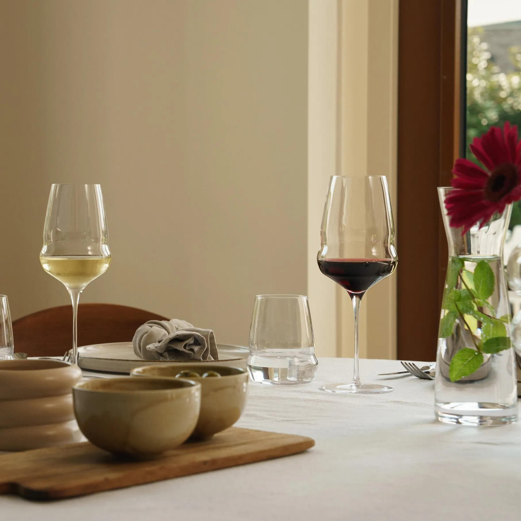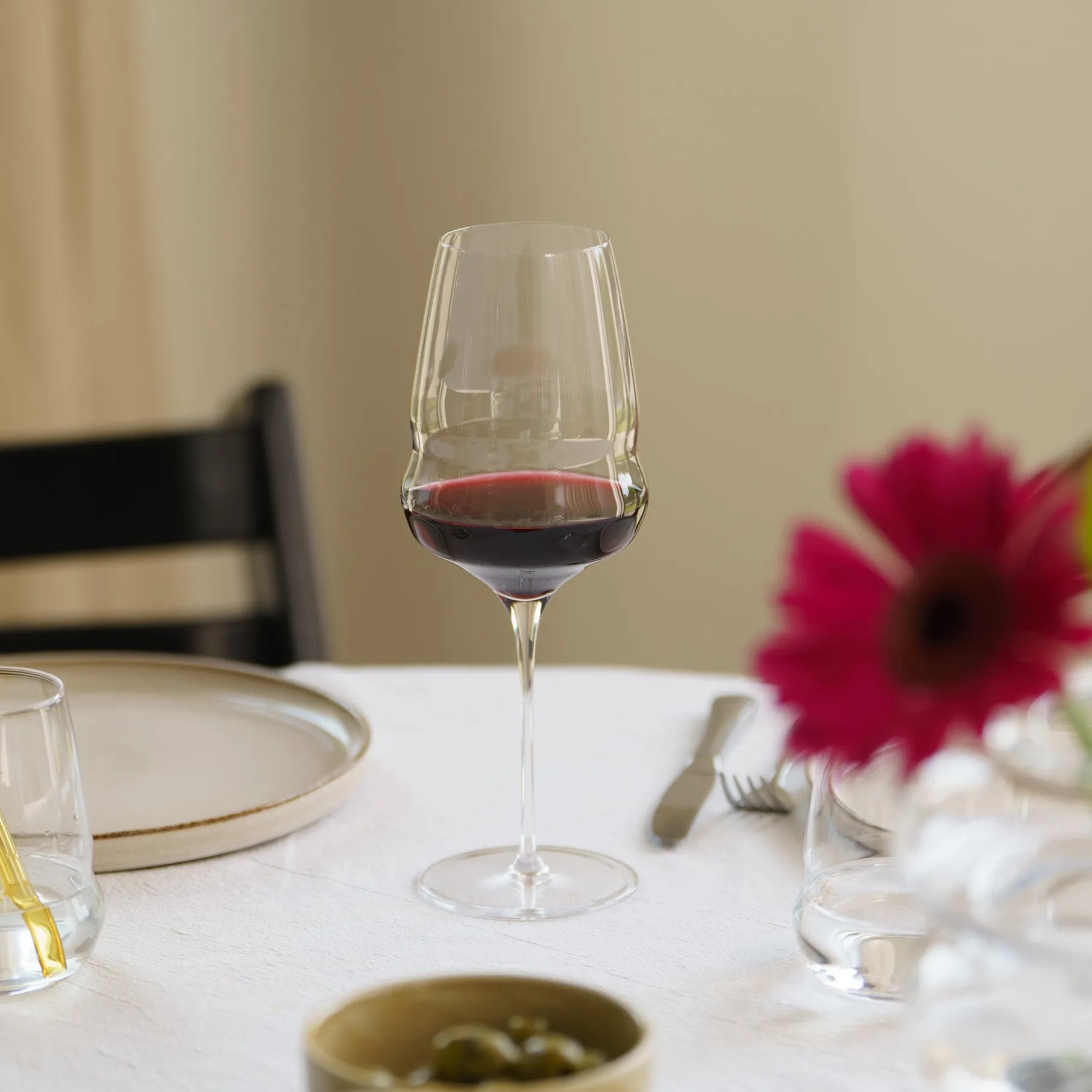 Et rødvinsglas i perfekt balance mellem funktionalitet og design. Den bløde, afrundede form følger vinens bevægelse og fremhæver aroma og smag – og løfter selv en enkel hverdagsvin til en særlig oplevelse.