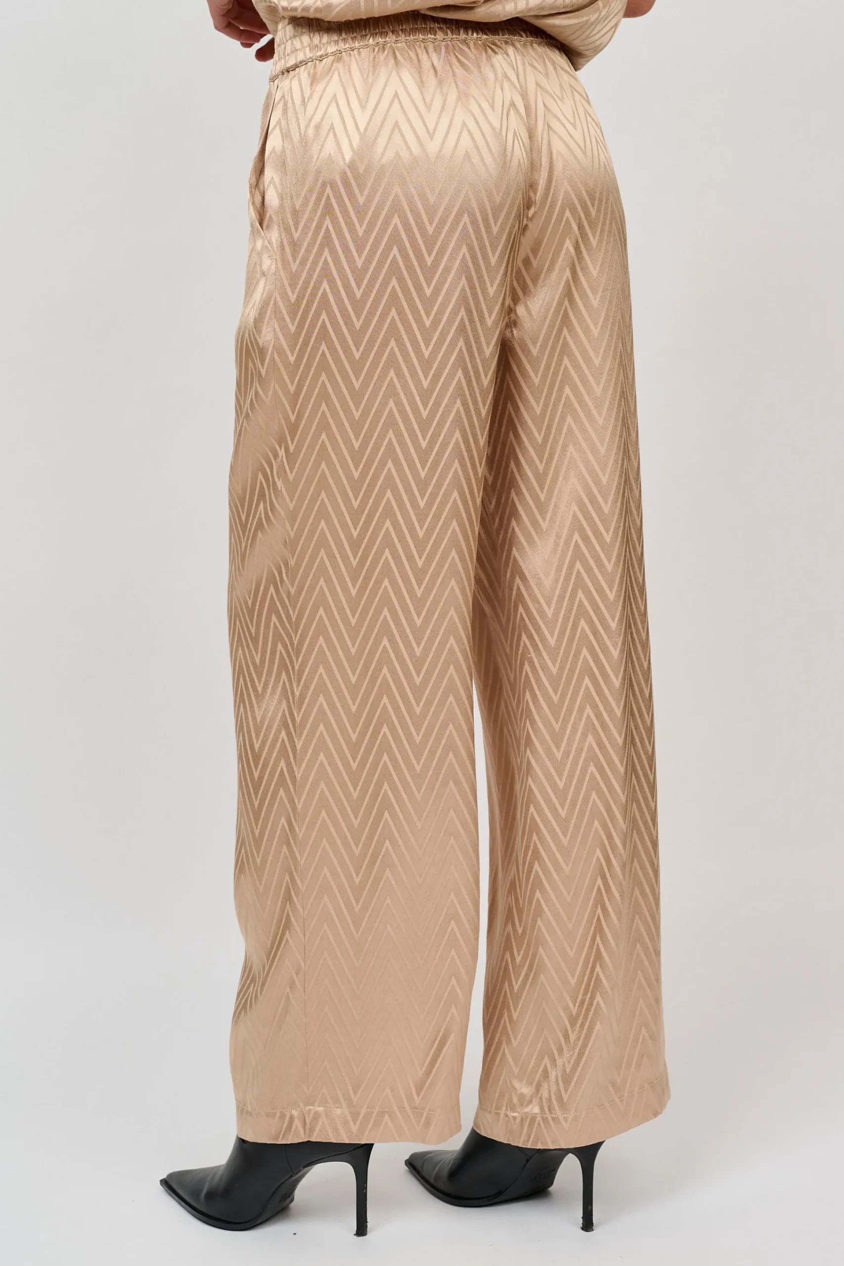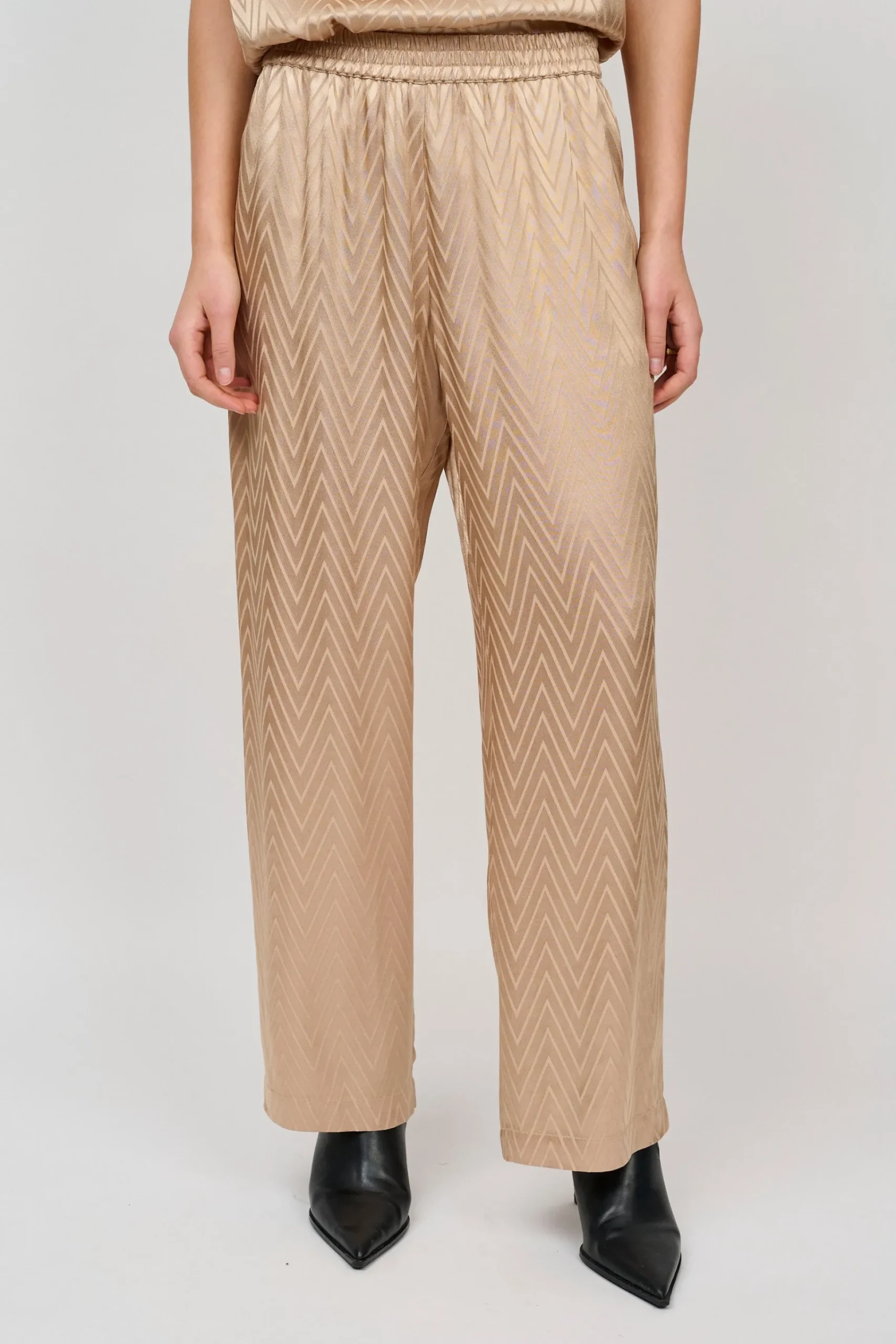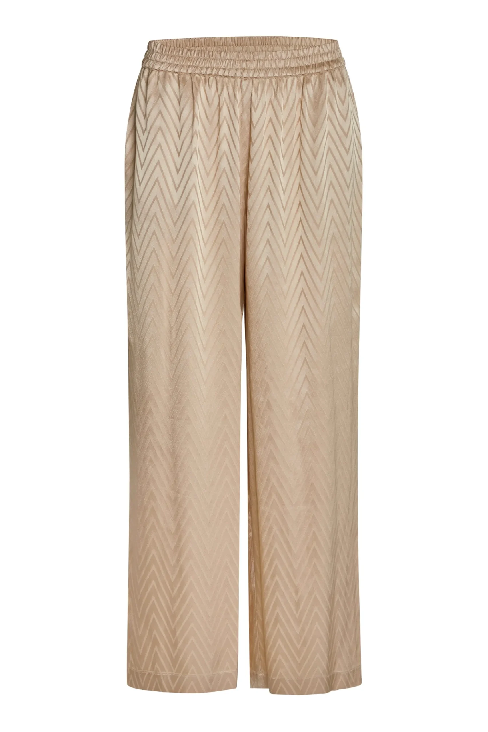 Materialet består af viskose og rayon, som er regenererede cellulosefibre. Kombinationen af de to materialer giver et eksklusivt glansfuldt look, med en fin tyngde der giver bukserne et flot fald. Viskose og rayon skaber en naturlig blødhed, er åndbart og behageligt at have på.