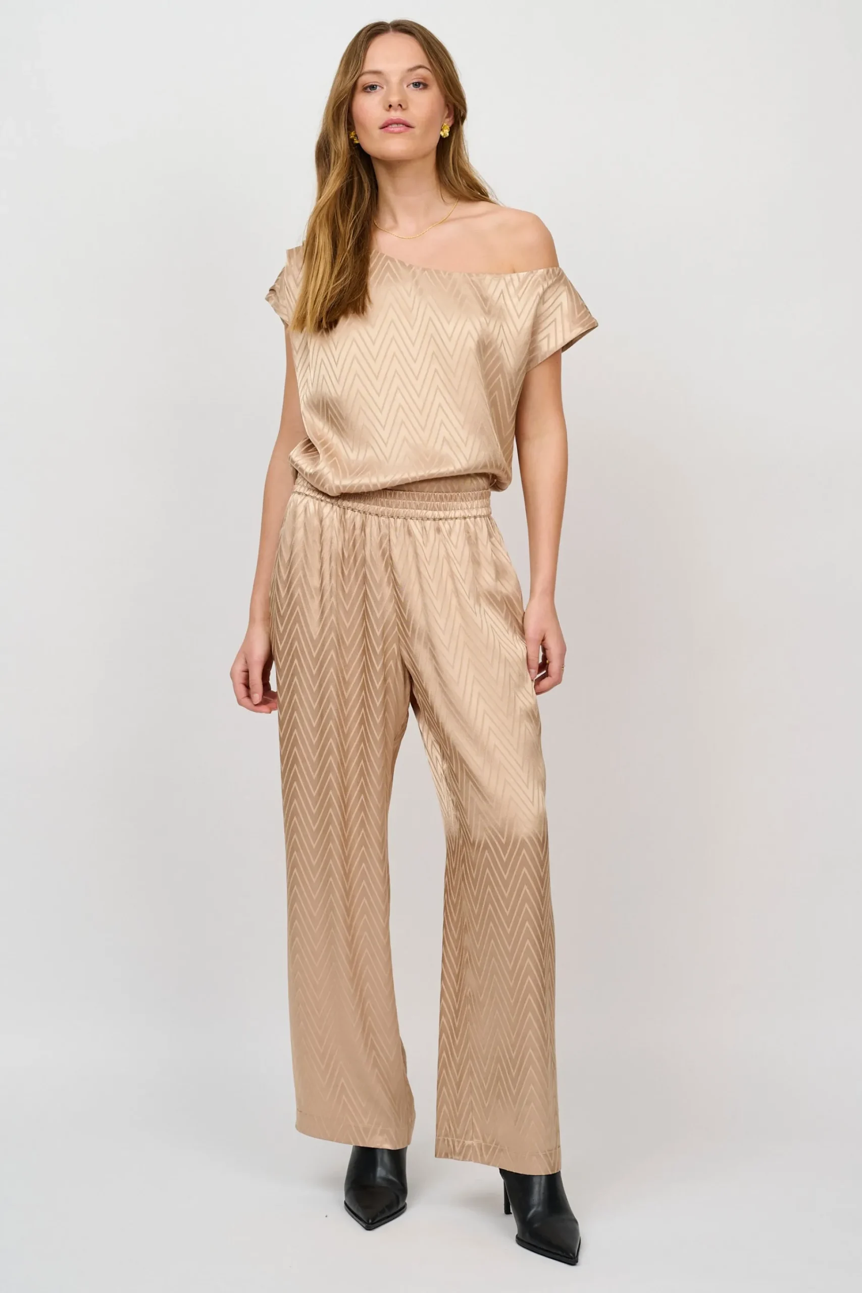 Bukserne kan styles som et sæt, med den matchende one shoulder top CRVictoria Top fra Créton, som er lavet i samme materiale.