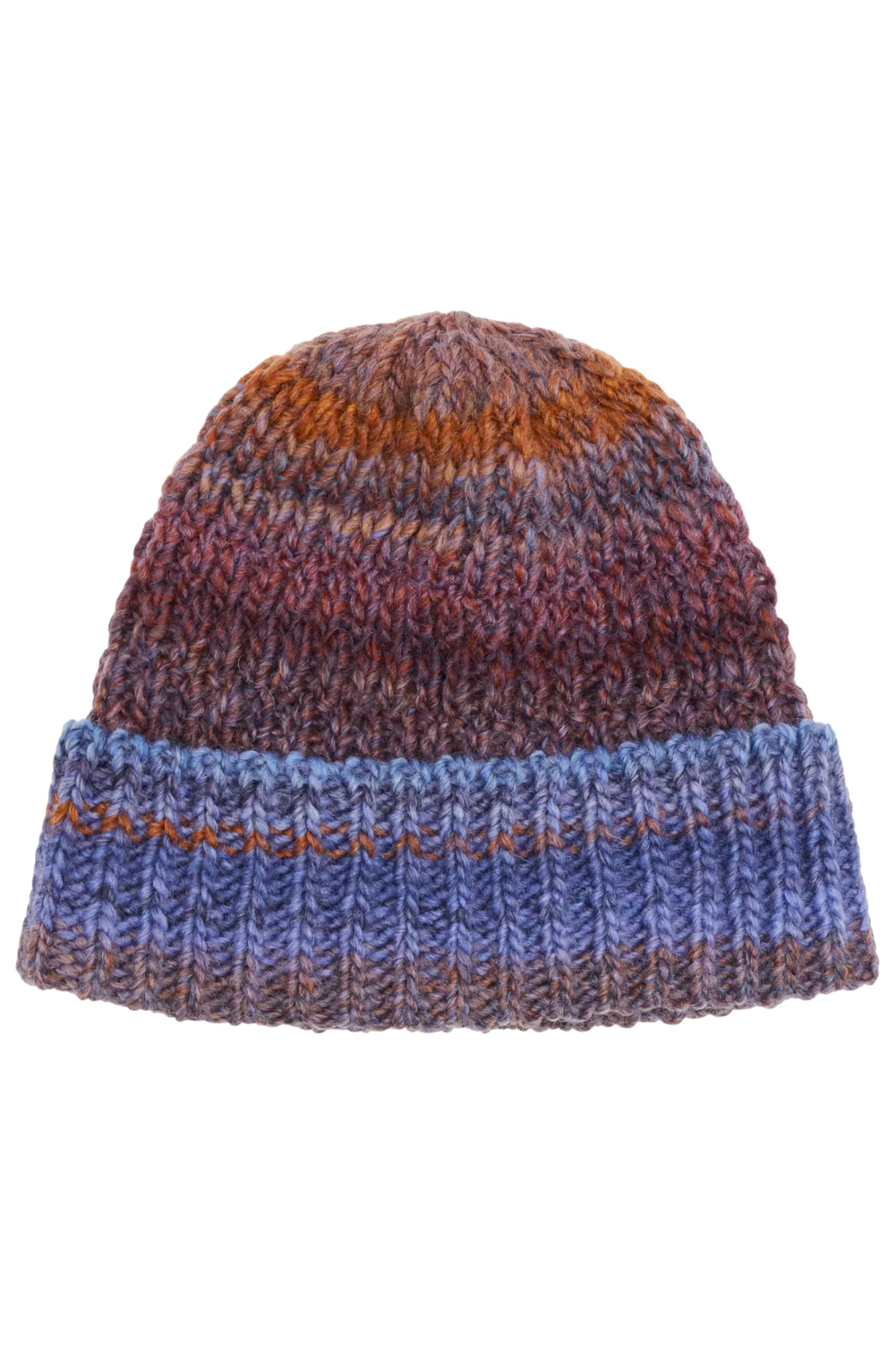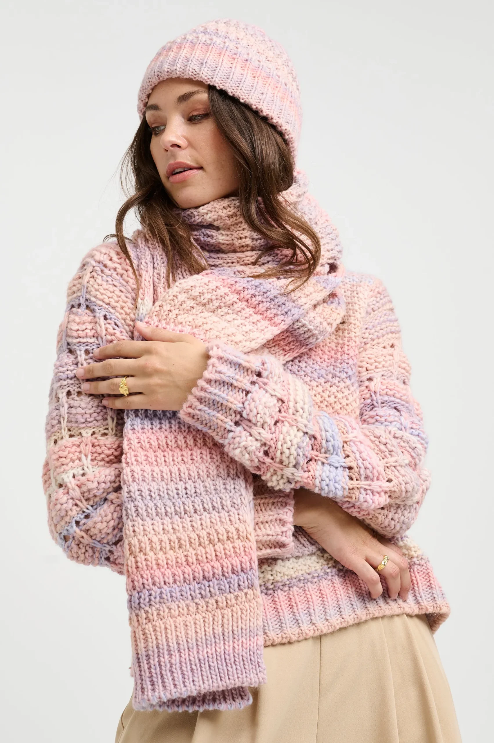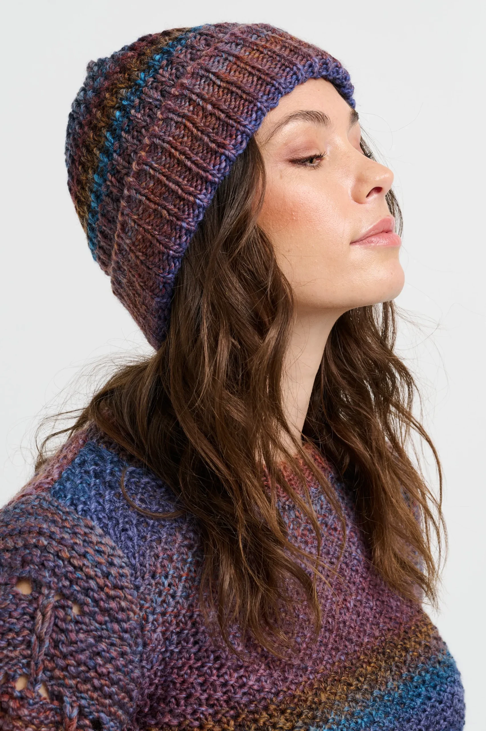 Den er lavet i en multifarvet space dye, som er en strikkemetode, hvor garnet indfarves før det bliver strikket, hvilket gør at hver hue er unik, da der aldrig vil være 2 der er helt ens.