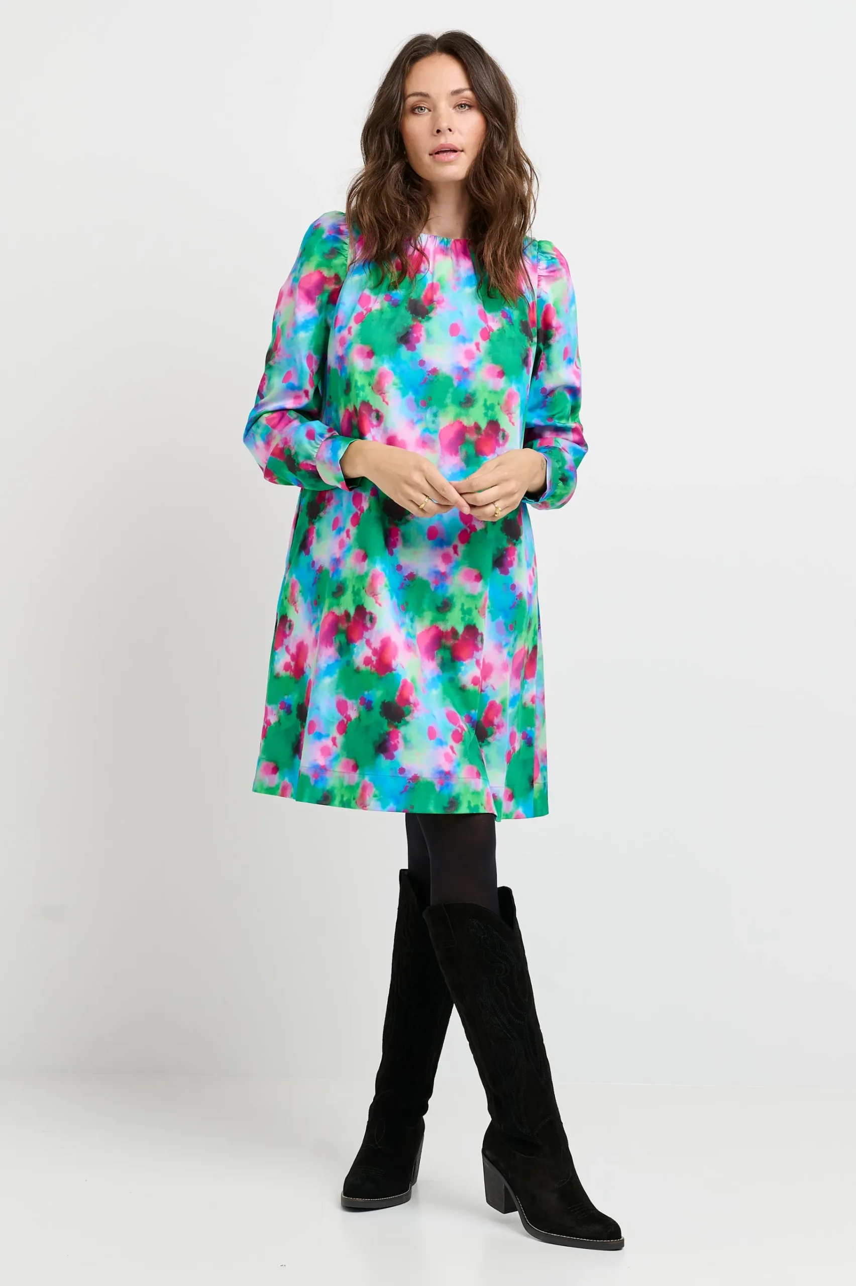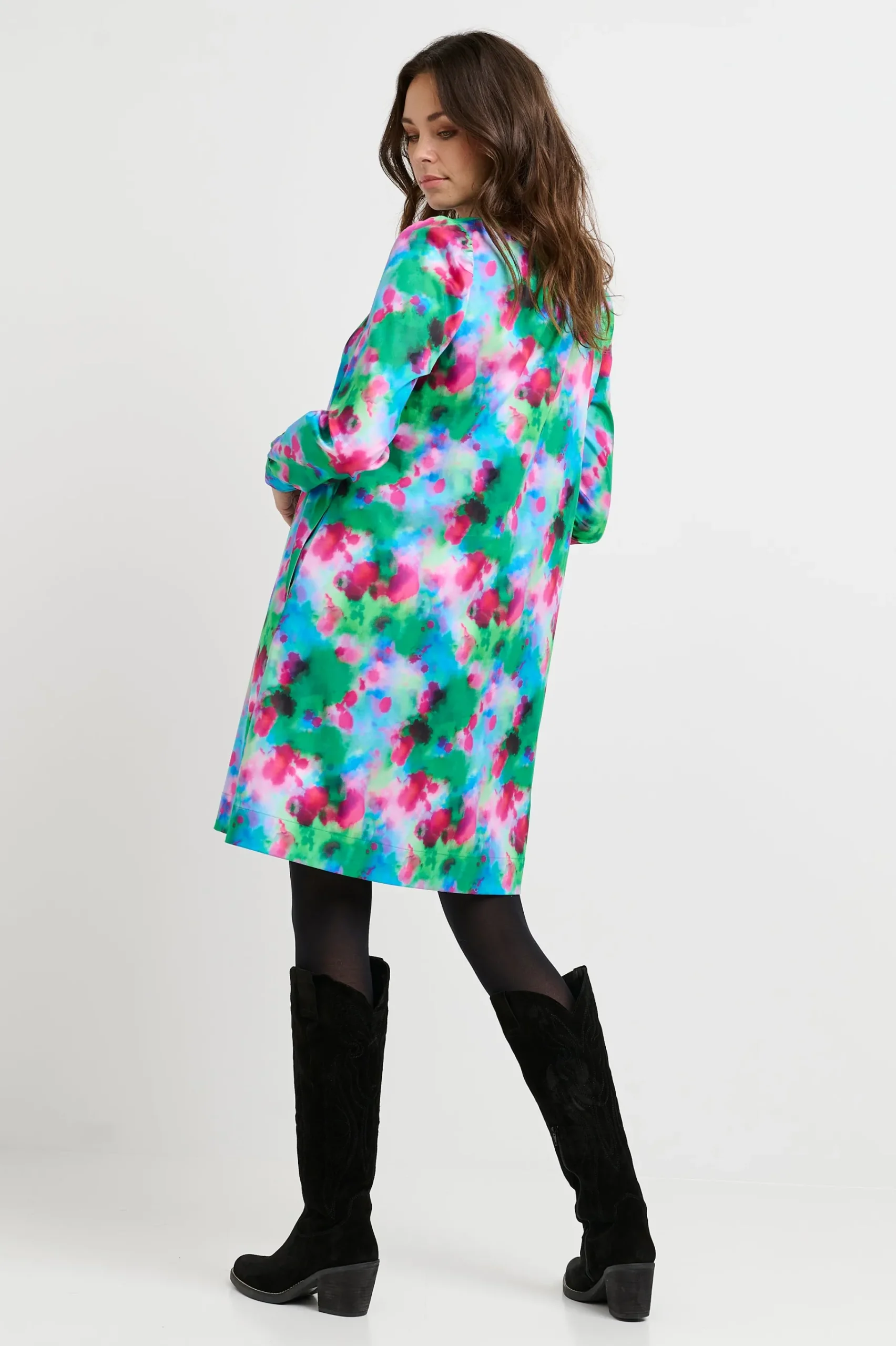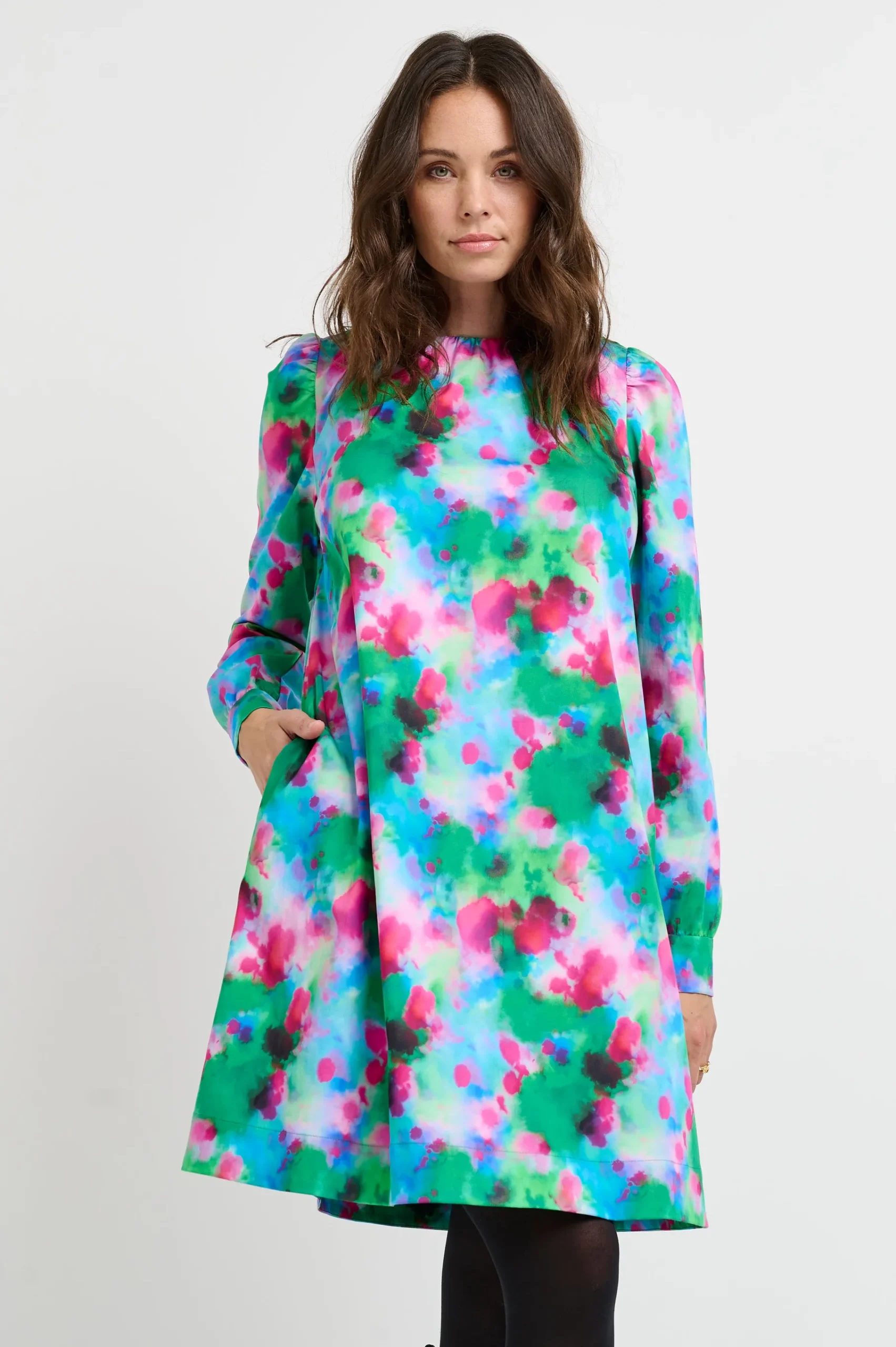 Kjolen har et farverigt print, med en vandfarve effekt hvor farverne blender roligt sammen. Farverne har de fineste pink, grønne og blå nuancer, der skaber et luksuriøst farvespil. Farverne fremstår skarpe på det fine materiale.