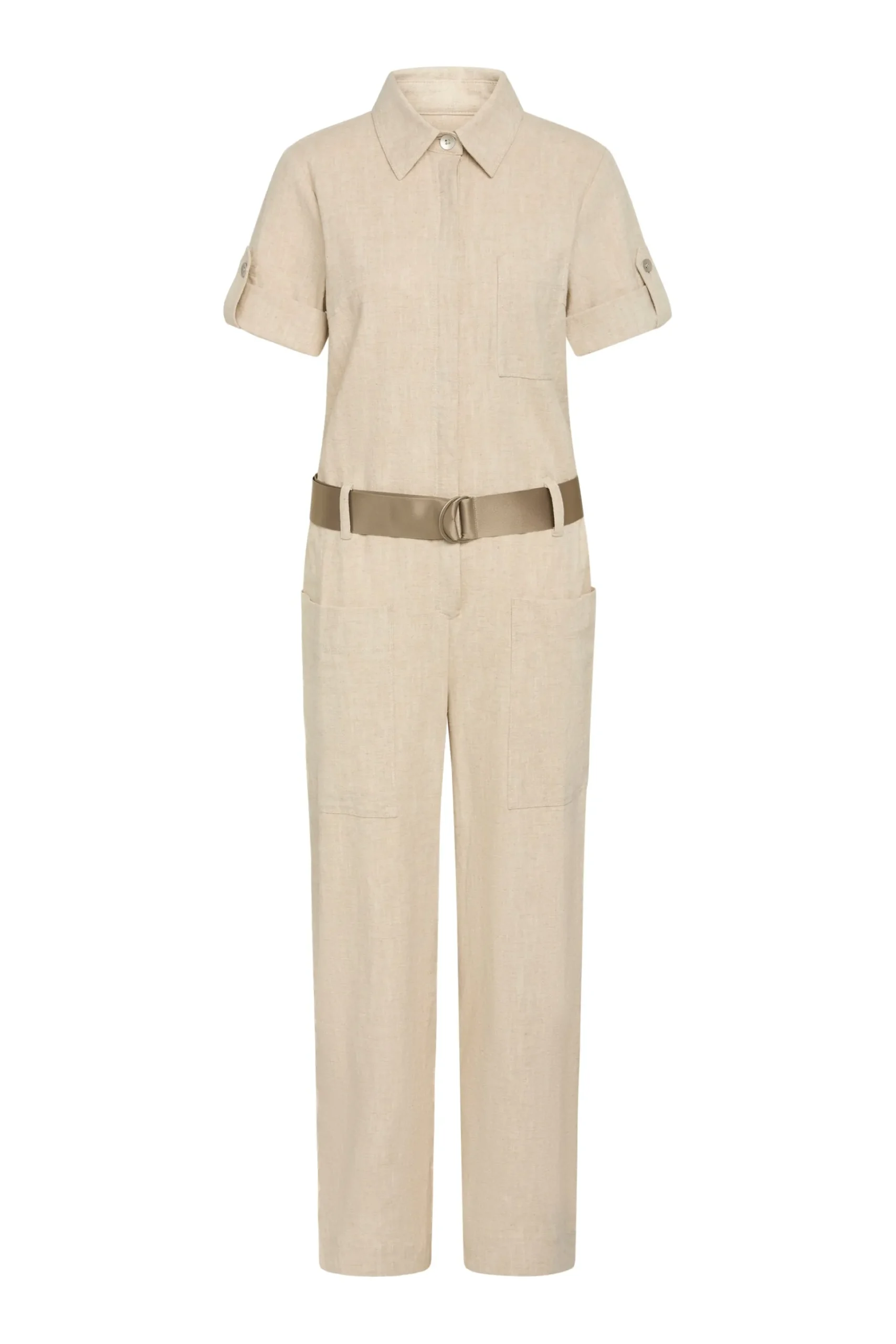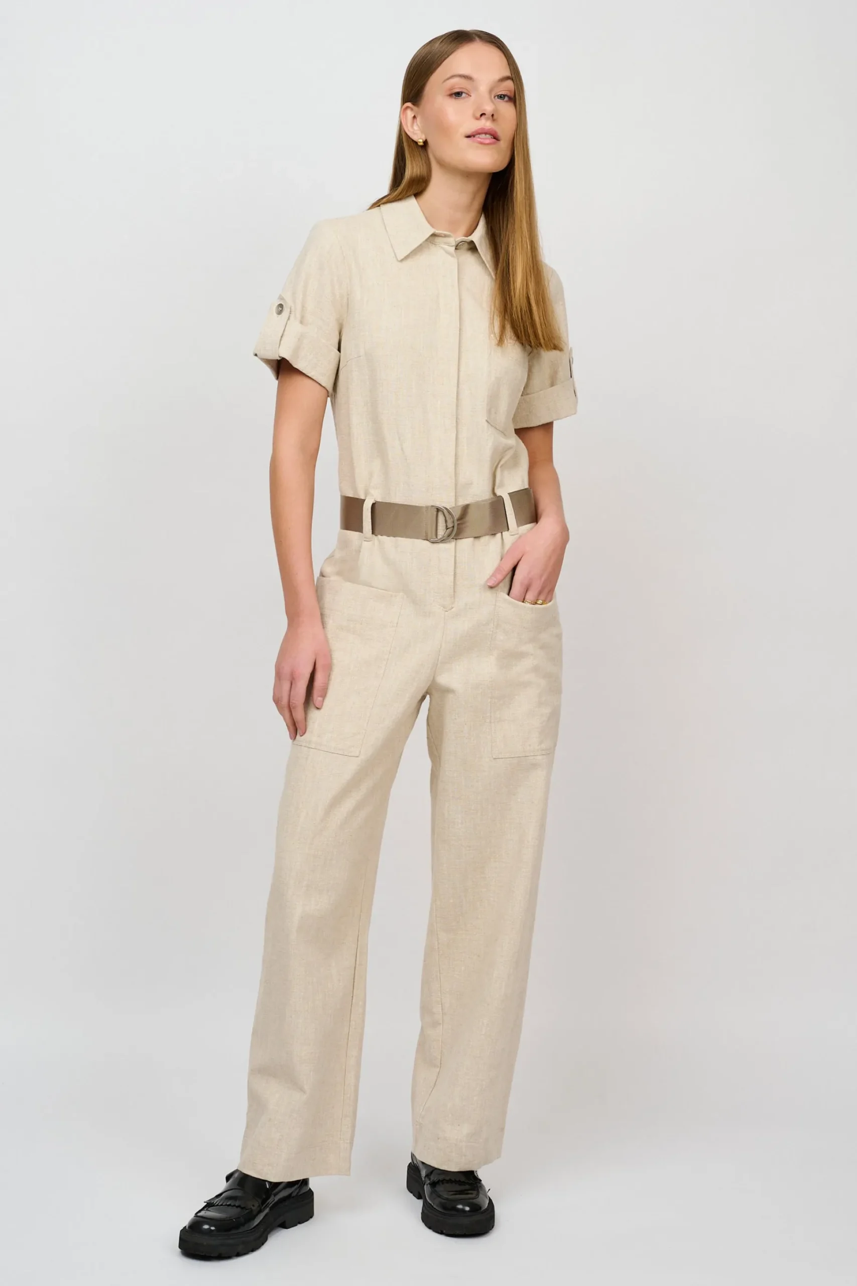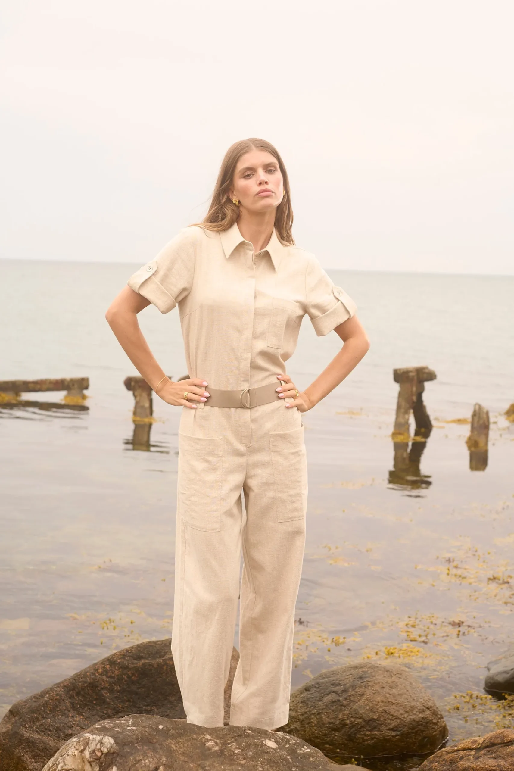 Buksedragten er lavet i en kraftig kvalitet af hør og bomuld. Materialet er blødt med en grov hørstruktur.