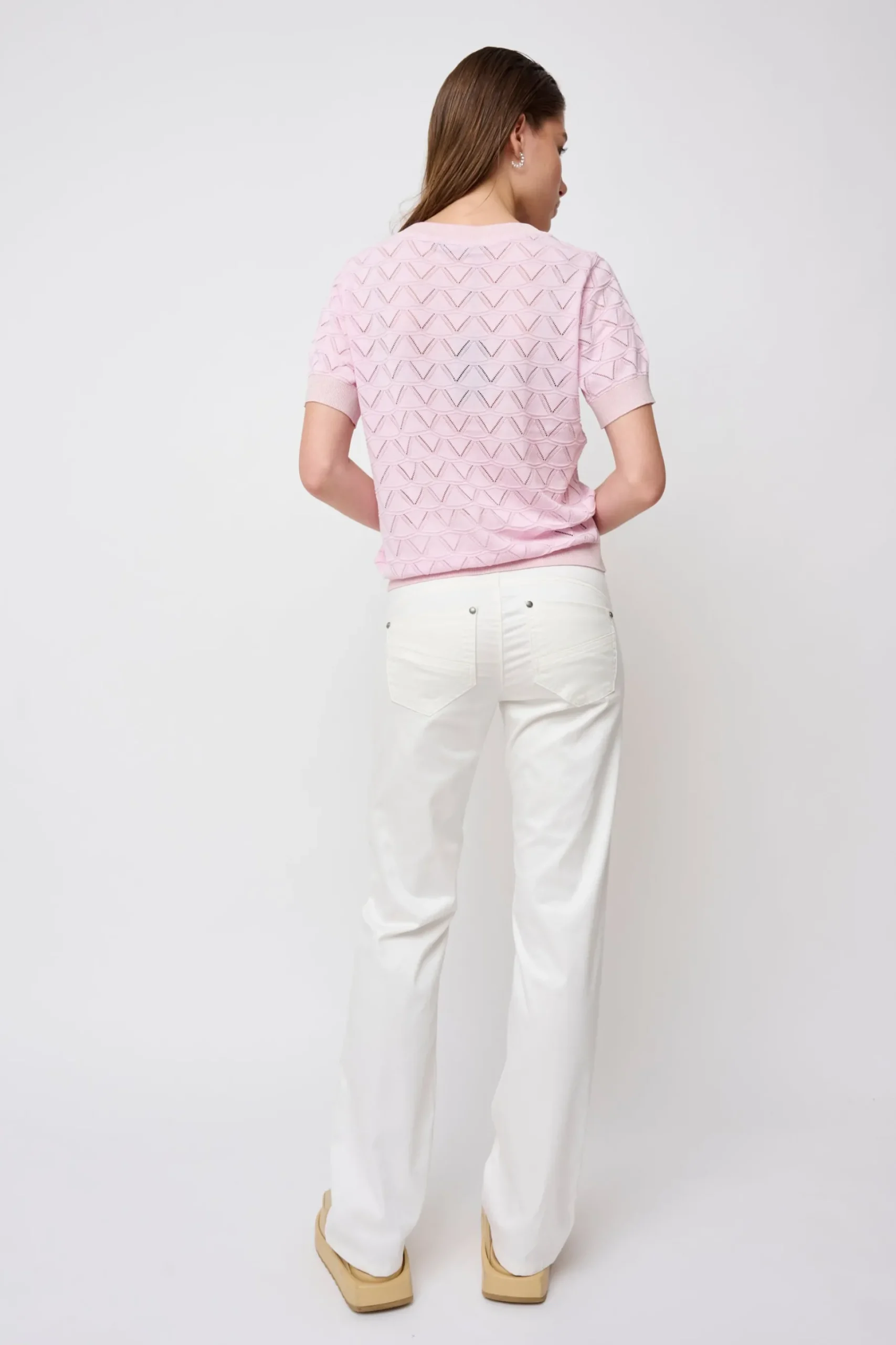 Strikket bluse med korte ærmer og lurex effekt/glimmer på alle rib kanter.