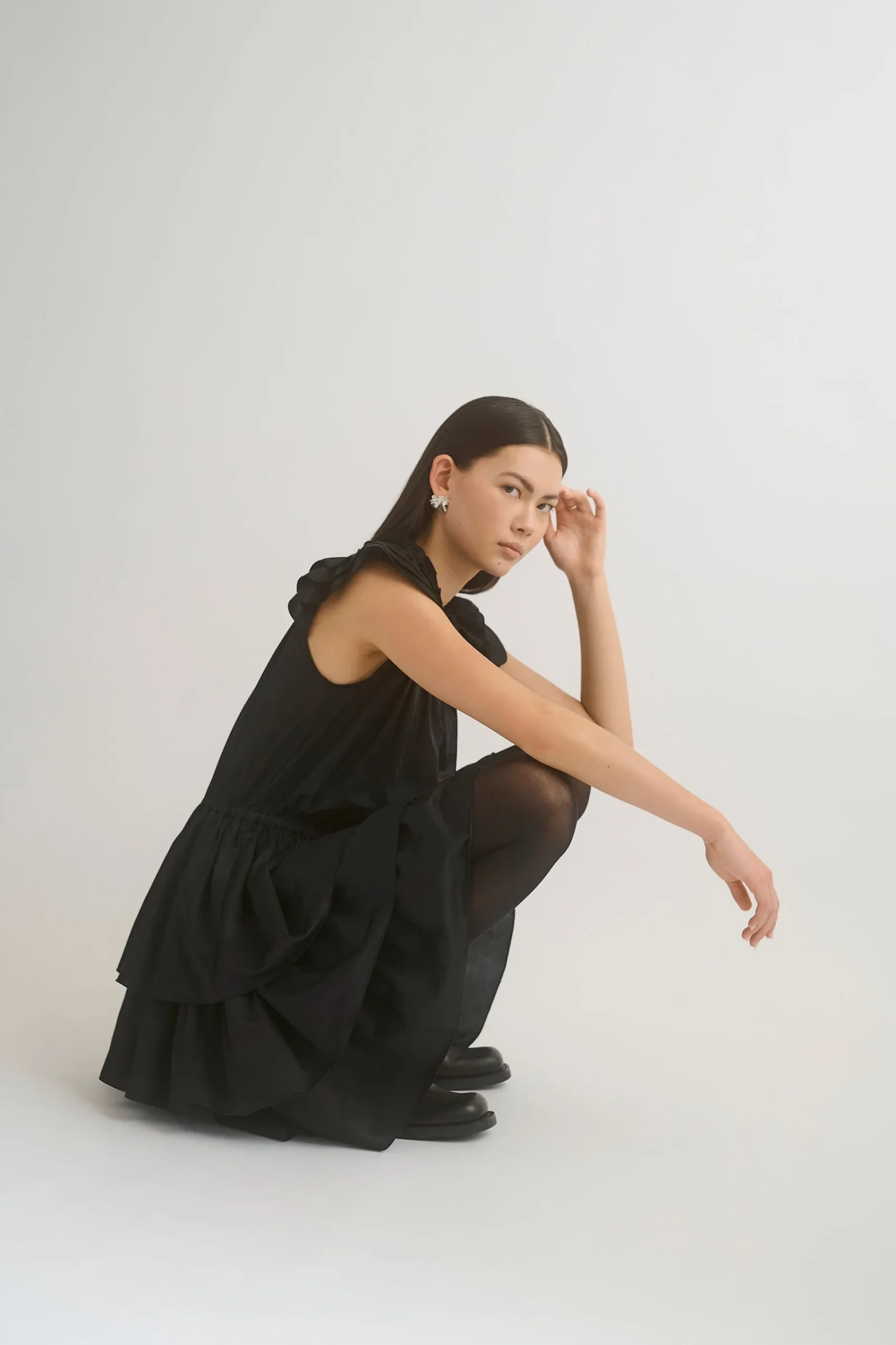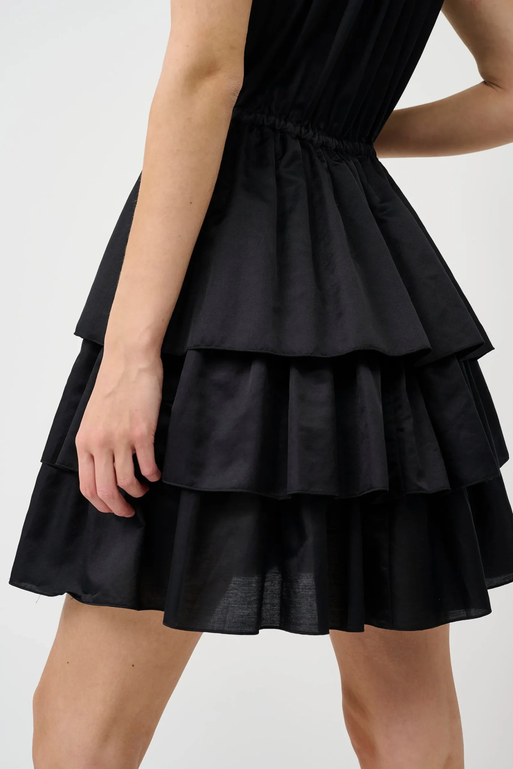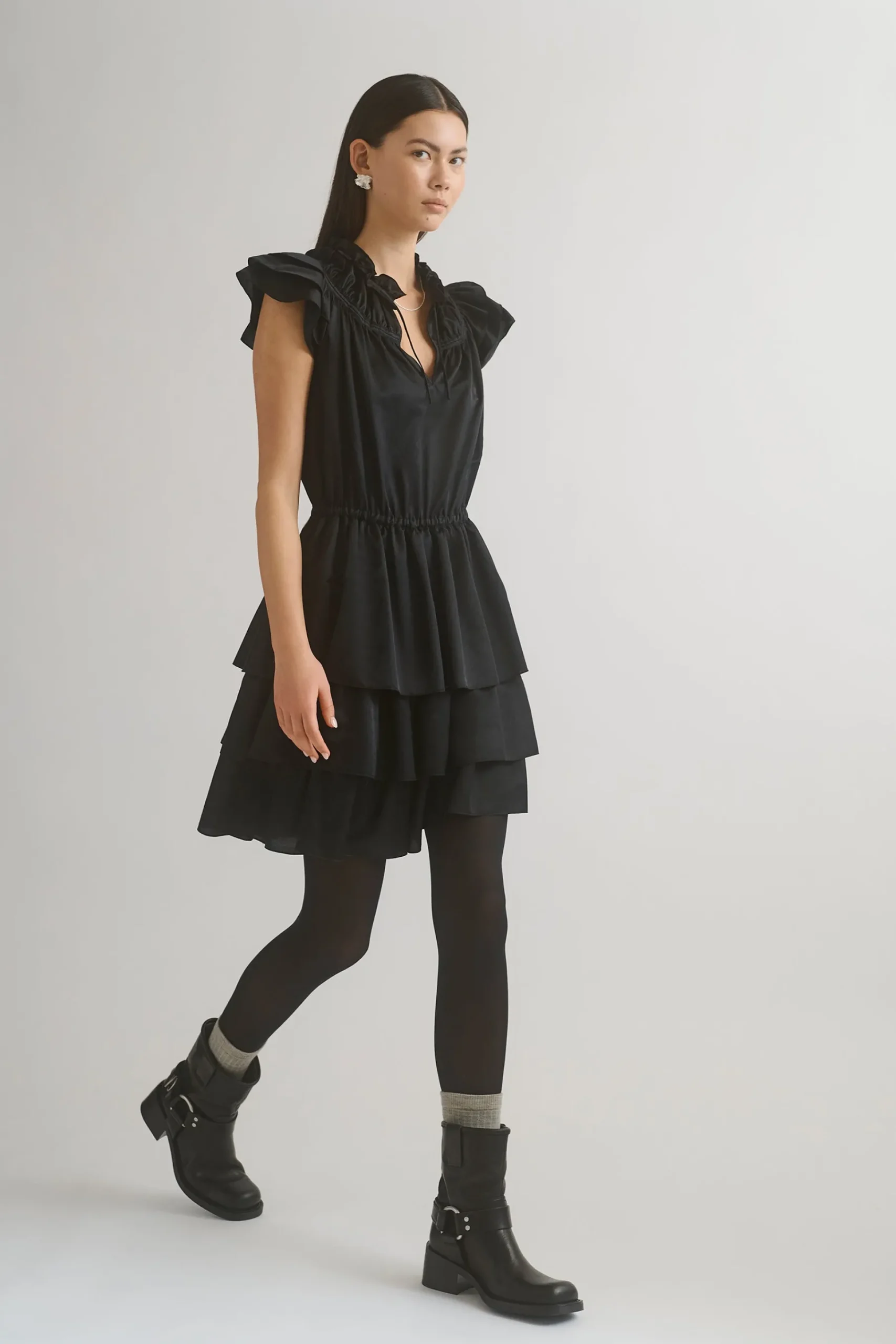 Kjolen er en feminin kjole med mange flæsedetaljer, som kan styles med en rullekrave indenunder til de køligere tider.