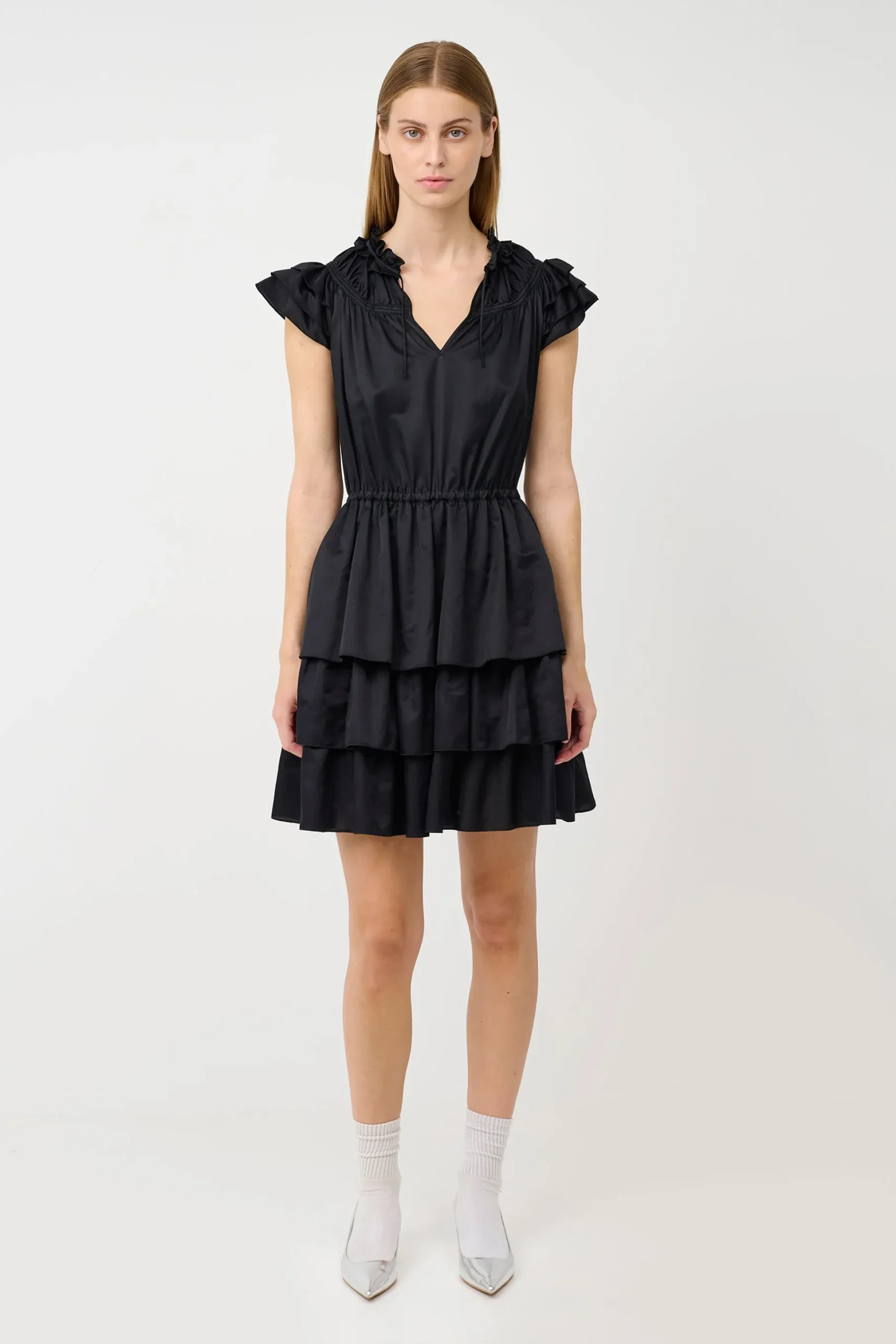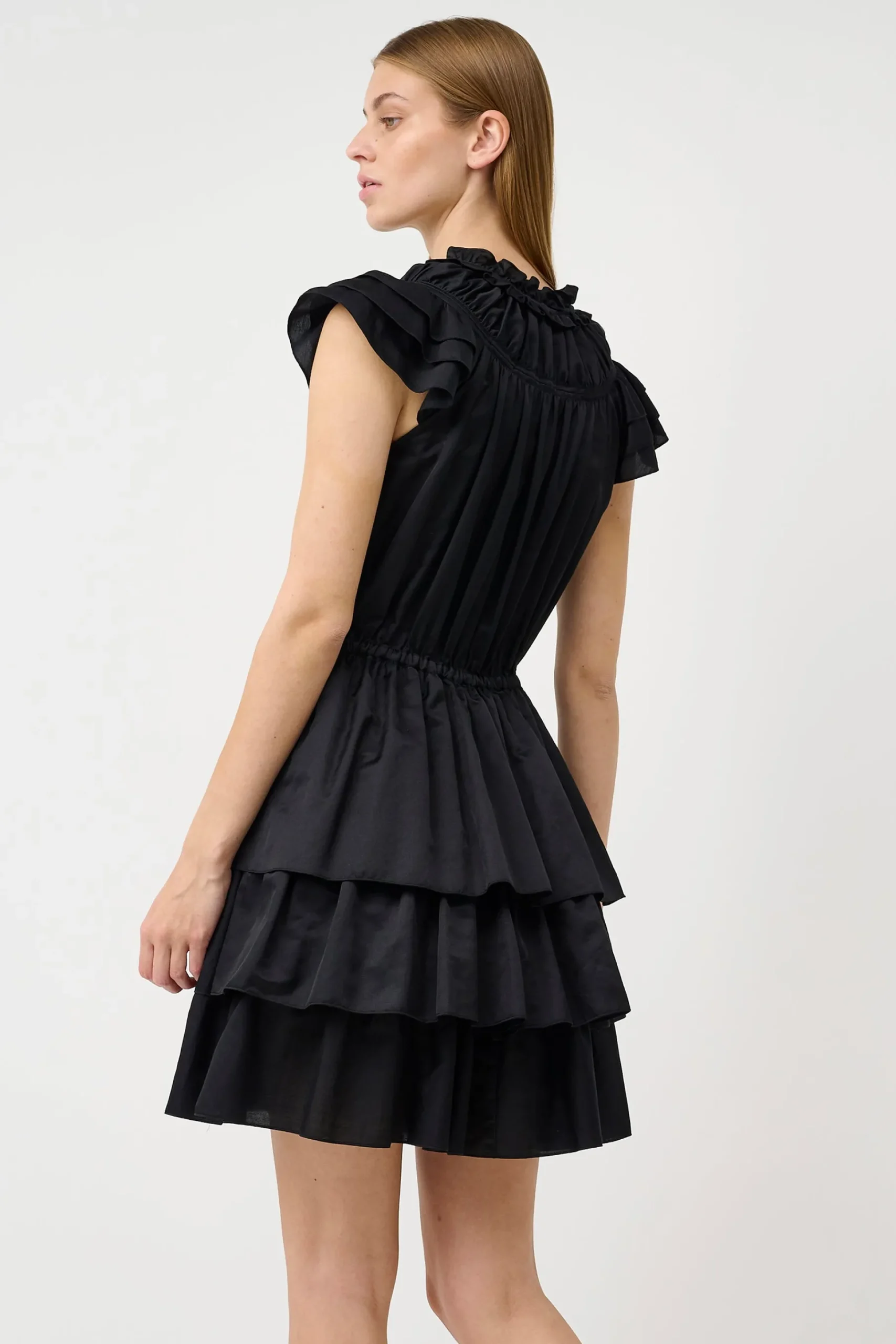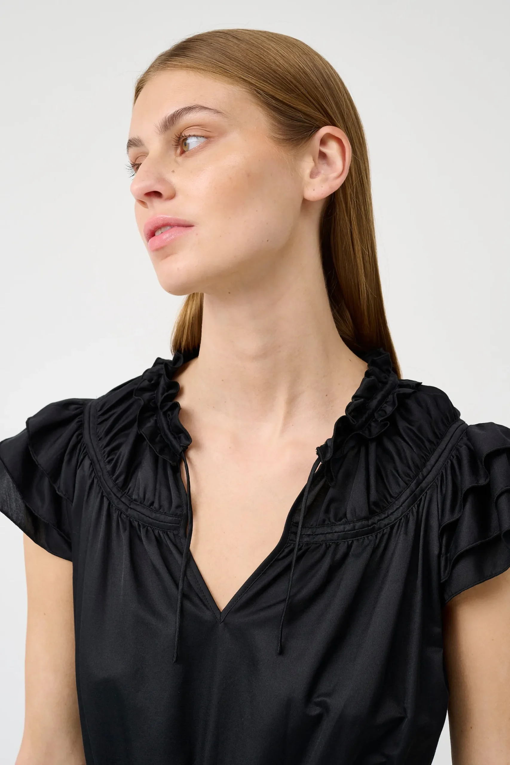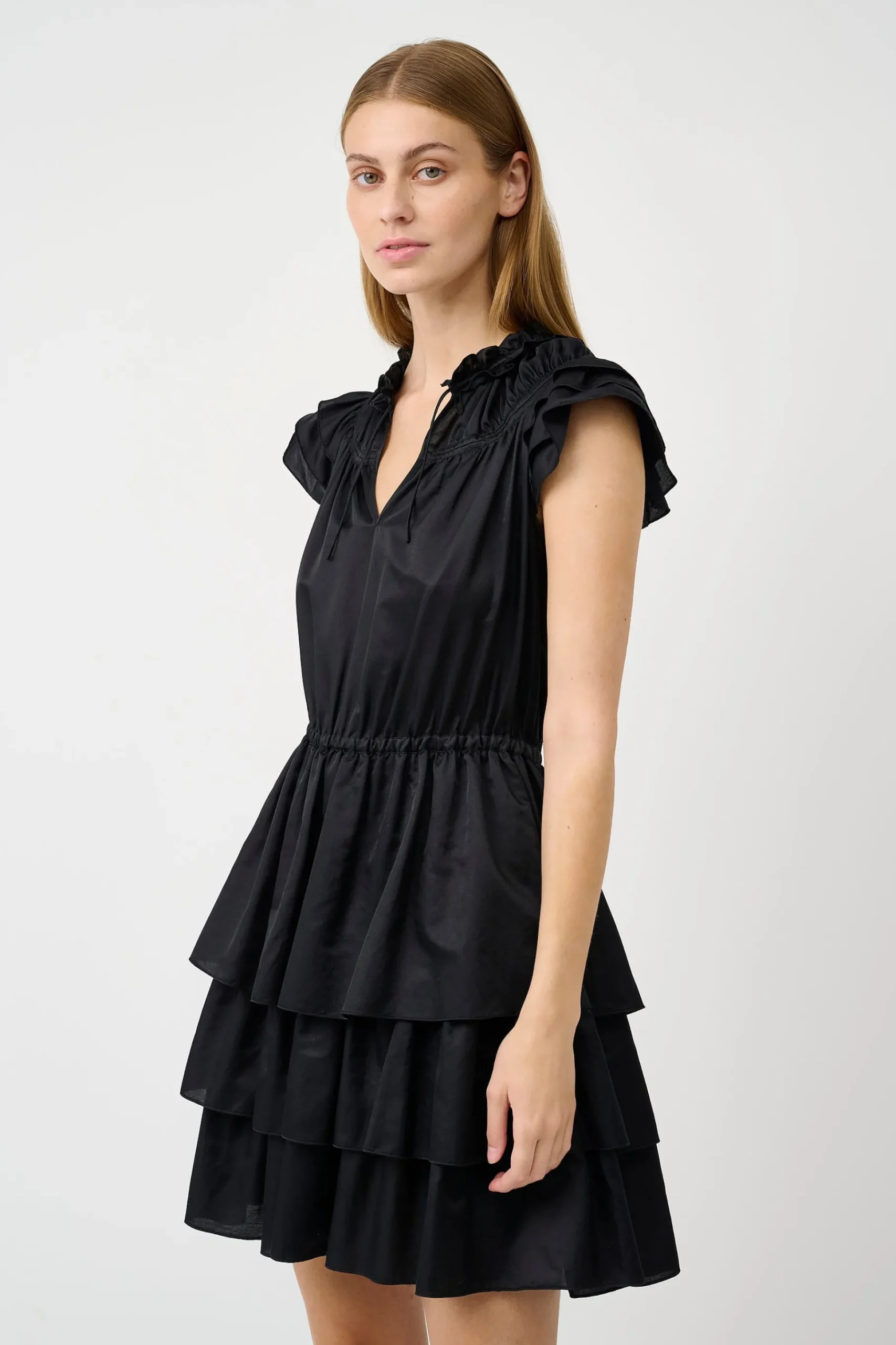 Kjolen er en feminin kjole med mange flæsedetaljer, som kan styles med en rullekrave indenunder til de køligere tider.