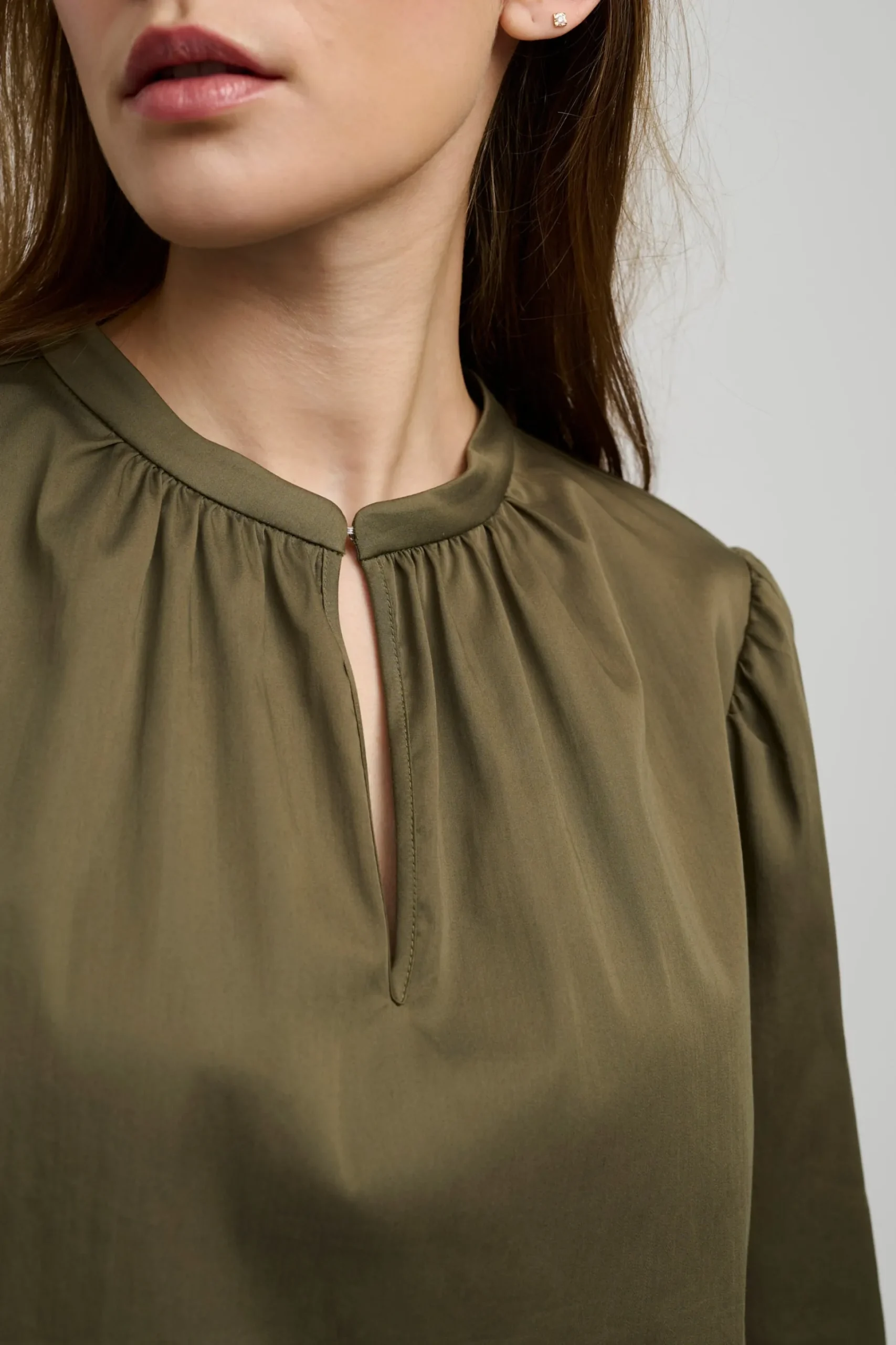 Blusen er lavet i en let metervare af høj kvalitet. Metervaren består af bomuld og nylon, hvilket giver den et eksklusivt let shiny look. Der er 3% spandex i metervaren, hvilket gør den en smule strækbar og dermed utrolig behagelig at have på.