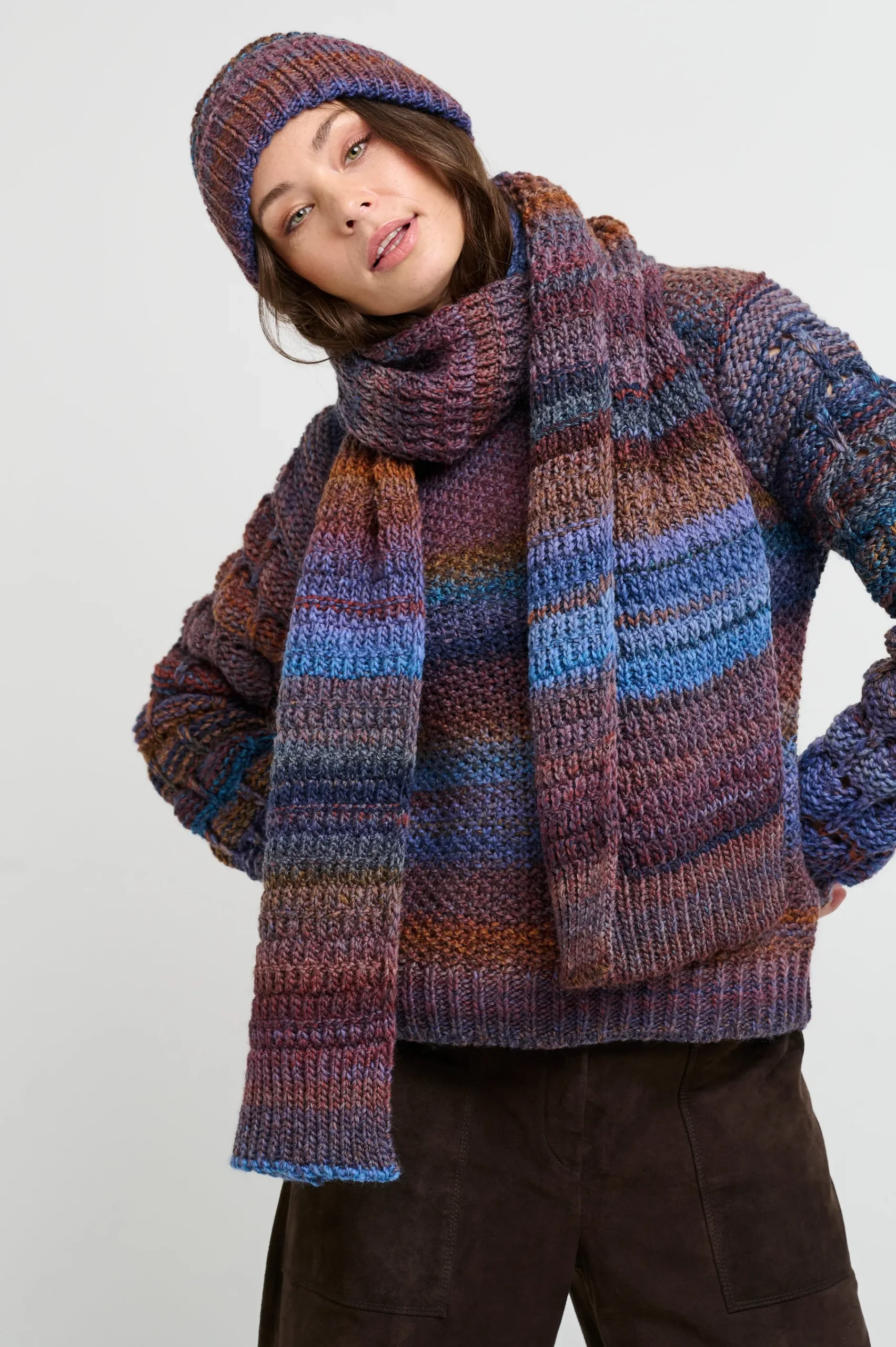 Den er lavet i en multifarvet space dye, som er en strikkemetode, hvor garnet indfarves før det bliver strikket, hvilket gør at hver hue er unik, da der aldrig vil være 2 der er helt ens.