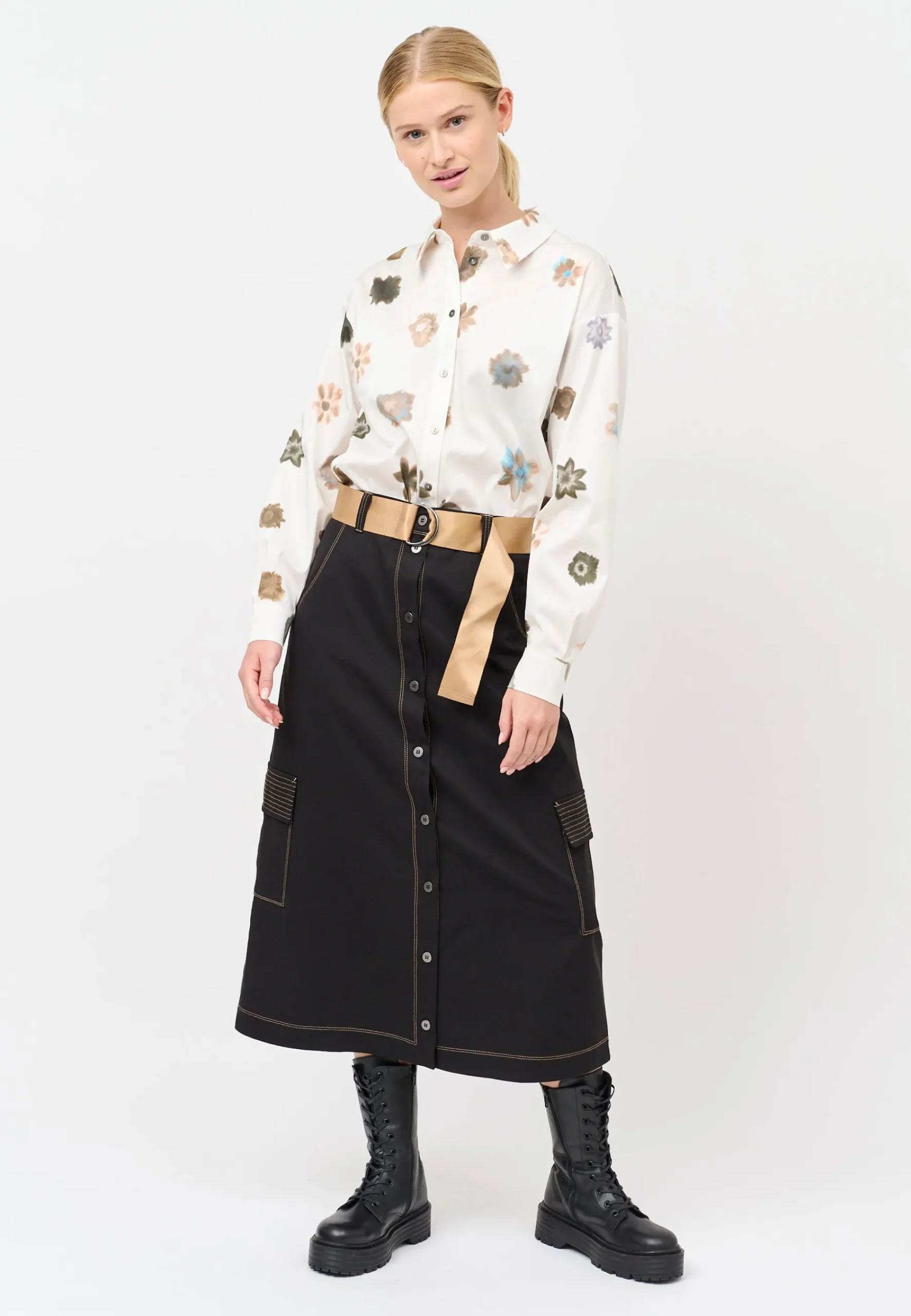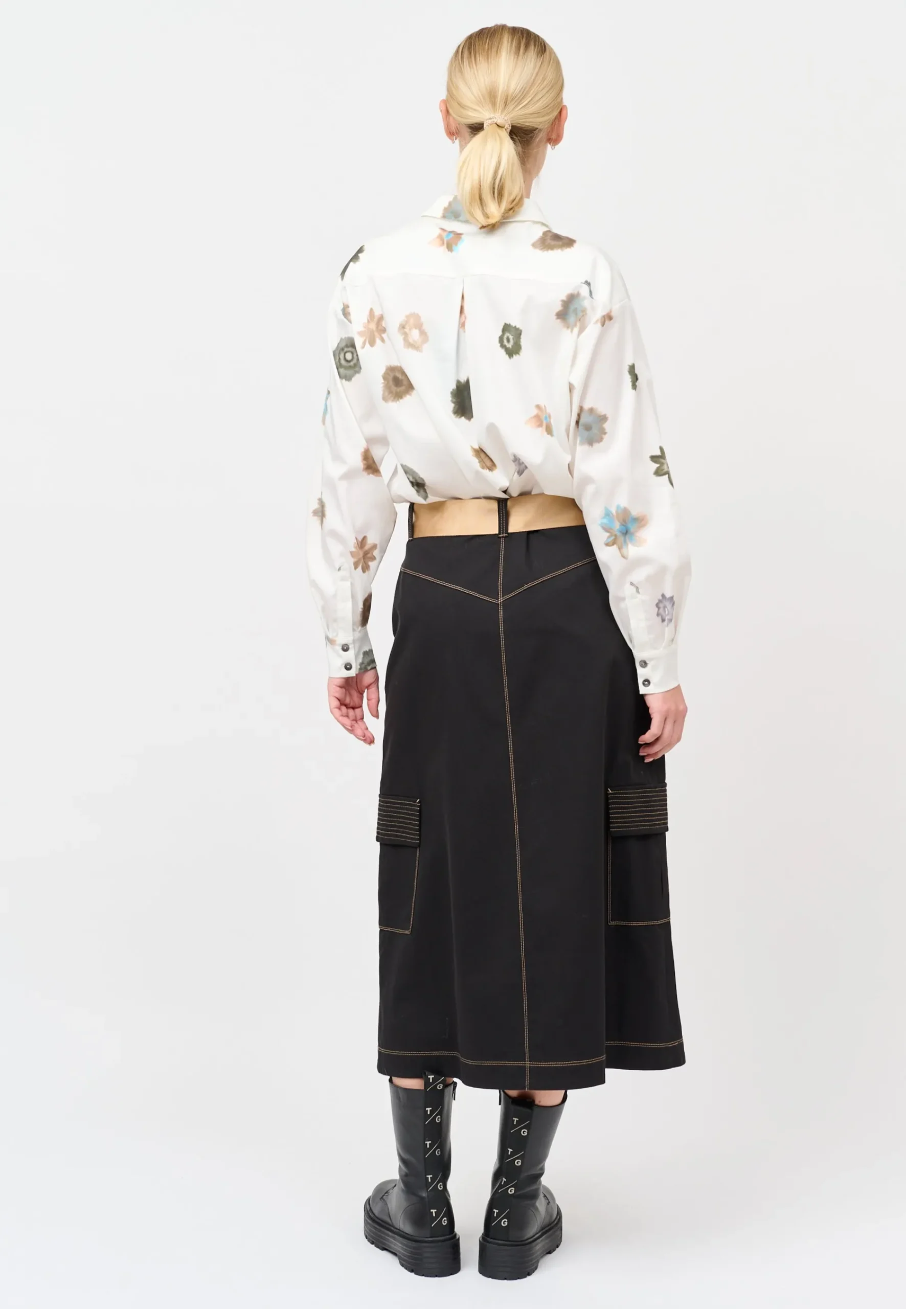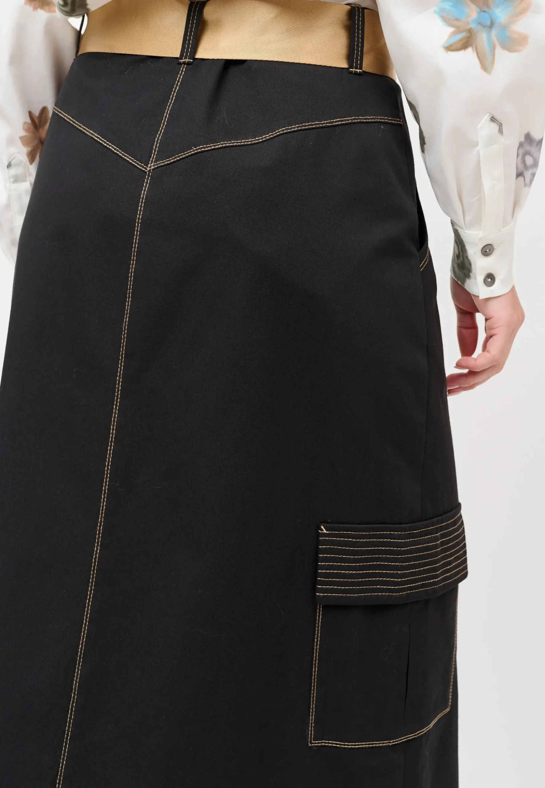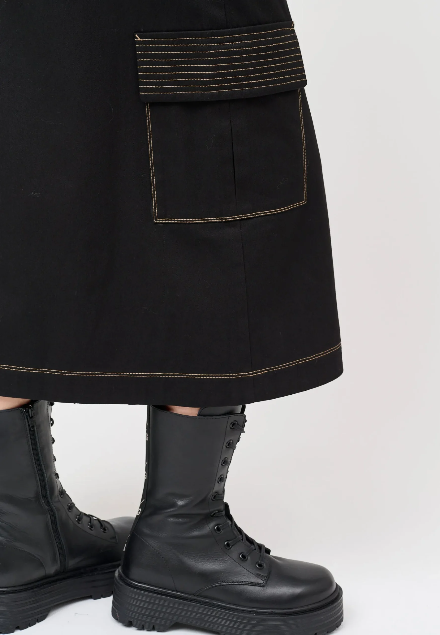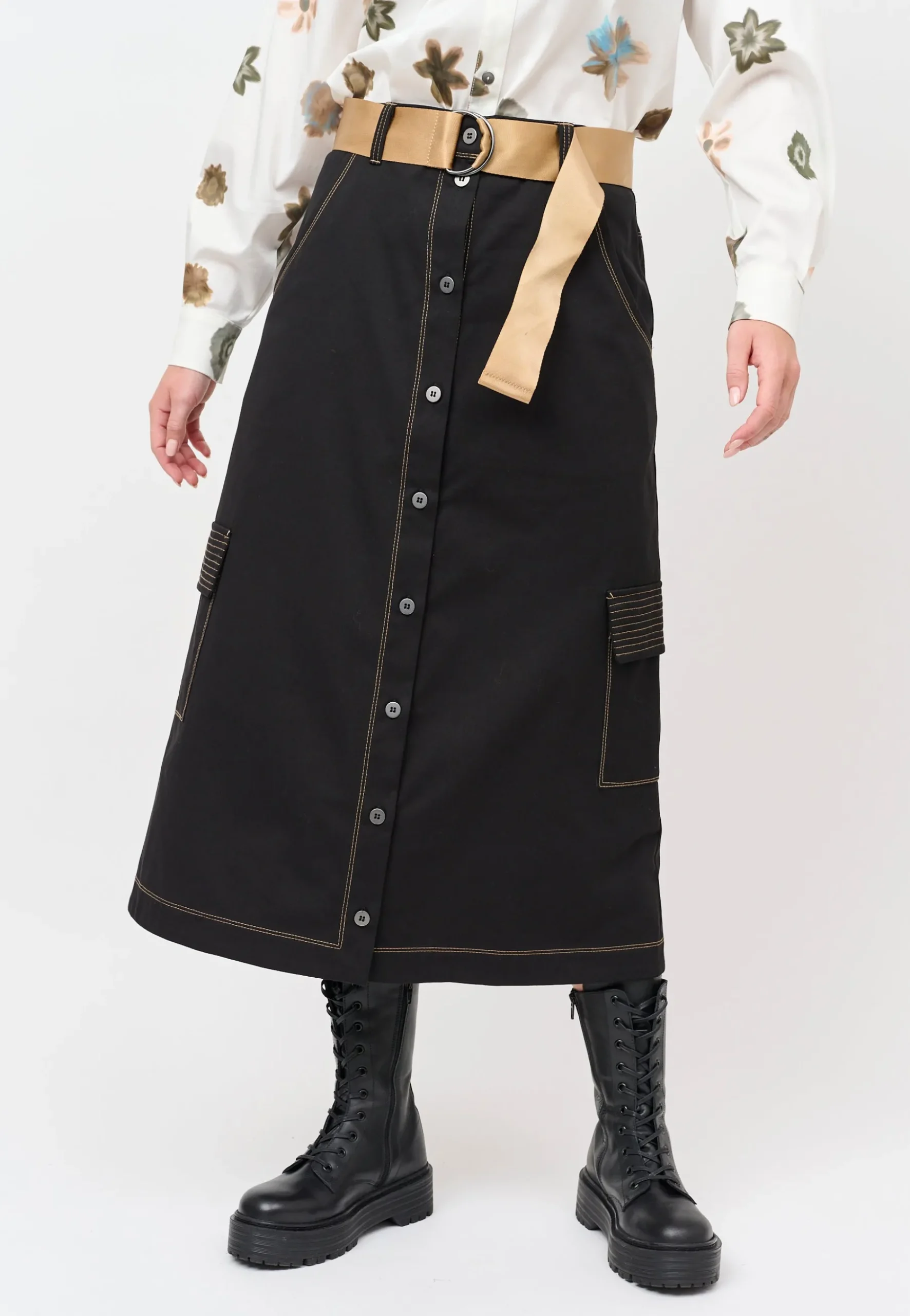 Militær inspireret nederdel med lommer, kontrast farvede stikninger og aftageligt bælte