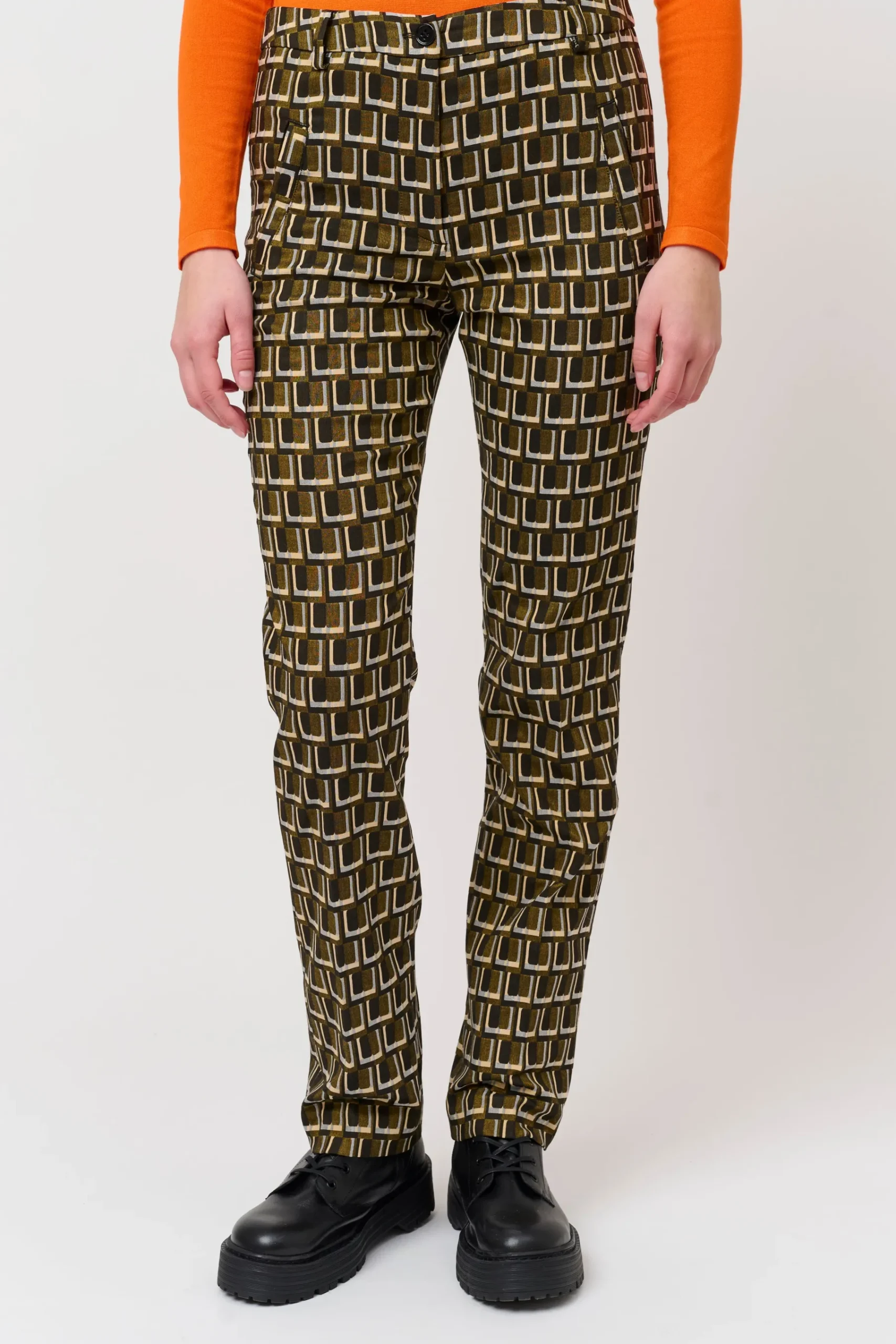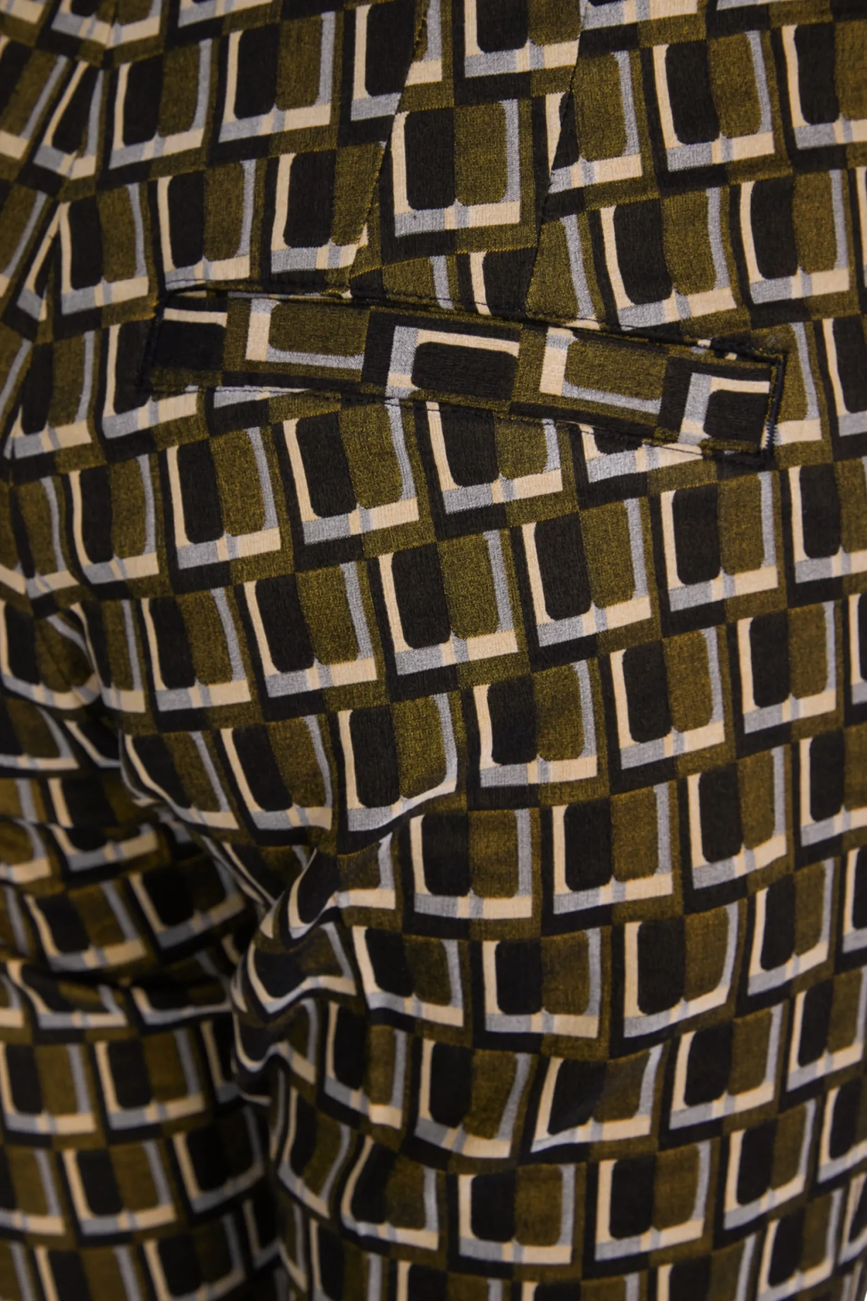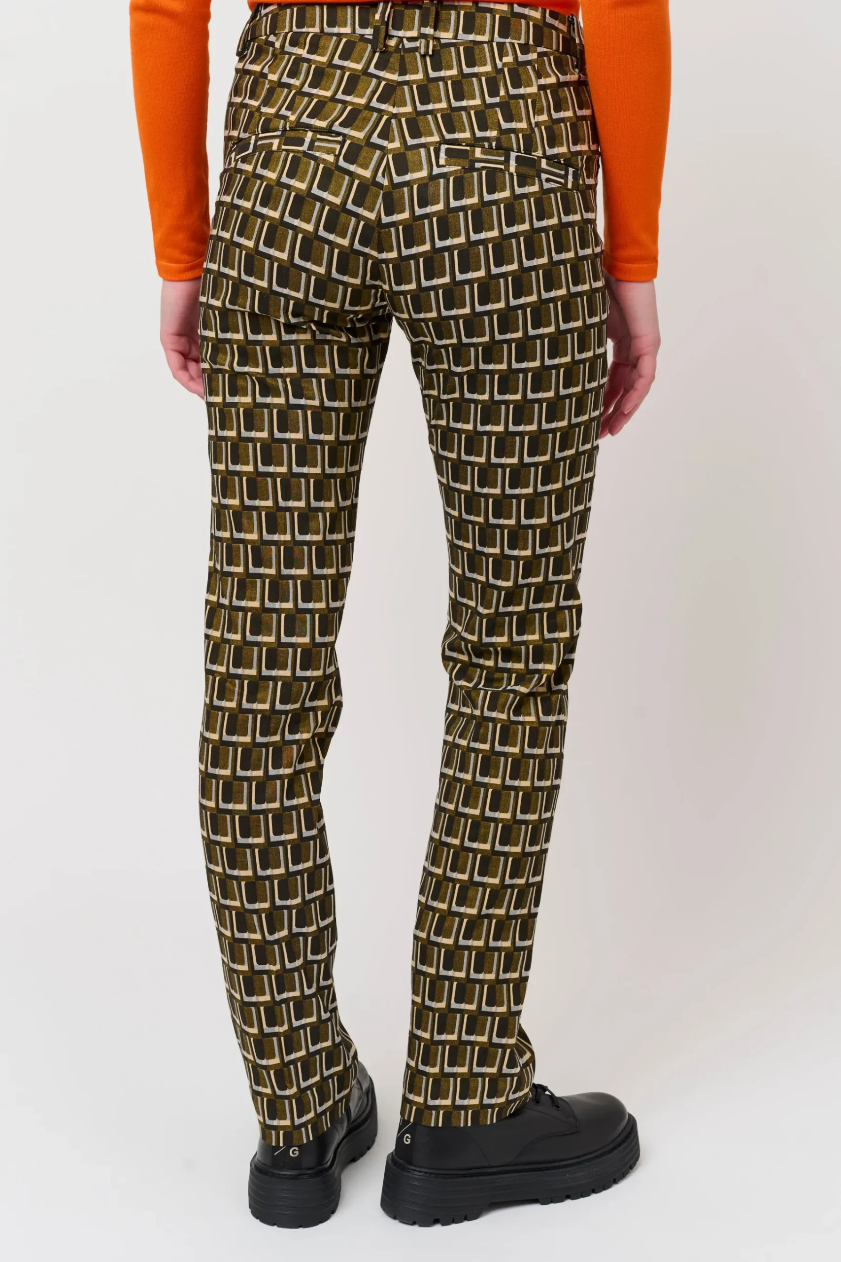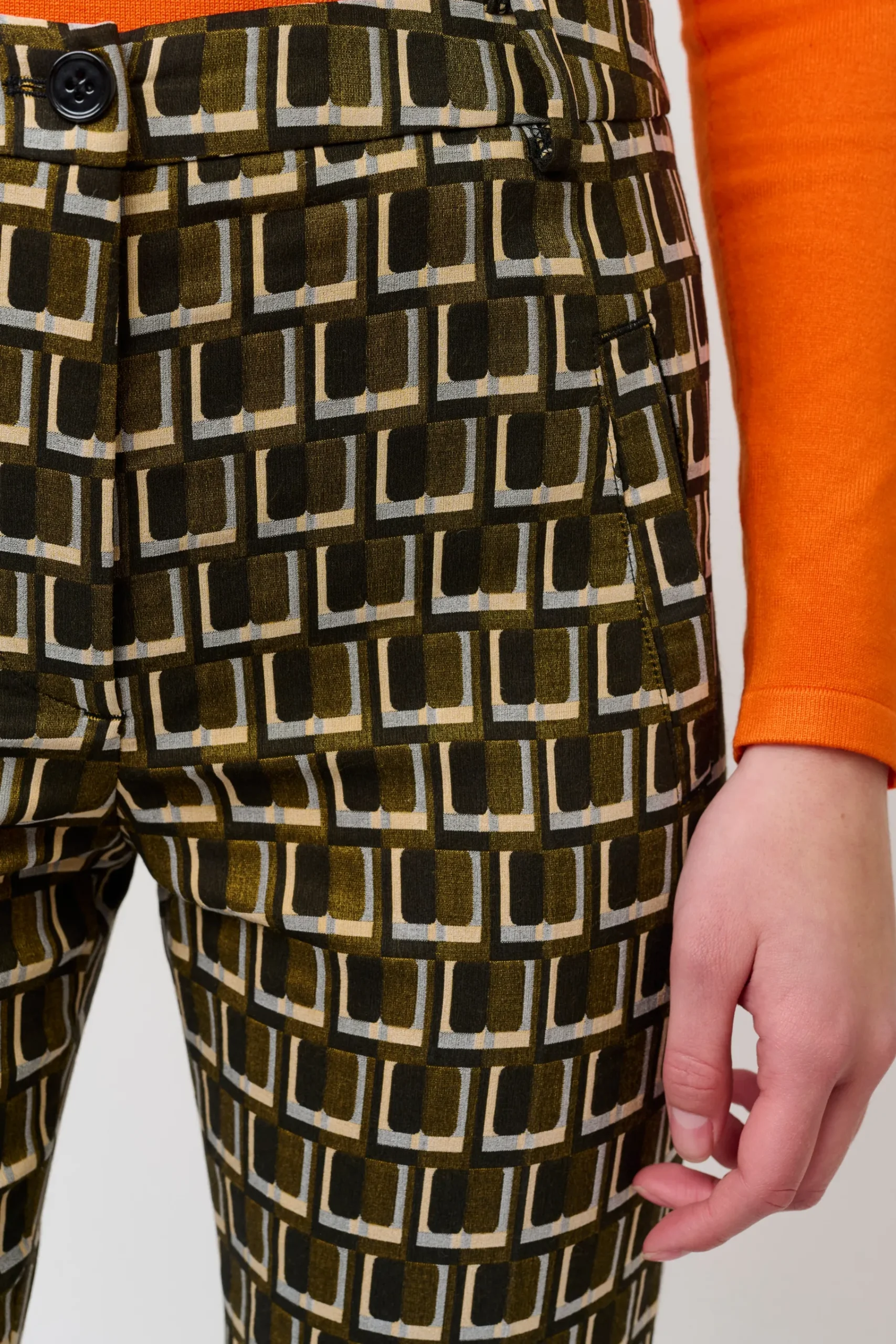 Jacquard habitbukser lavet i en eksklusiv italiensk jacquard metervare, med et stilfuldt vævet grafisk mønster. Bukserne har klassiske habit detaljer, som indebærer presfold midtfor og bag, sidelommer, bæltestroppper og paspellommer bagpå.