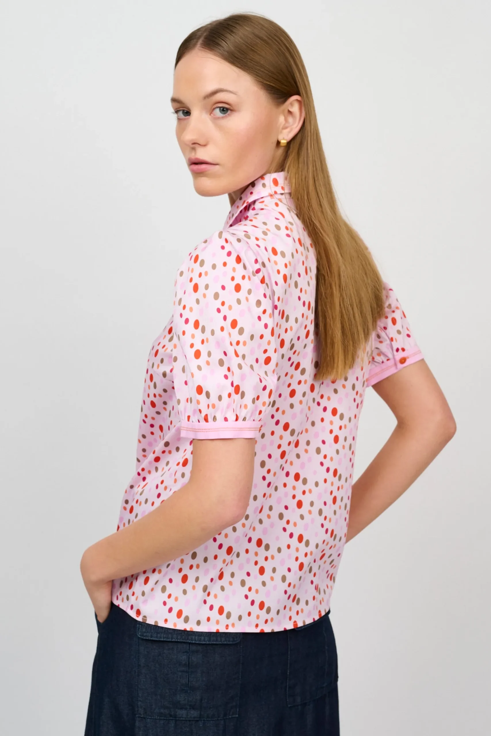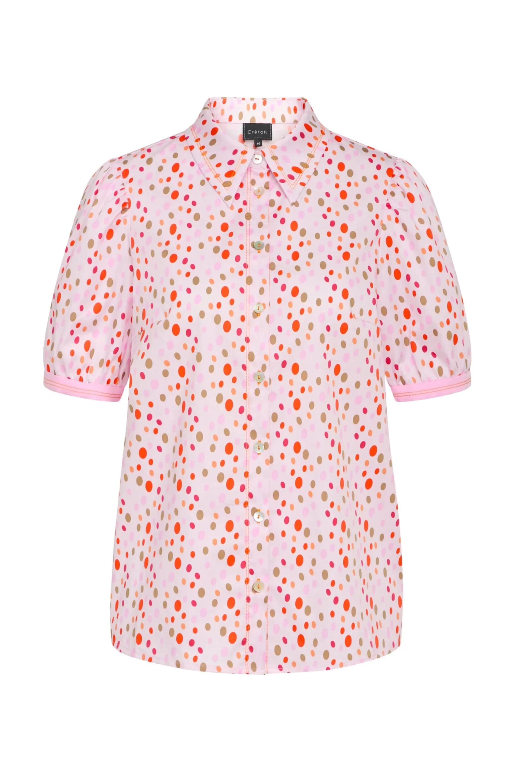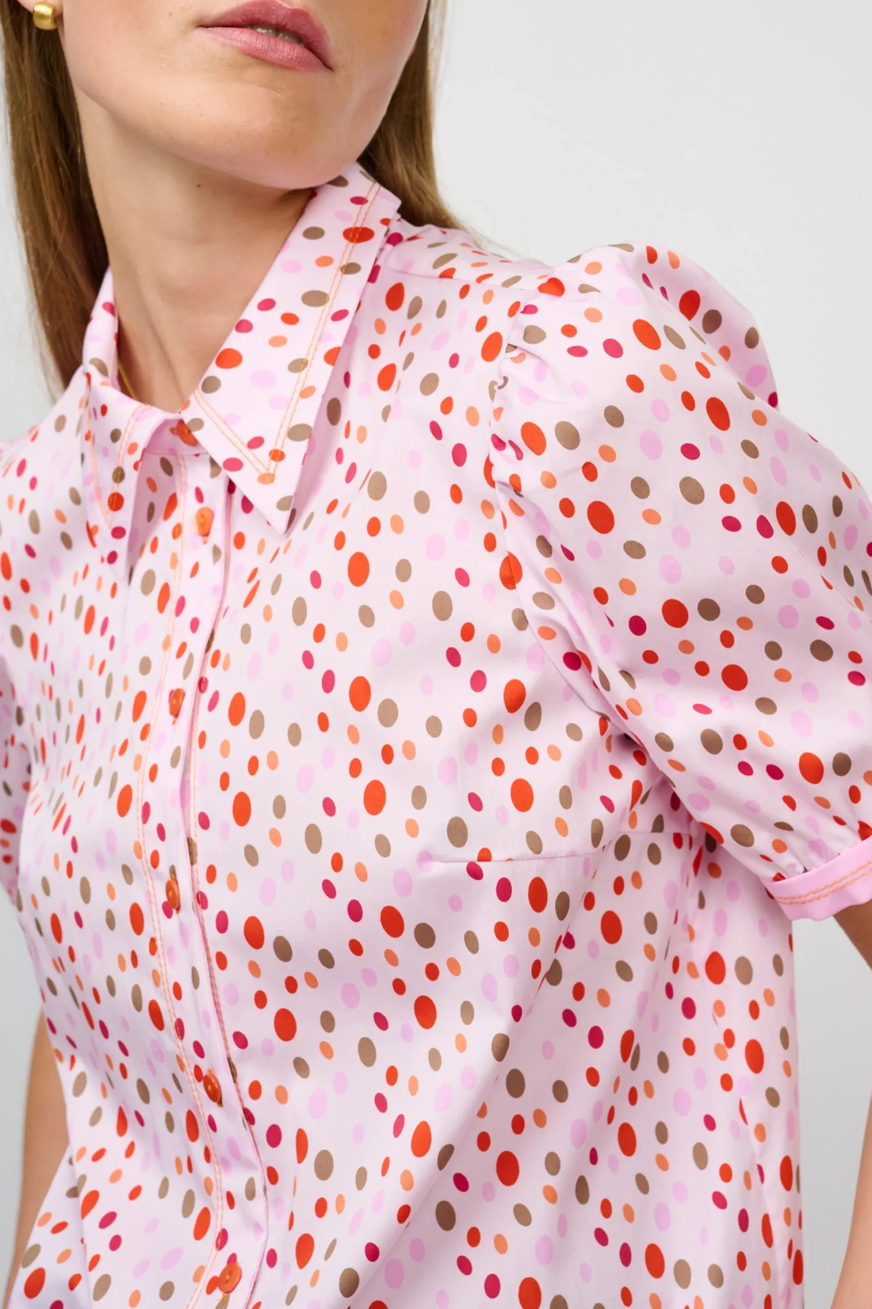 Skjorten har et farverigt print med cirkler i forskellige størrelser. Farverne er en blanding af lyserøde, røde, orange og brune nuancer, der skaber et luksuriøst farvespil. Farverne fremstår skarpe på det fine materiale.