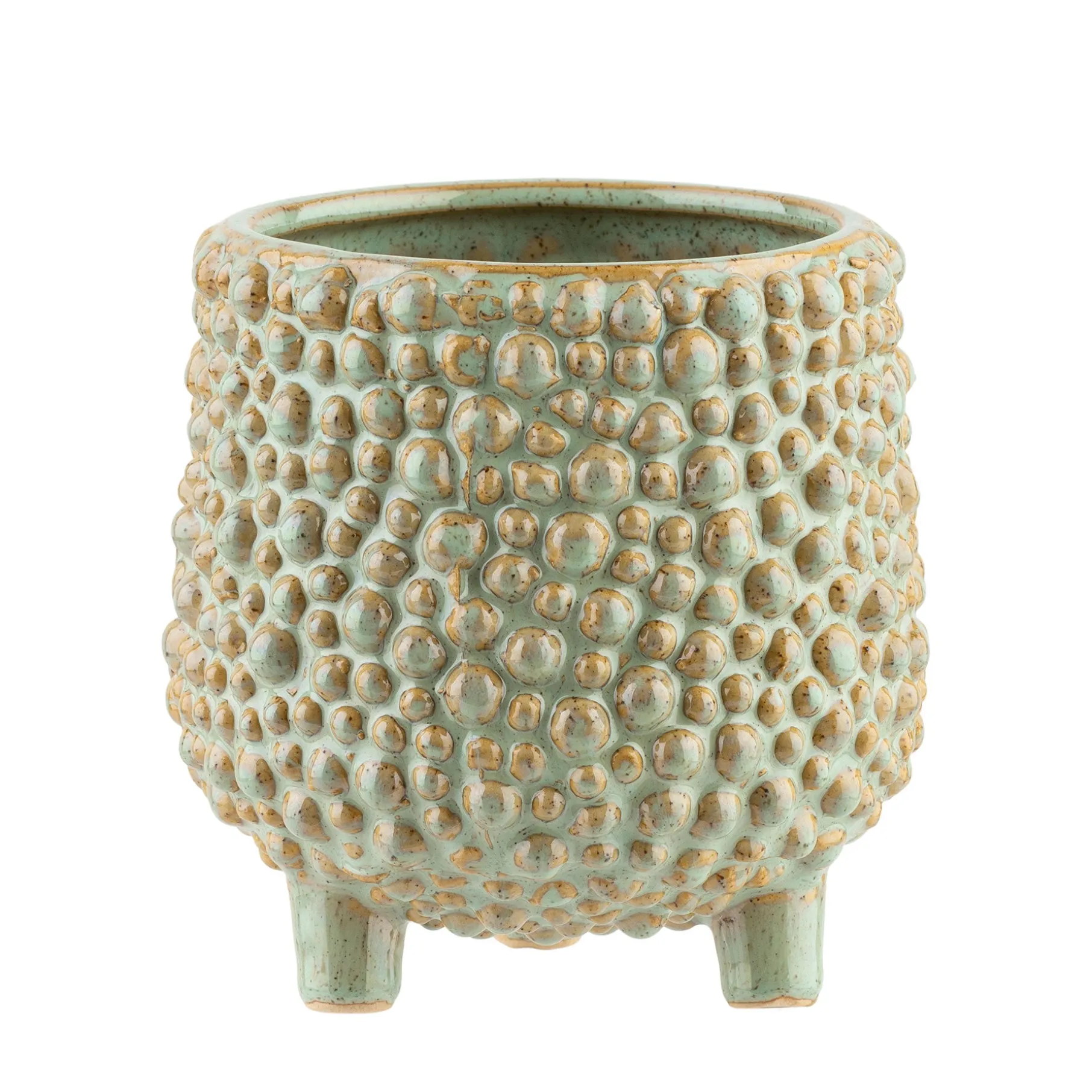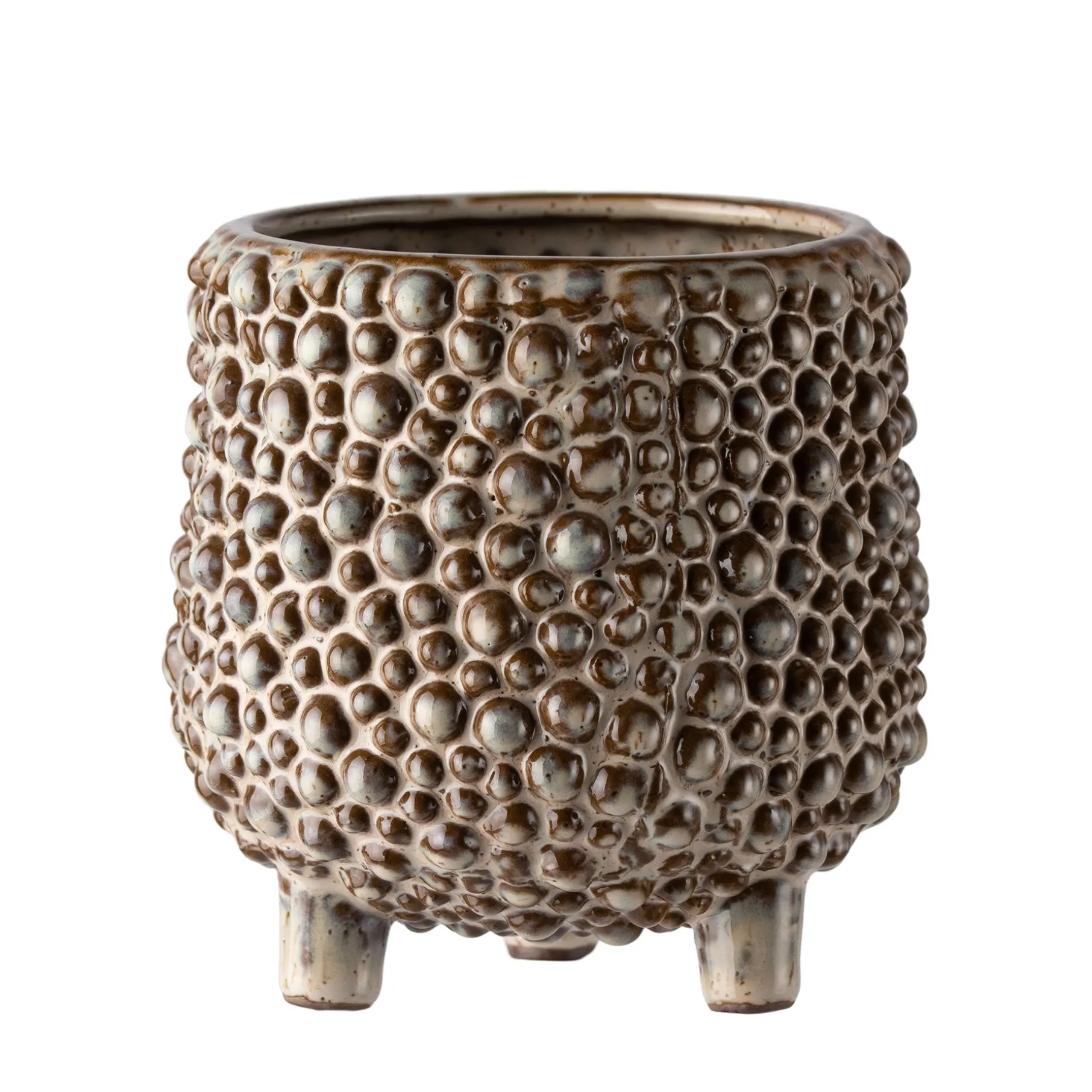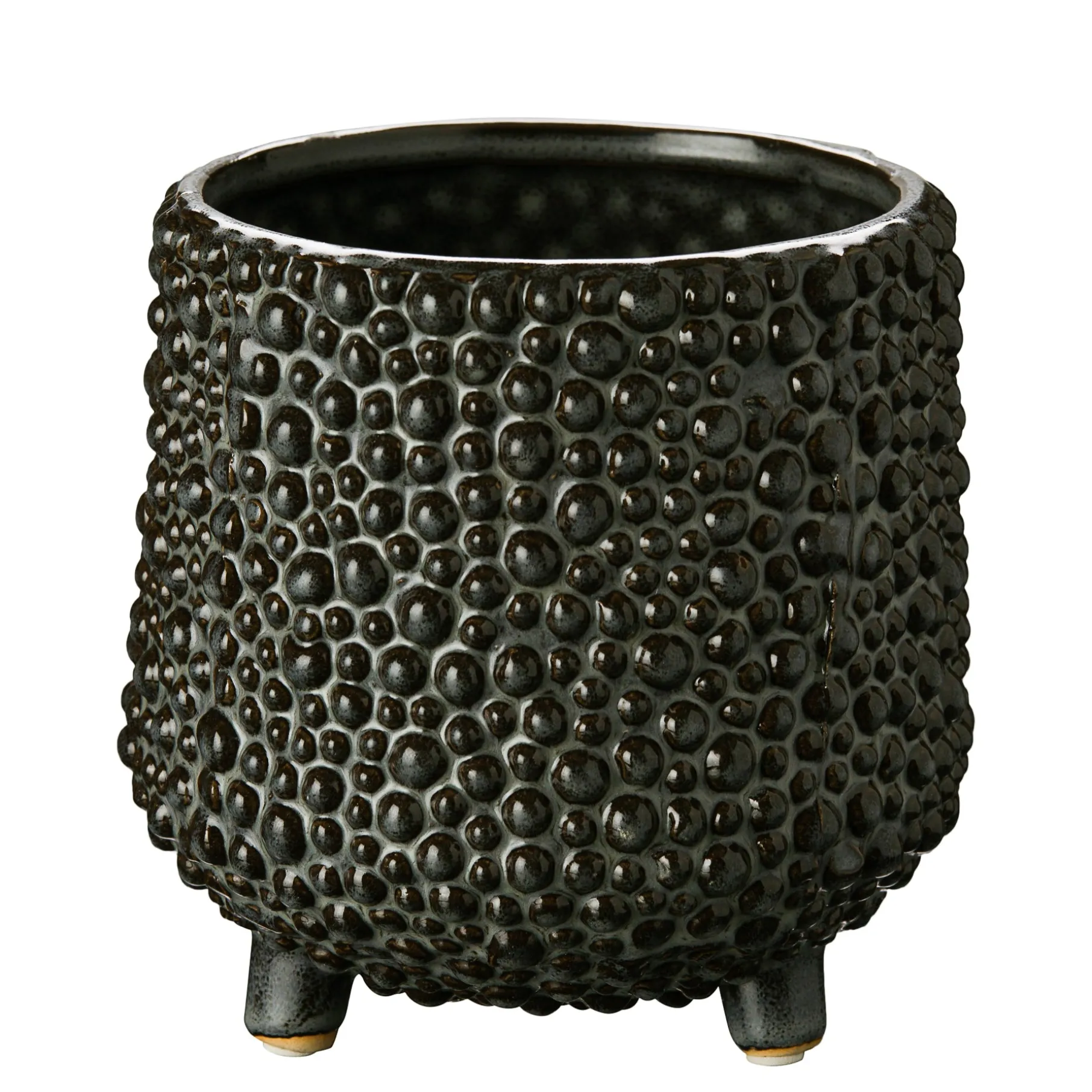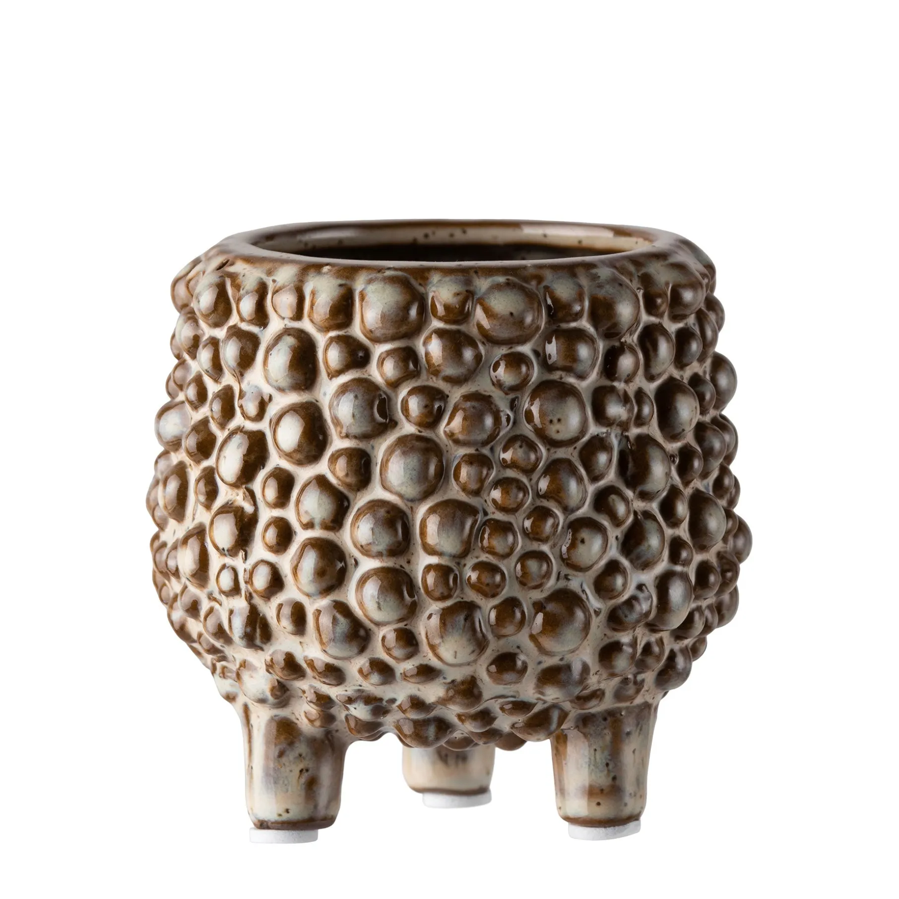 Rund urtepotte med prikket struktur og små fødder så den hæves en smule fra overfladen. Urtepottens design giver et flot visuelt udtryk til enhver plante.