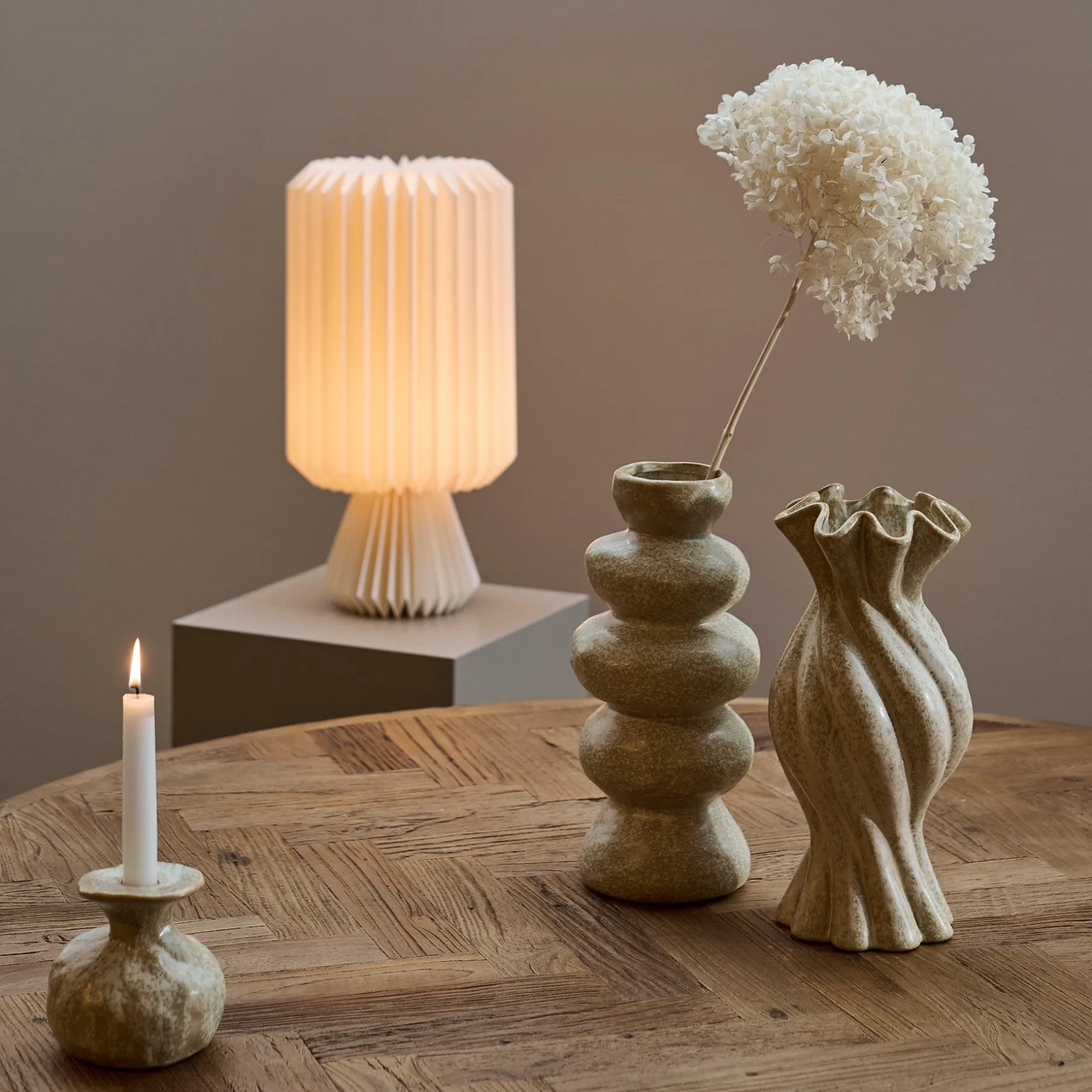 Med en højde på 30 cm og en diameter på 14 cm er Dulcia vasen perfekt som et centralt blikfang i din stue, på spisebordet eller som en stilfuld detalje i entréen. Brug den til dine yndlingsblomster, tørrede buketter eller lad dens skulpturelle form tale for sig selv.