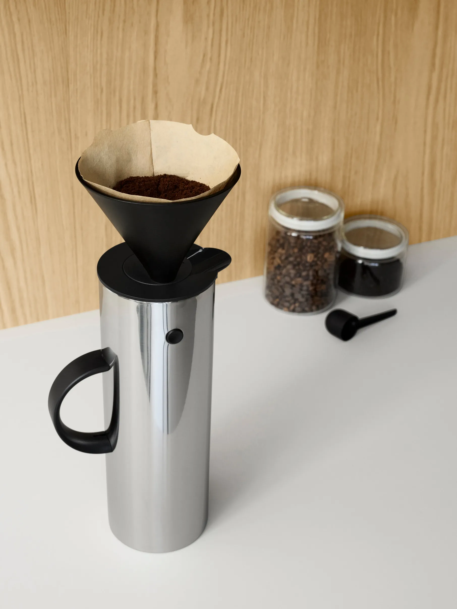Steltons unikke termokande EM77 er designet af Erik Magnussen i 1977. Der følger både en vippeprop og et skruelåg med kanden, hvilket gør at kanden også kan transporteres med indhold.