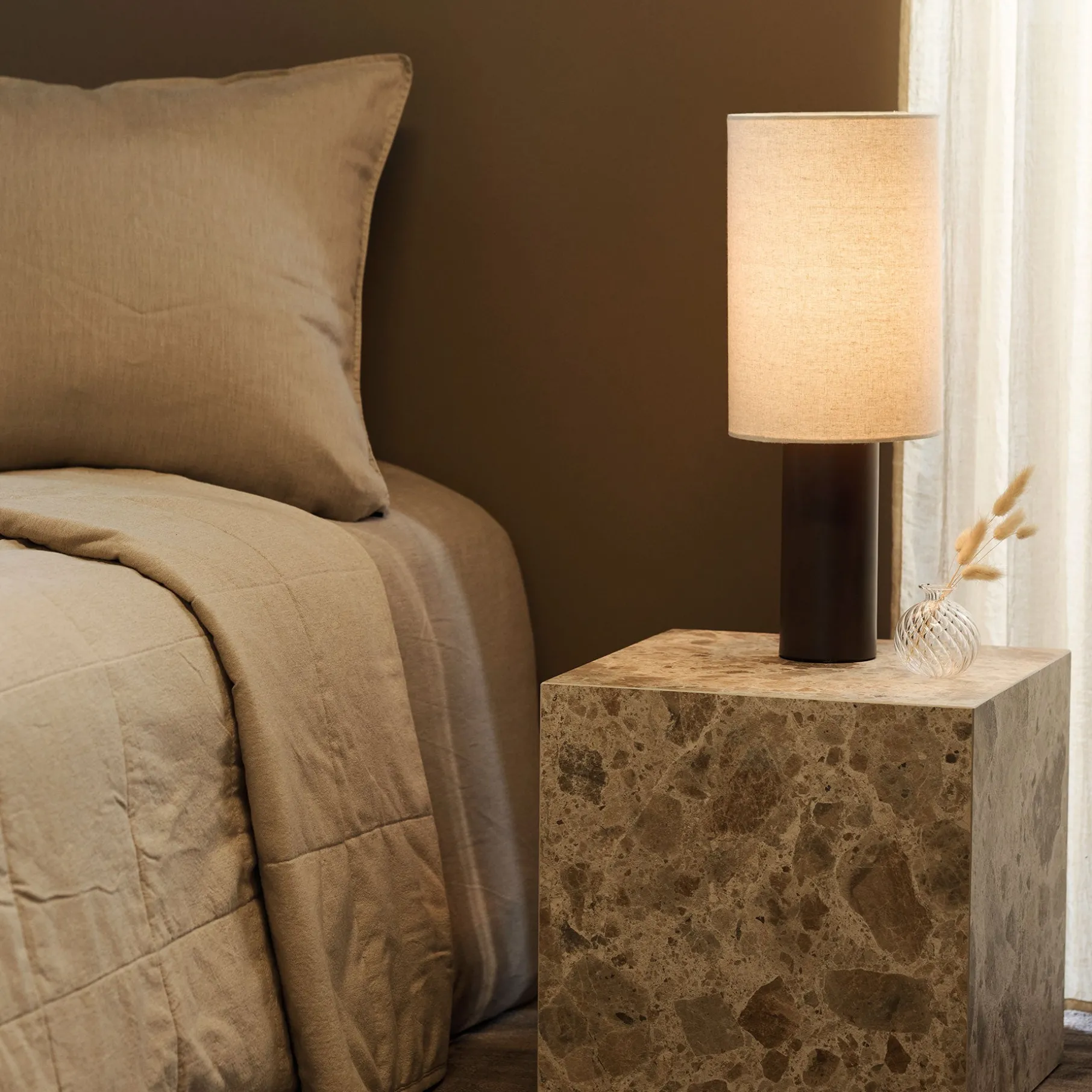 Høj cylinderformet bordlampe med en behagelig lysdiffusion. Den kombinerer æstetik og funktionalitet og fungerer som en central pyntegenstand.