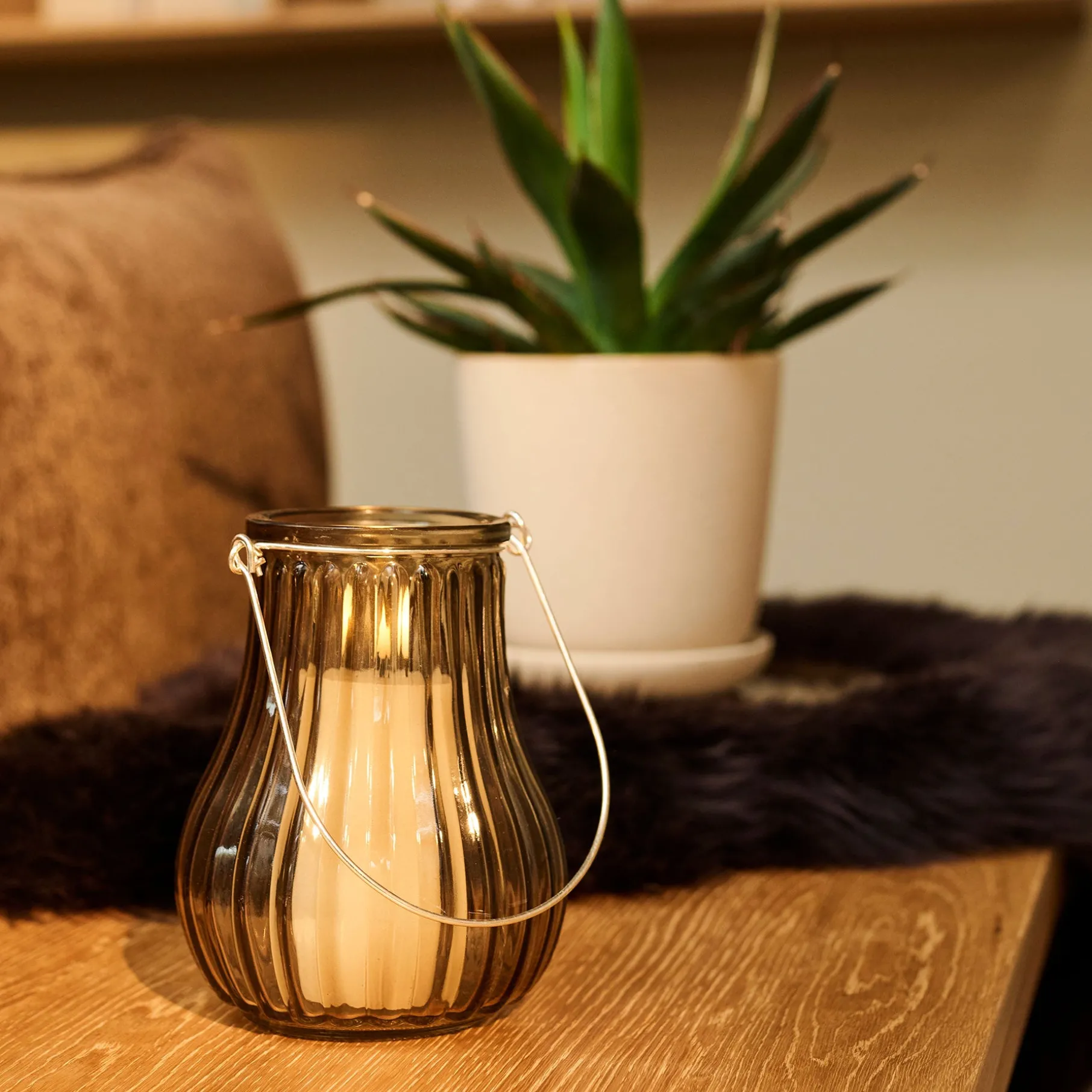 Det brune glas skaber et blødt, diffust lys, som spreder en hyggelig stemning, uanset om du bruger lanternerne til at skabe en afslappende atmosfære i stuen, eller som en stemningsfuld detalje på terrassen.