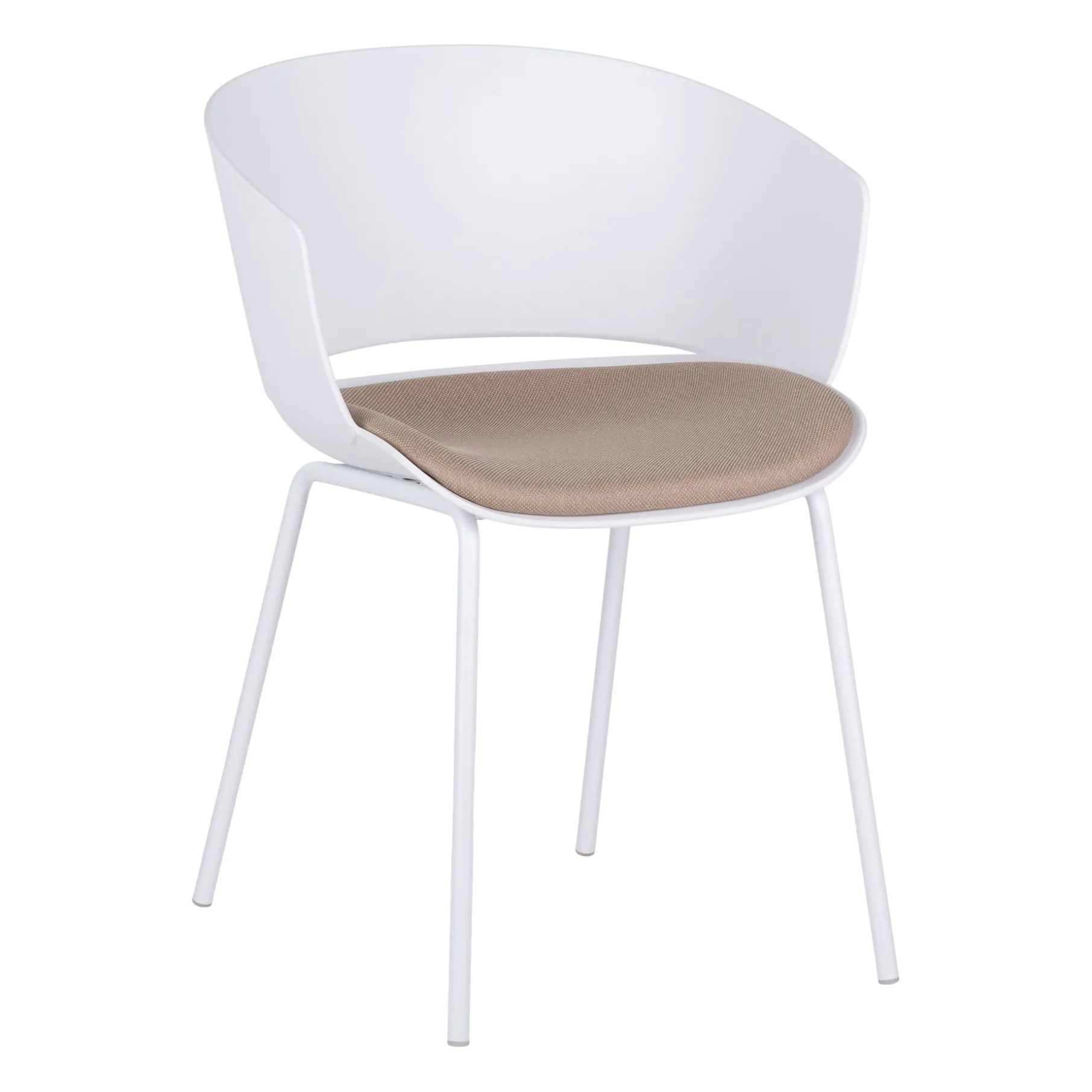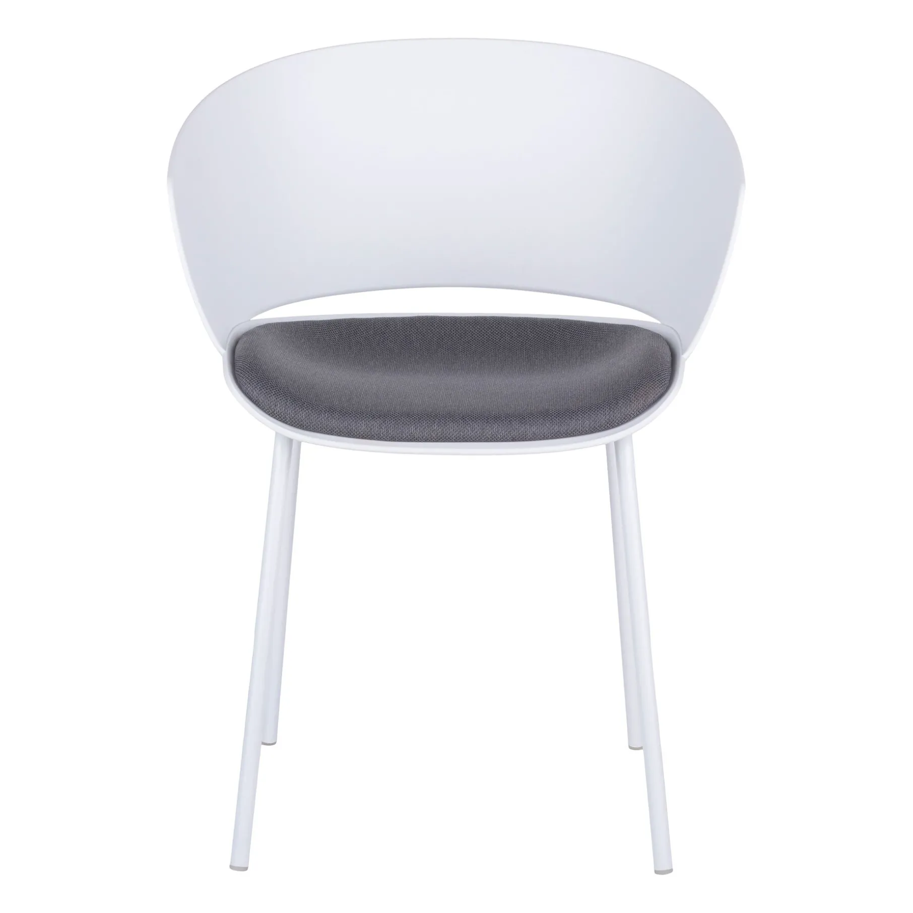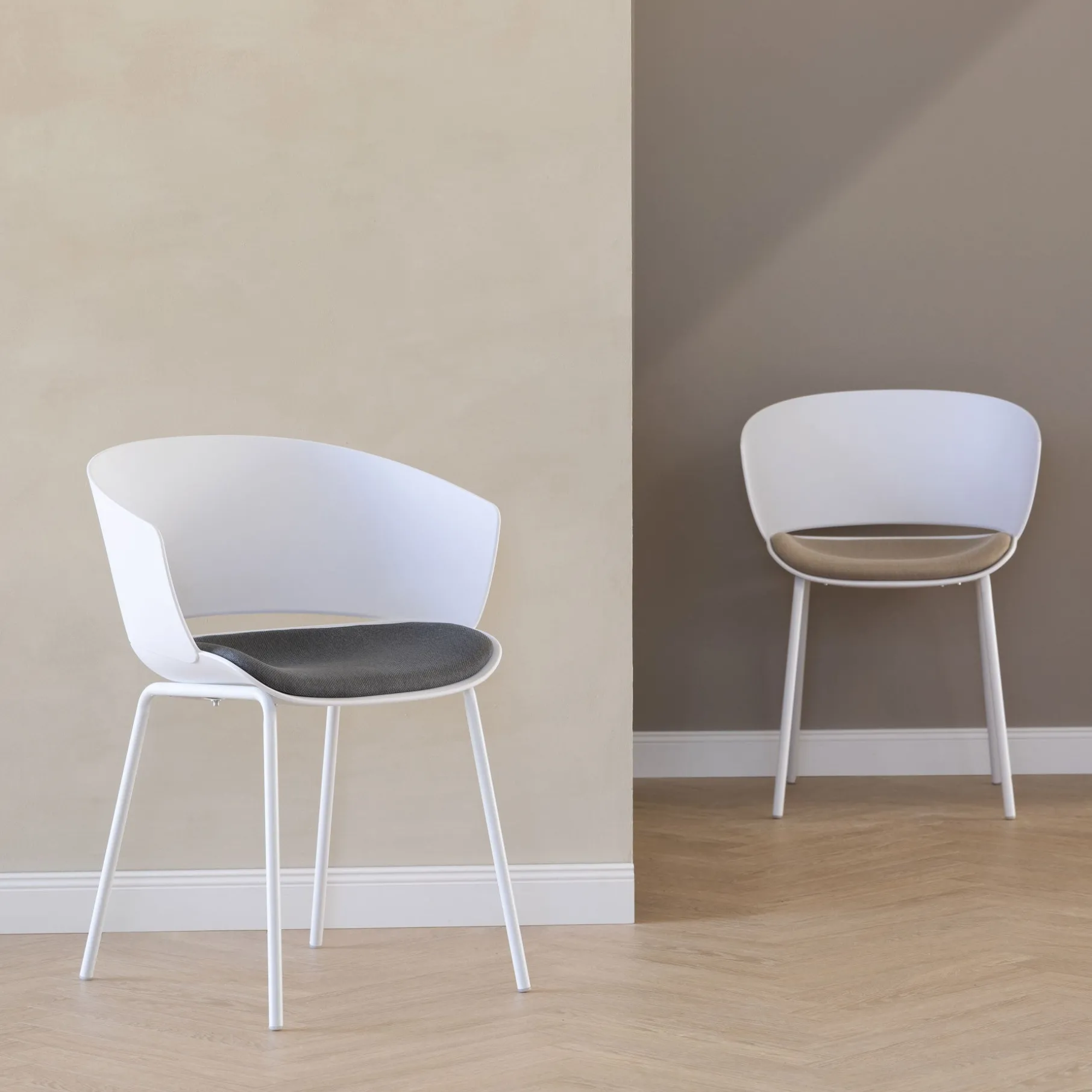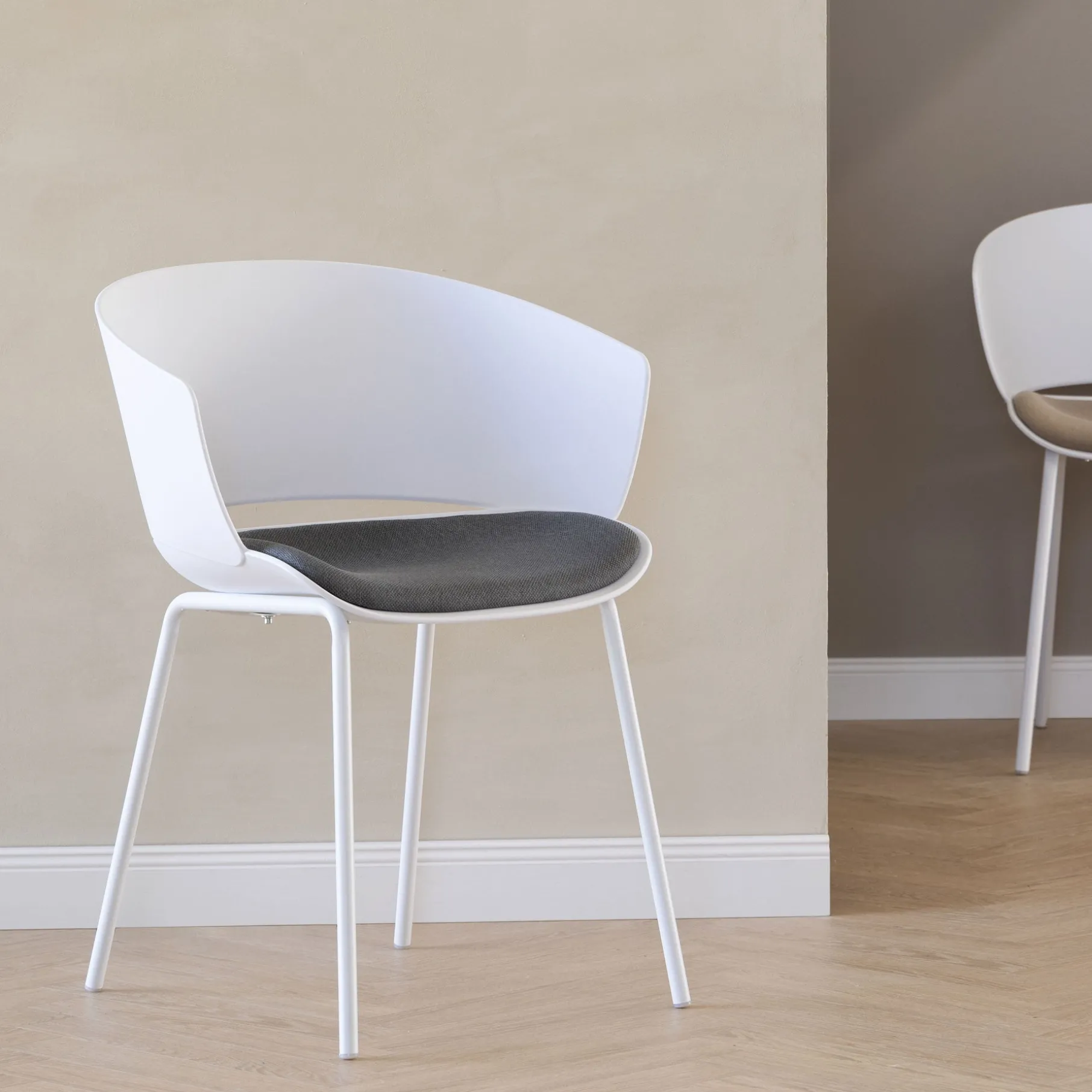 Florence spisebordsstol i skarpt nordisk design. Sædet er polstret og betrukket med 100% recycled polyester, som giver dig en god siddekomfort. Ryggen er i formstøbt hård plast der giver stolen et skarpt og elegant design. Benene er i pulverlakeret hvidt metal, der giver en lethed i designet.