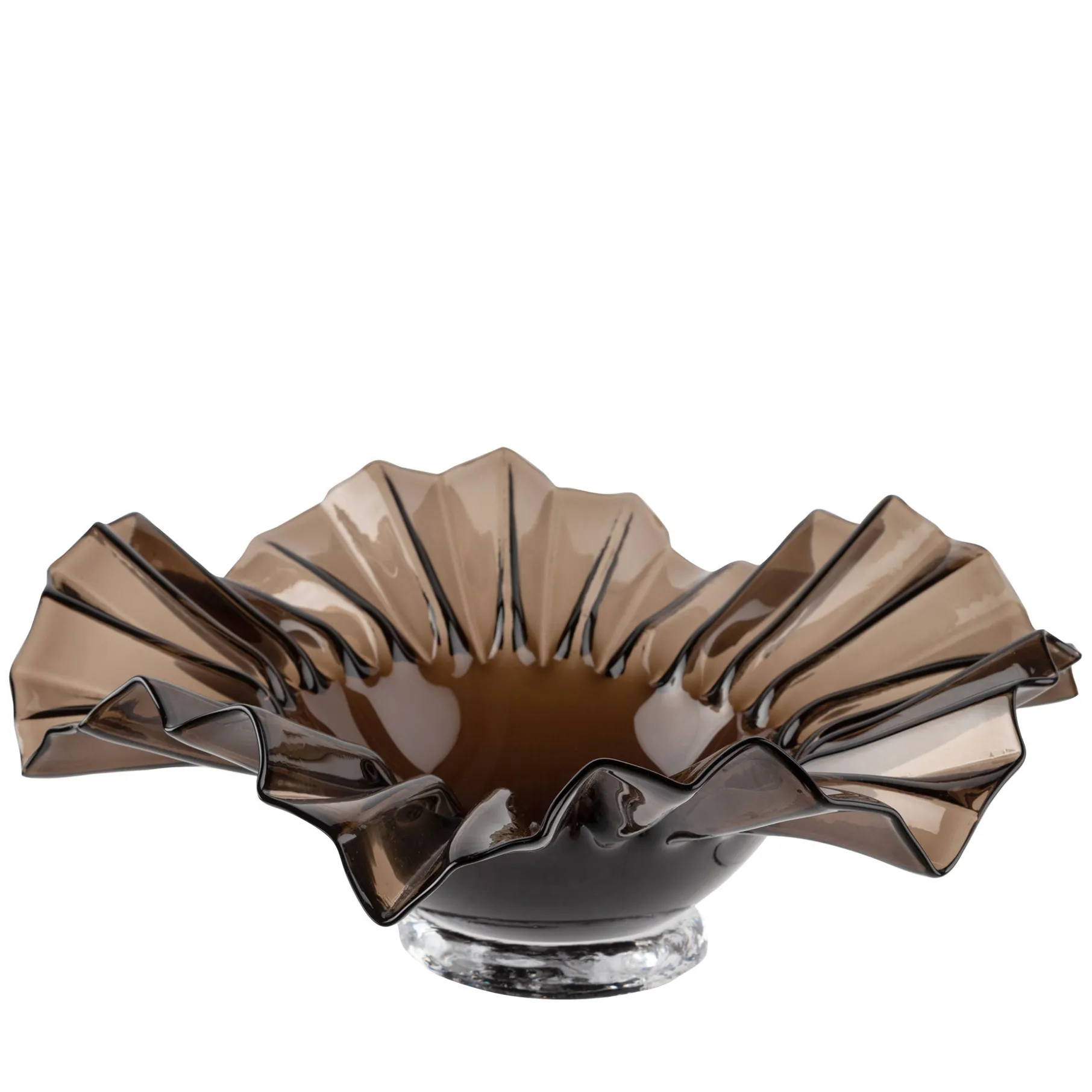 Dette fad er håndlavet og mundblæst af en glaspuster. Fadet er et kunstværk, der skiller sig ud med sin raffinerede kant, der følger fadets runde form og skaber bølgende linjer.