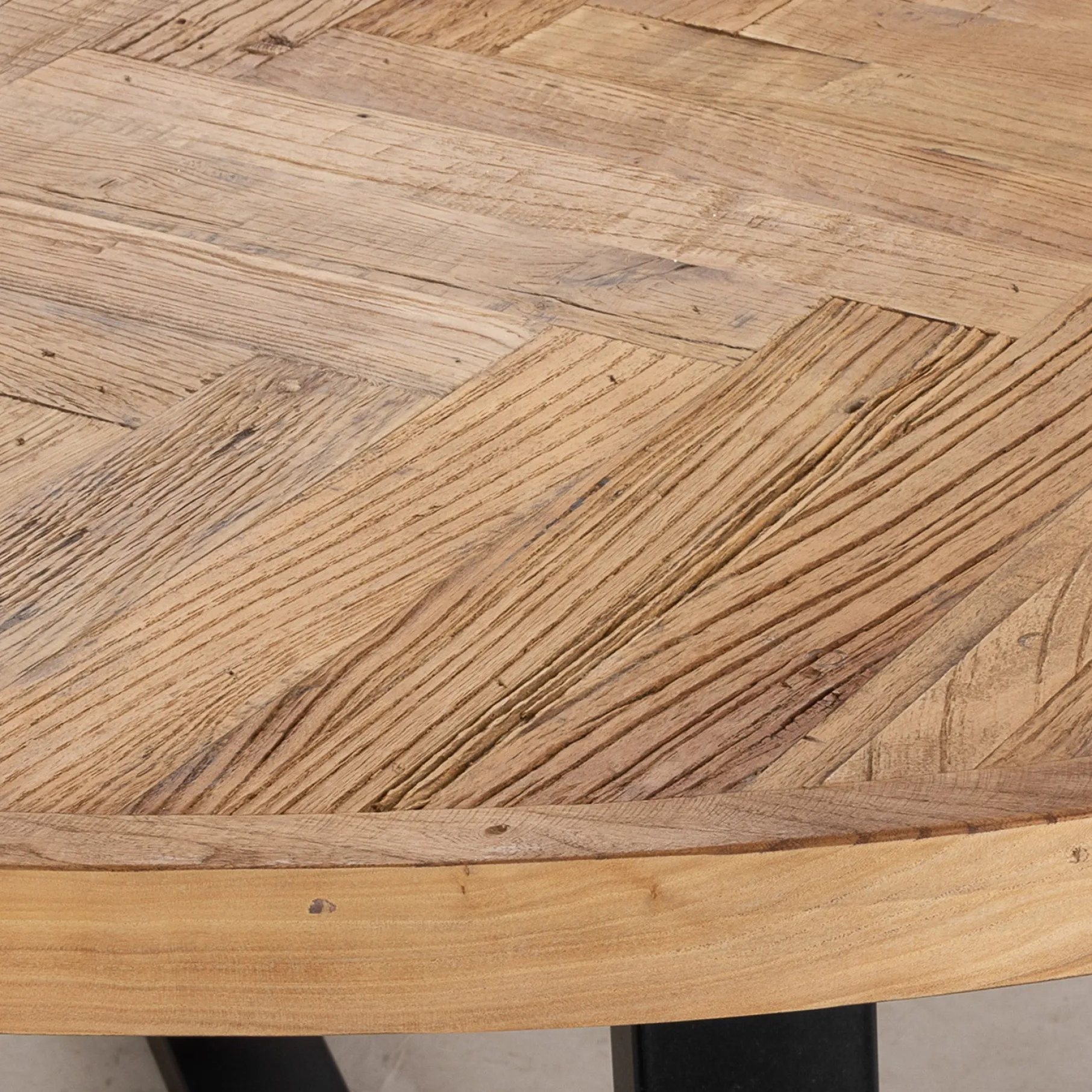 Bordpladen er fremstillet af genbrugt elmetræ, hvilket giver hvert bord en helt unik karakter med varierende nuancer og teksturer, der fortæller en historie. Det runde design, kombineret med det klassiske sildebensmønster, tilføjer en tidløs elegance, som passer perfekt ind i både moderne og traditionelle indretninger.