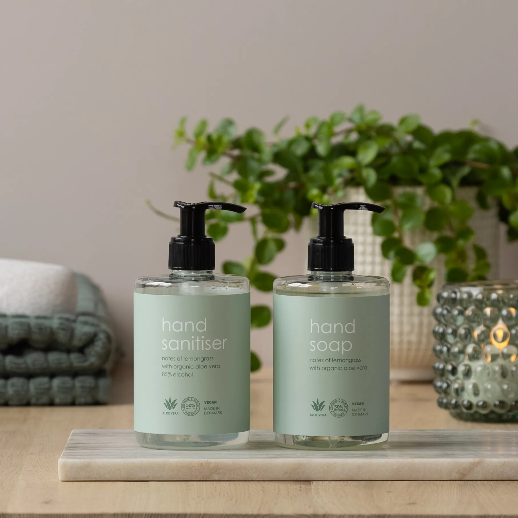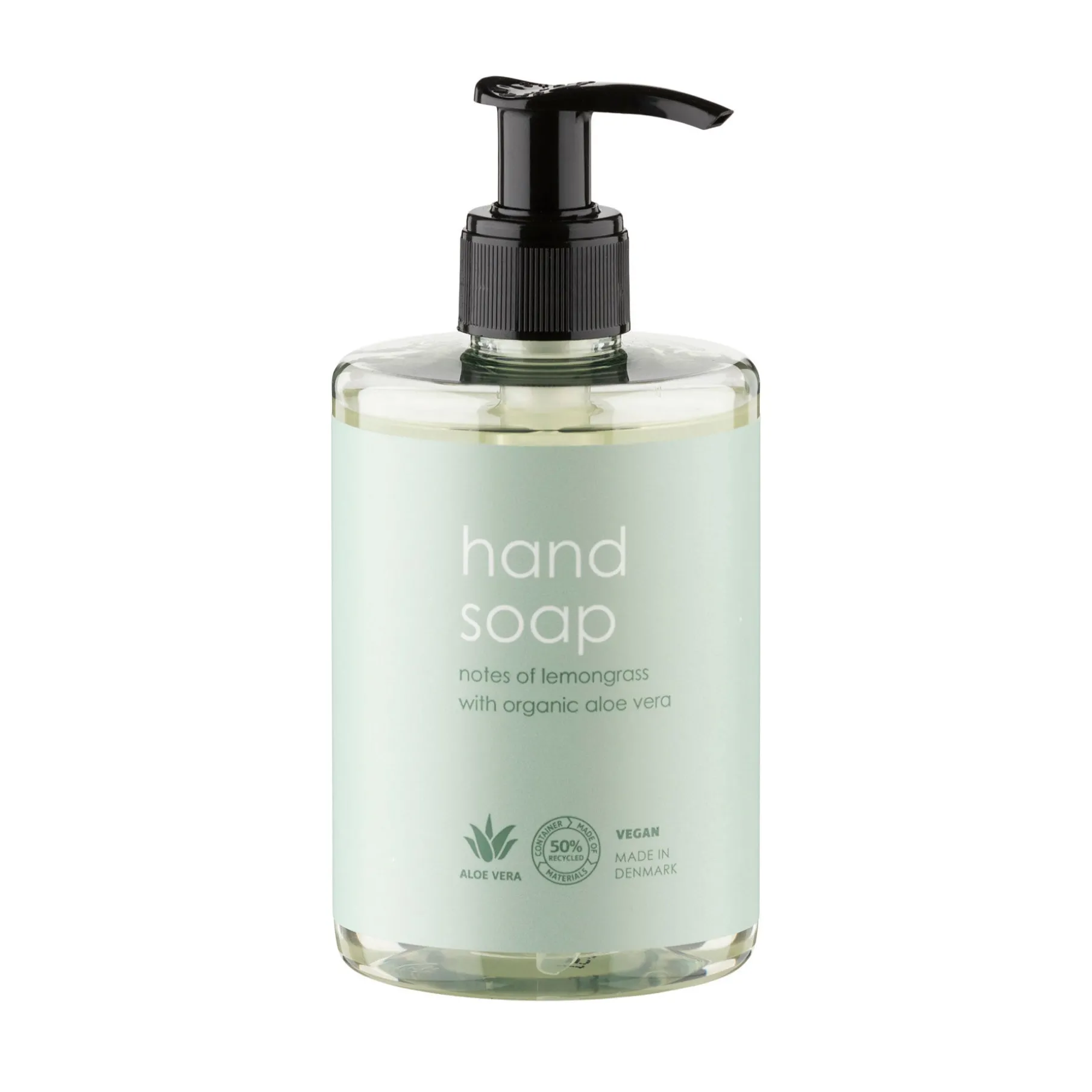 Flasken er lavet af 50 % genanvendeligt plastik og håndsæben er produceret i Danmark. Med denne håndsæbe får du en frisk duft af lemongrass.