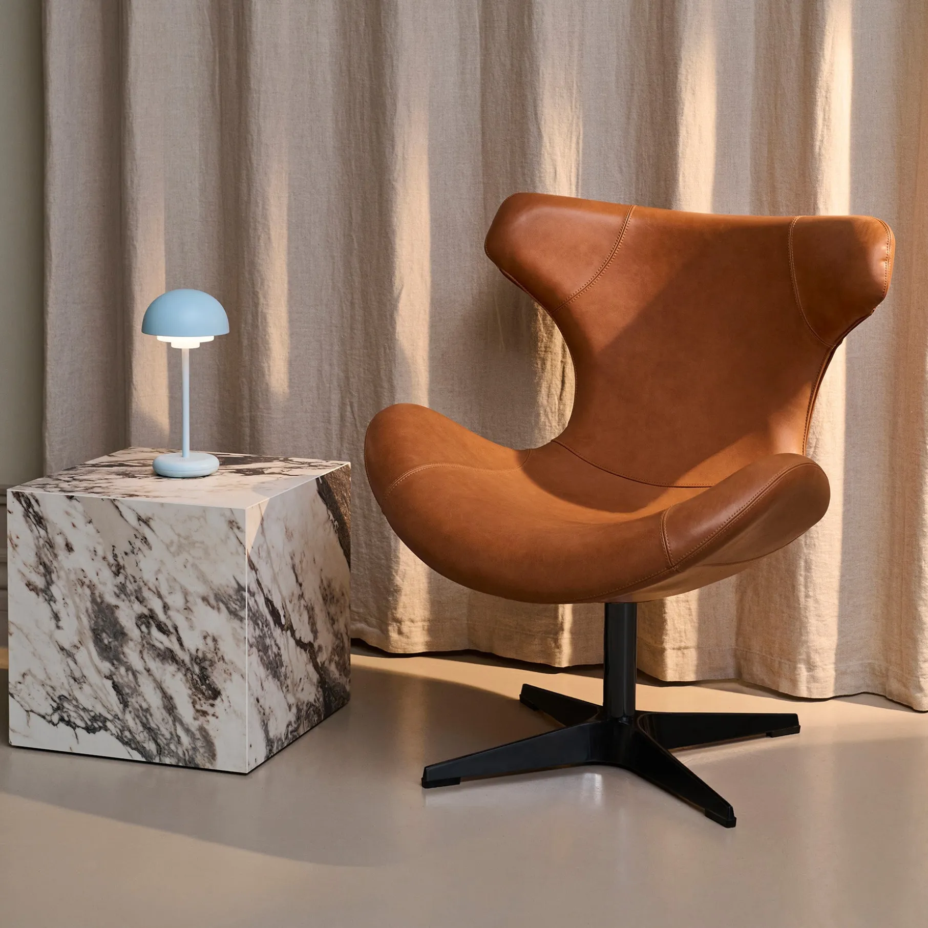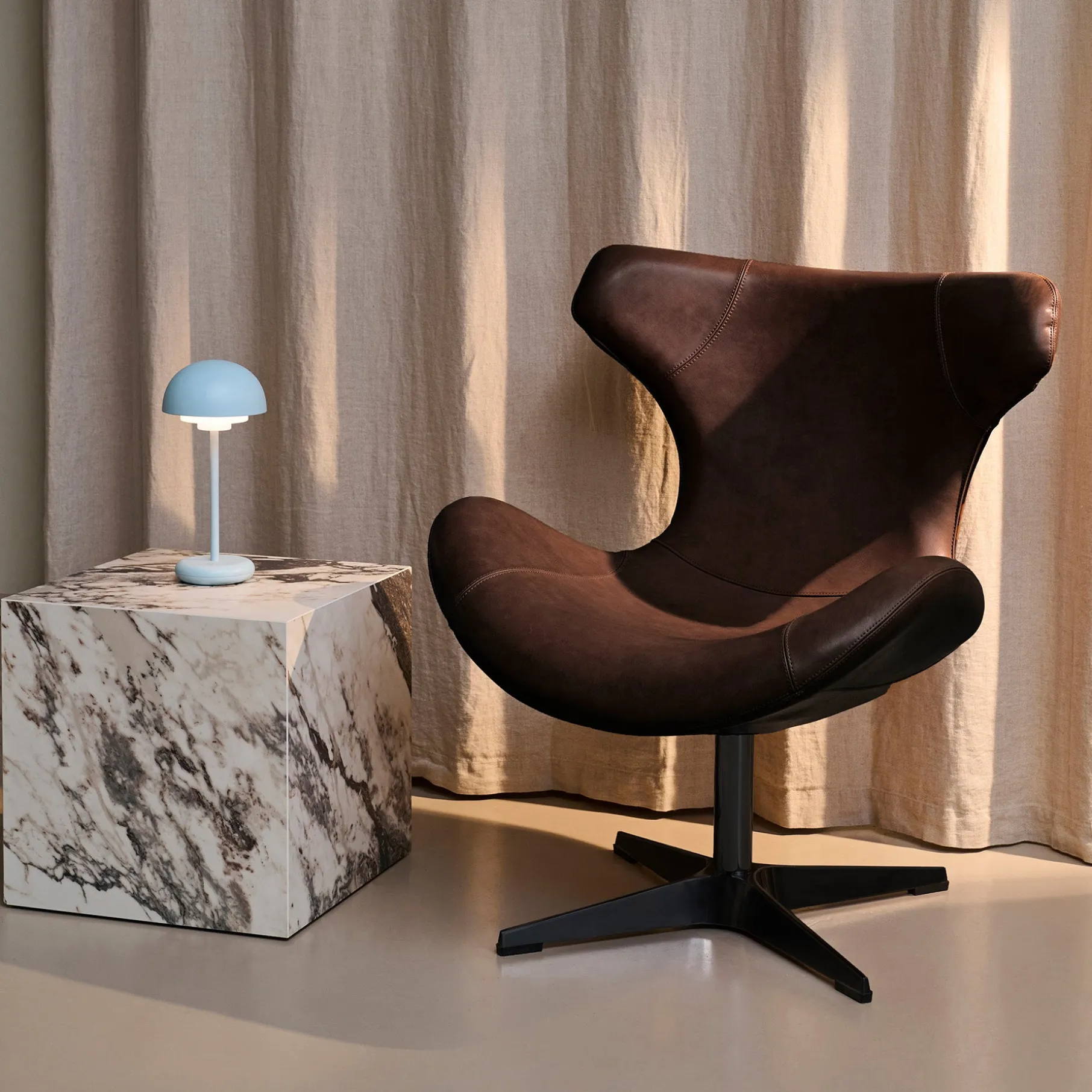 Gør din indretning komplet med Kato loungestol i læder med sort drejesokkel – en perfekt kombination af stil, komfort og funktionalitet. Med sit smukke, buede design og luksuriøse semianilinlæder tilbyder denne stol en udsøgt siddeoplevelse og et eksklusivt vintage-look, der kun bliver smukkere med tiden.