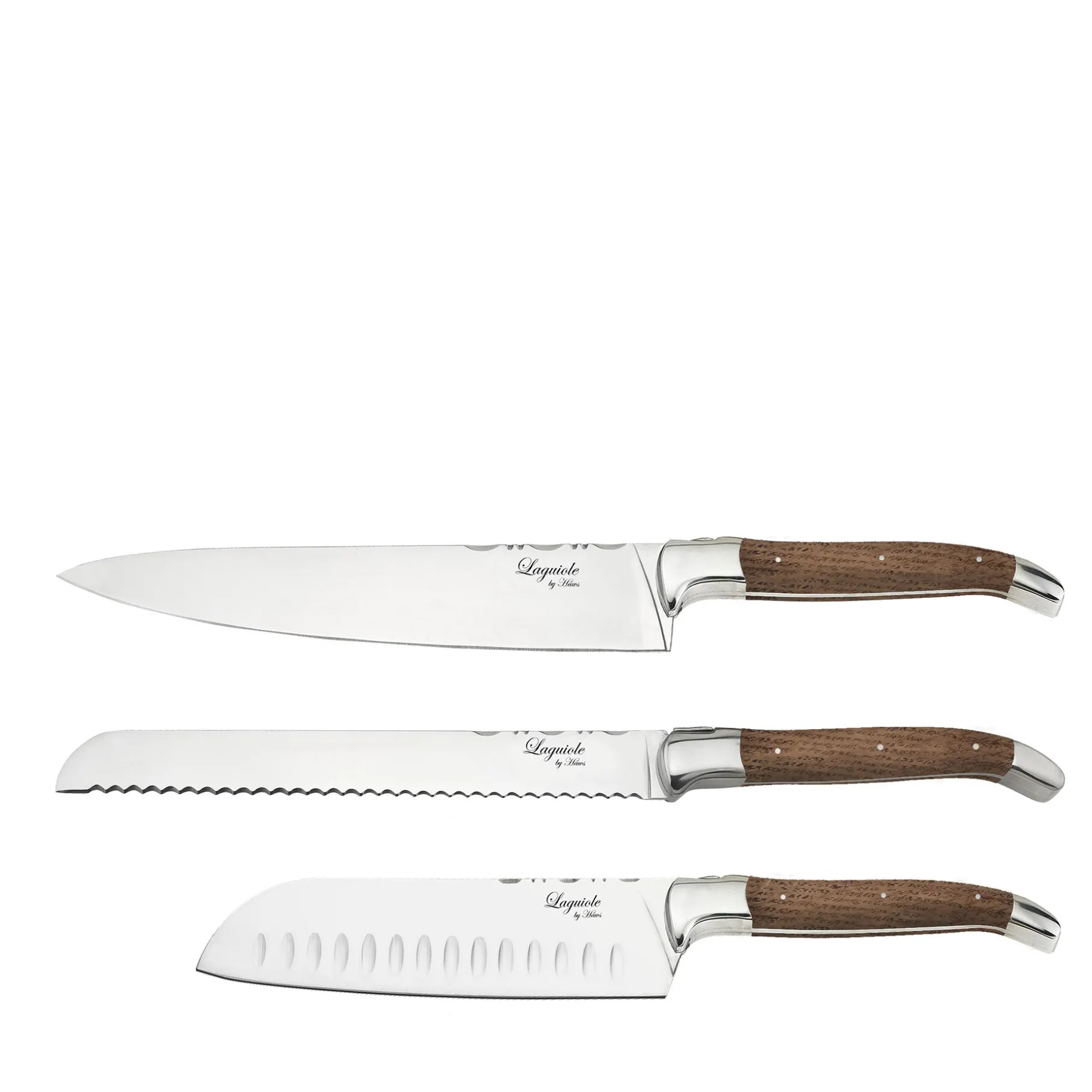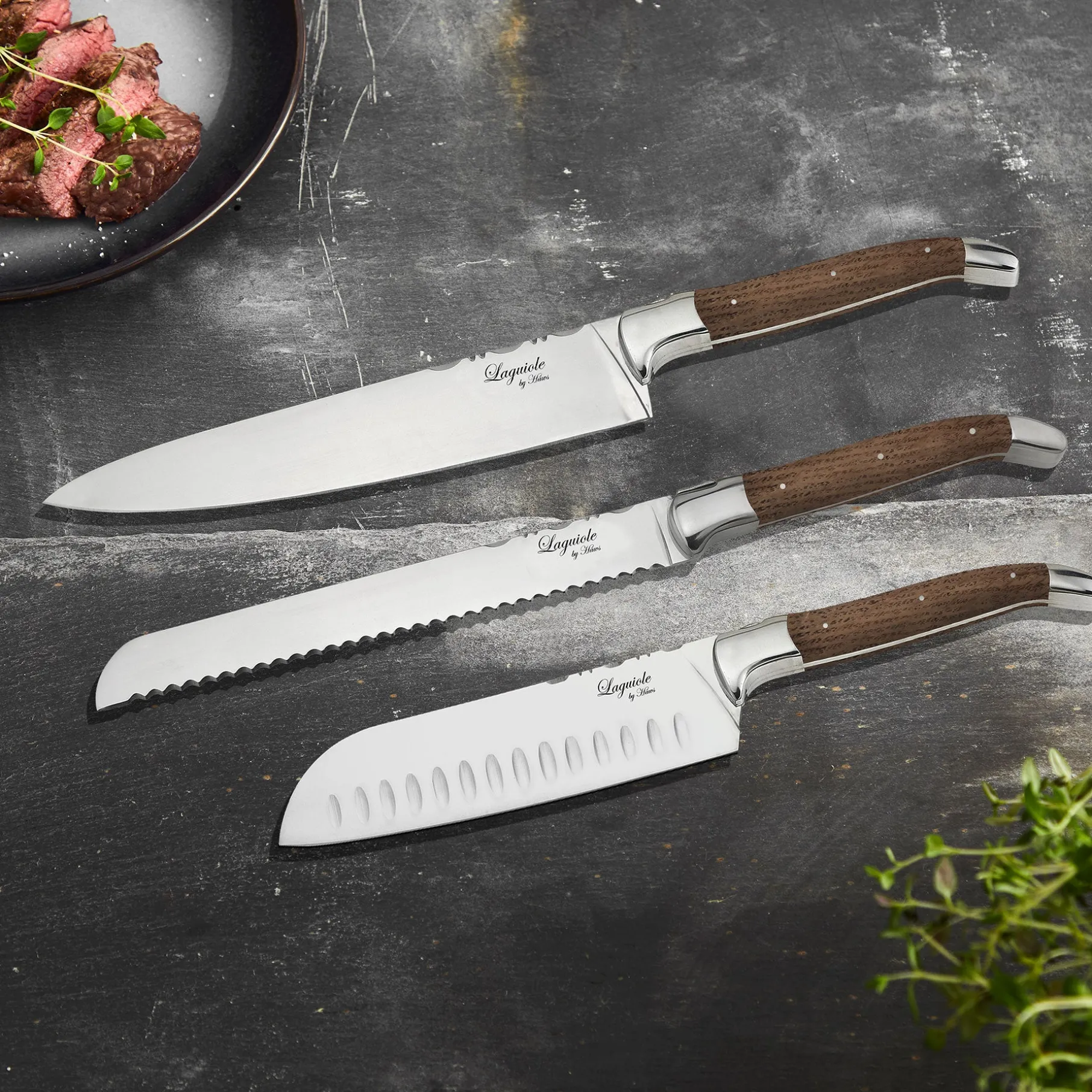 Sættet inkluderer kokke-, brød- og santokukniv.