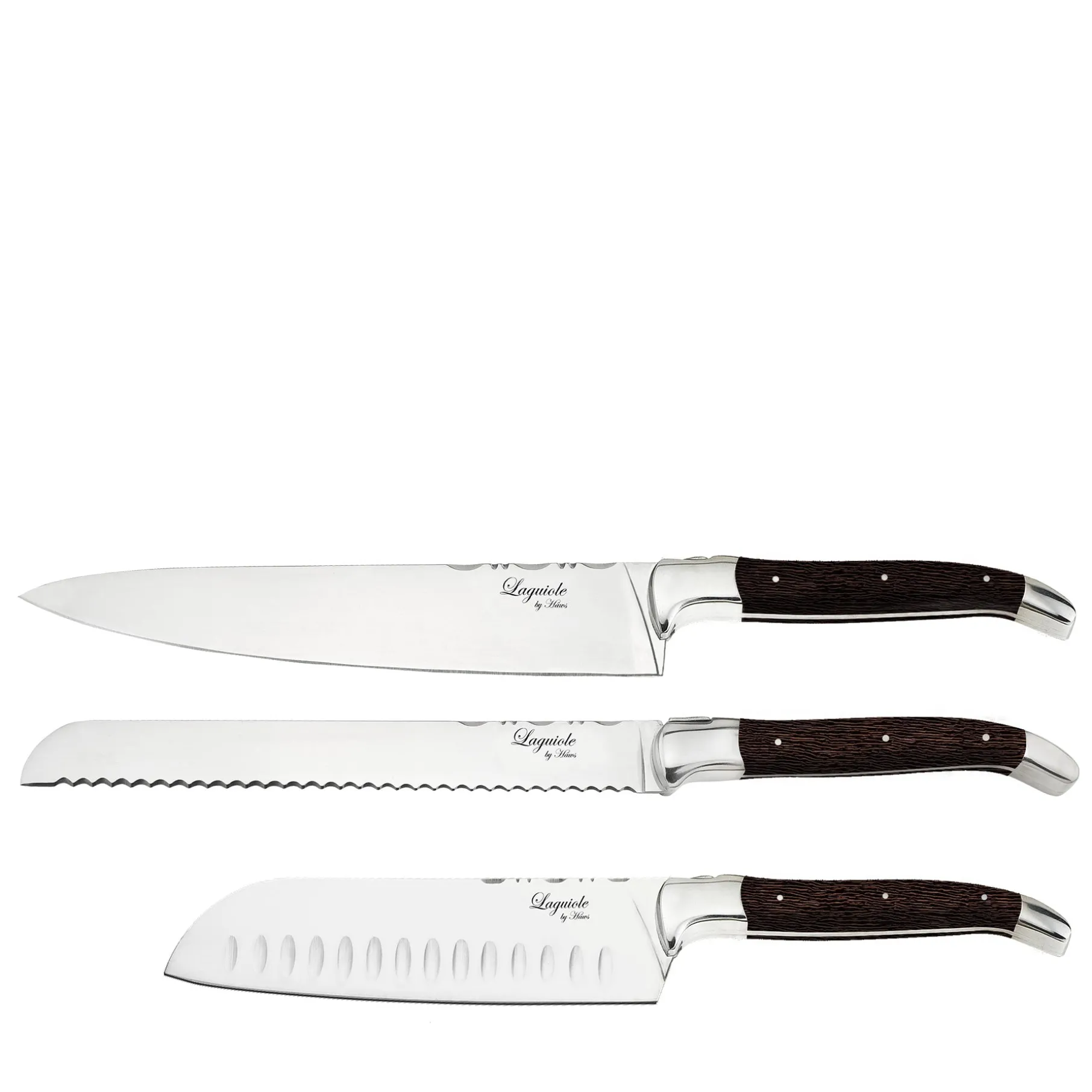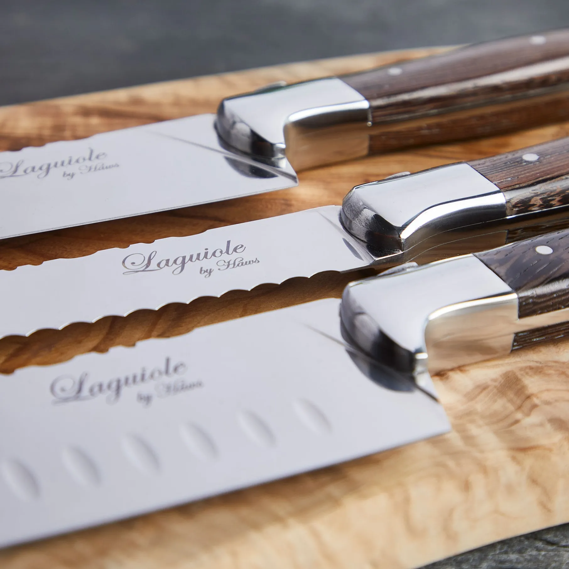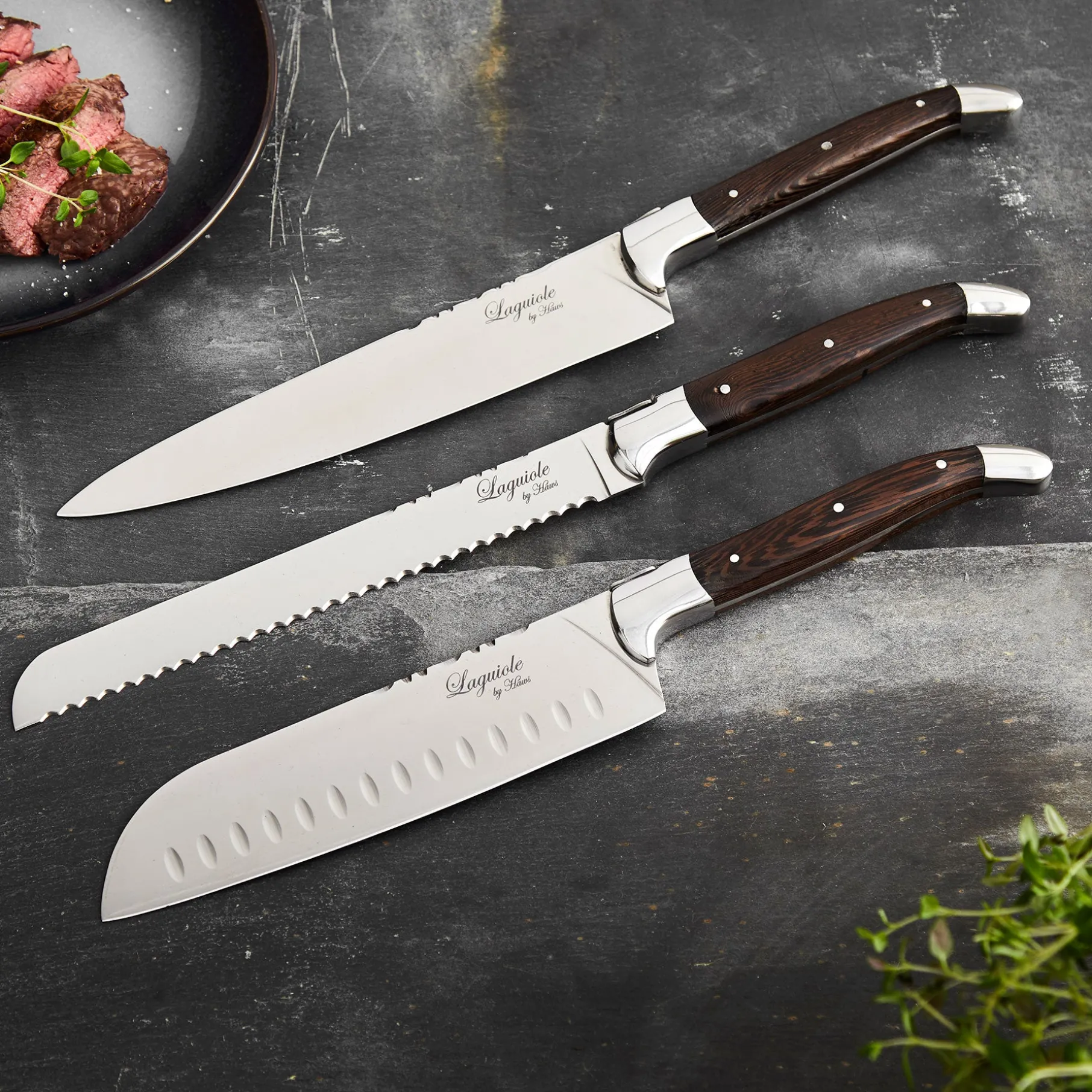 Om du er nybegynder eller erfaren i køkkenet, er det altid godt med gode knive, og her skuffer dette knivsæt fra Laguiole by Hâws ikke. Sættet indeholder tre forskellige knive – en santoku-, kokke- og brødkniv – så du har til de mest basale opgaver i køkkenet.