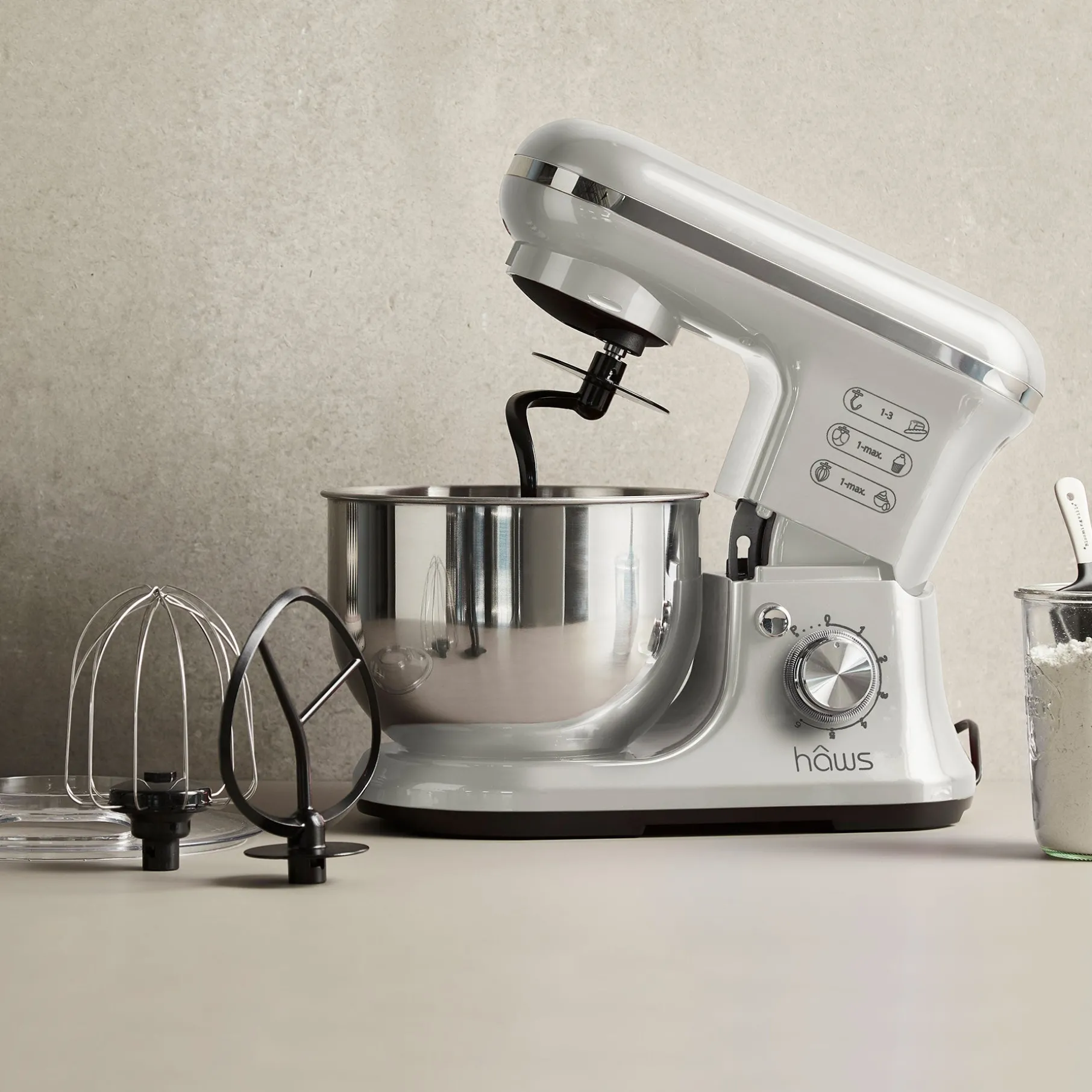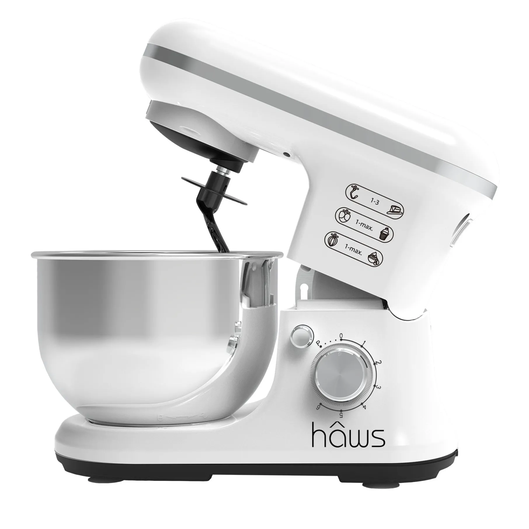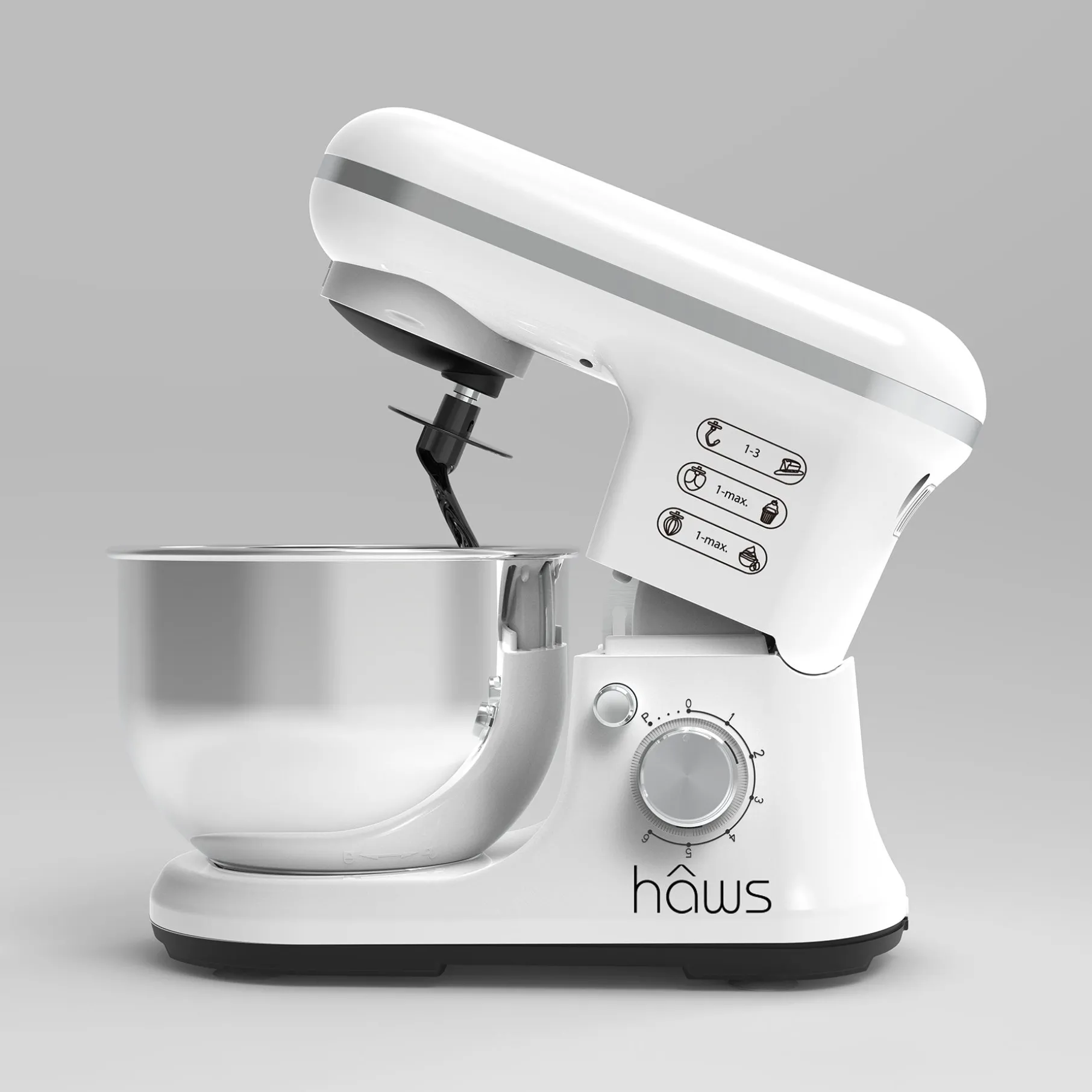 Hâws køkkenmaskine er i et elegant hvidt design med flere funktioner som er med en ydeevne på 1200W.