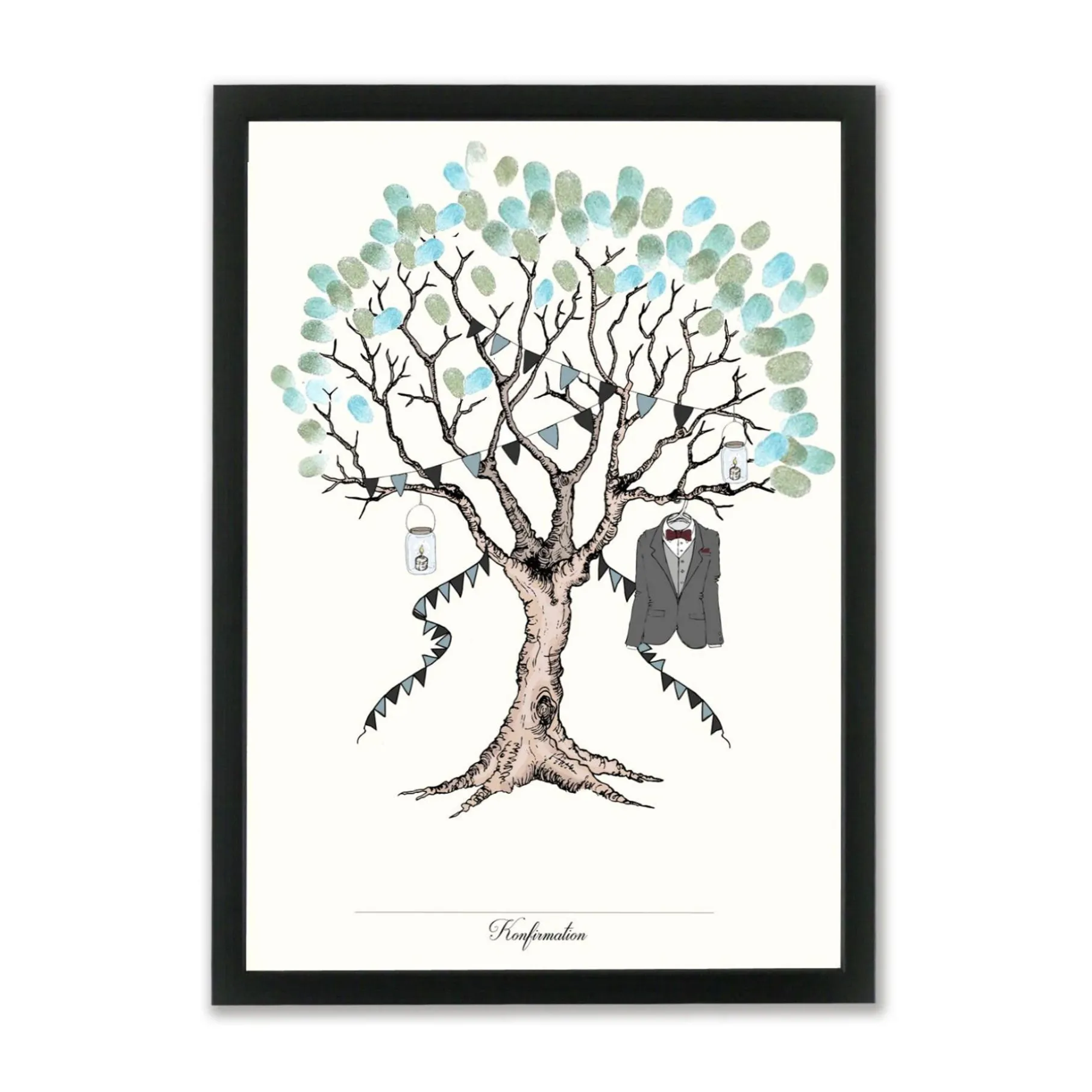 Smuk og personlig alternativ til den traditionelle gæstebog. Sættet består af en håndtegnet plakat, samt en æske med stempelfarve i 4 grønne nuancer. Her er det muligt at gæsterne sætter deres fingeraftryk som små blade på plakaten, og evt. skriver navn eller initialer inden i. I bunden er det muligt at skrive konfirmandens navn og dato.