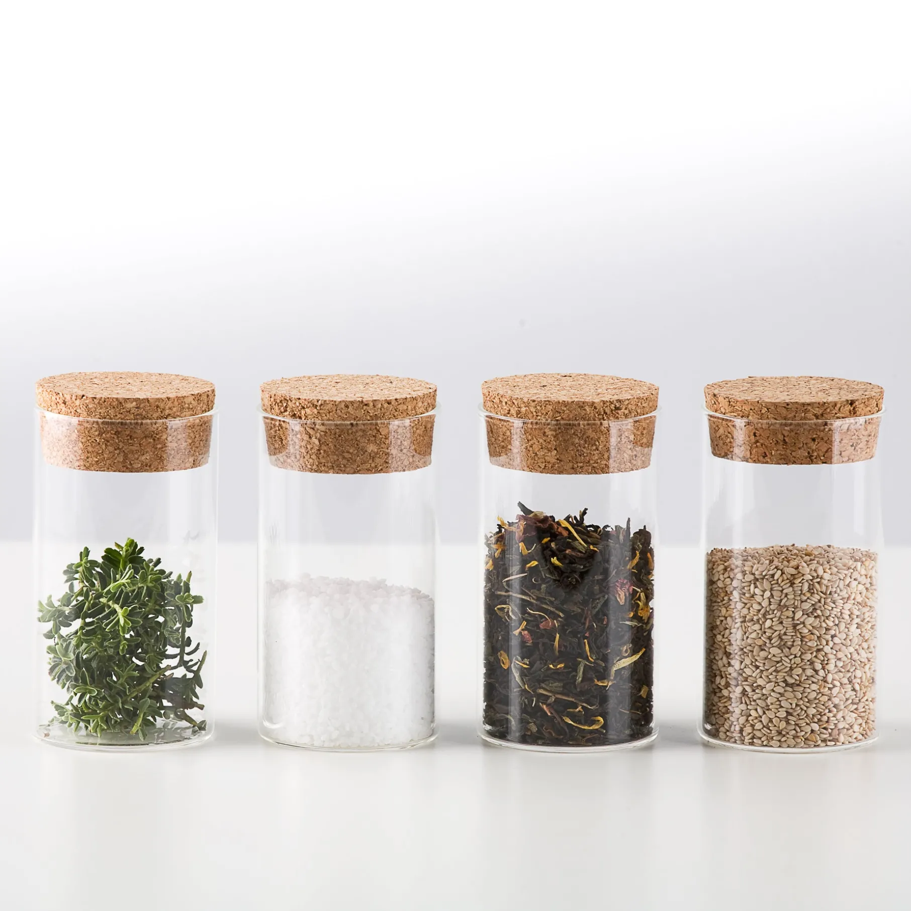 De fire ens glas med tætsluttende korklåg gør det muligt at opbevare alverdens krydderier og bageingredienser. Du vil opleve, at de gennemsigtige, enkle krukker på hylder og i skuffer bliver en dekorativ og personlig del af din indretning.