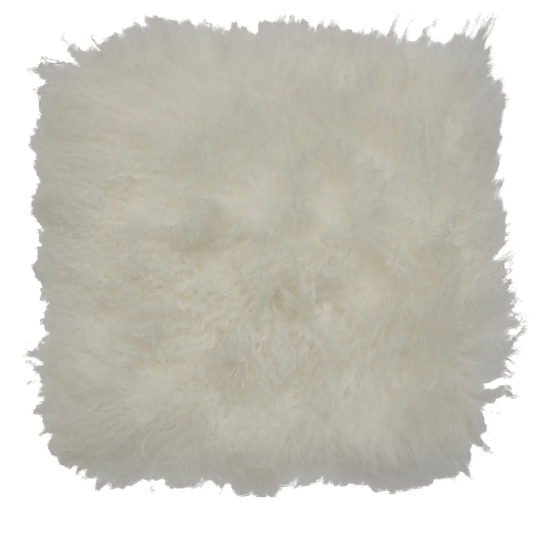 Firkantet hynde i ægte mongolsk lammeskind, som er blød og behagelig. Den kan lægges på en stol eller en bænk, til at give en ekstra blød og varm siddeflade. Hynder i lammeskind giver giver et hyggeligt og naturligt udtryk til indretningen.