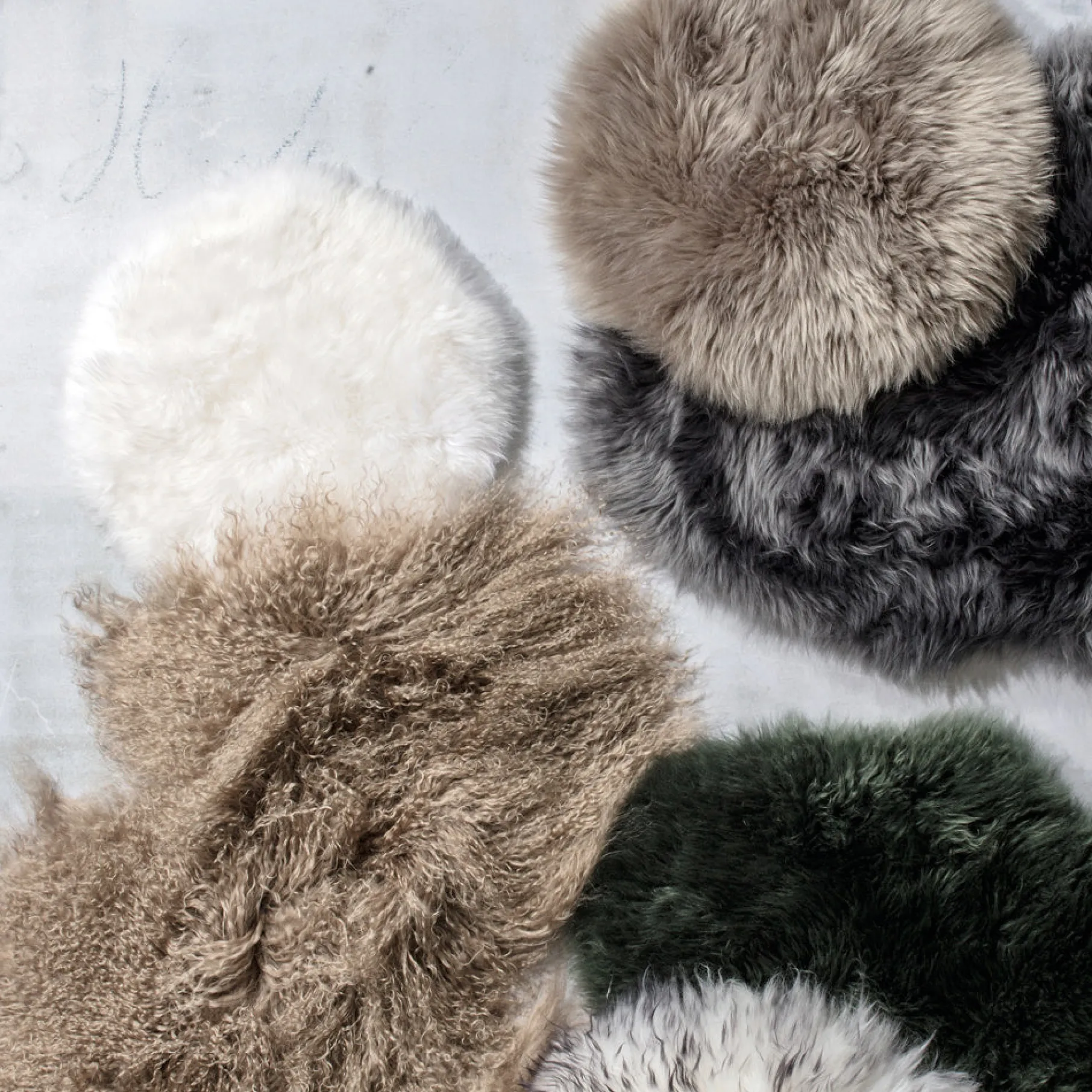 Rund hynde i ægte lammeskind i en lækker blød kvalitet. Hynden kan fx bruges til at lægge på en stol eller en bænk.
