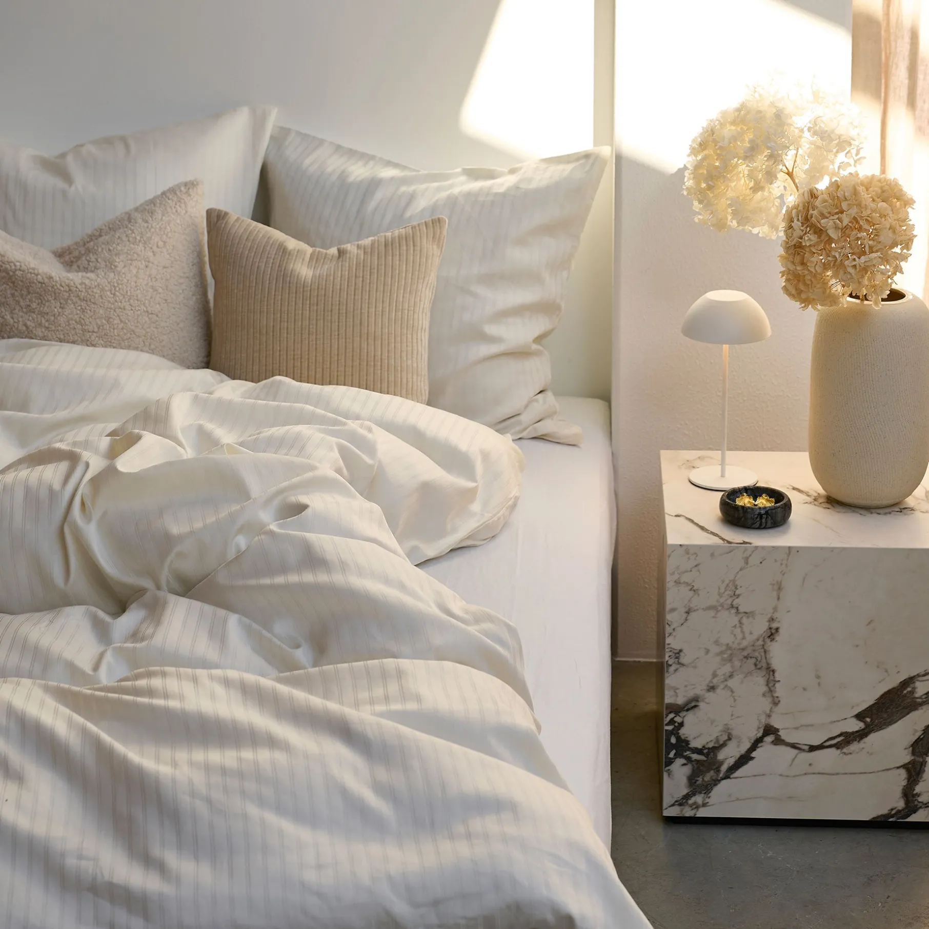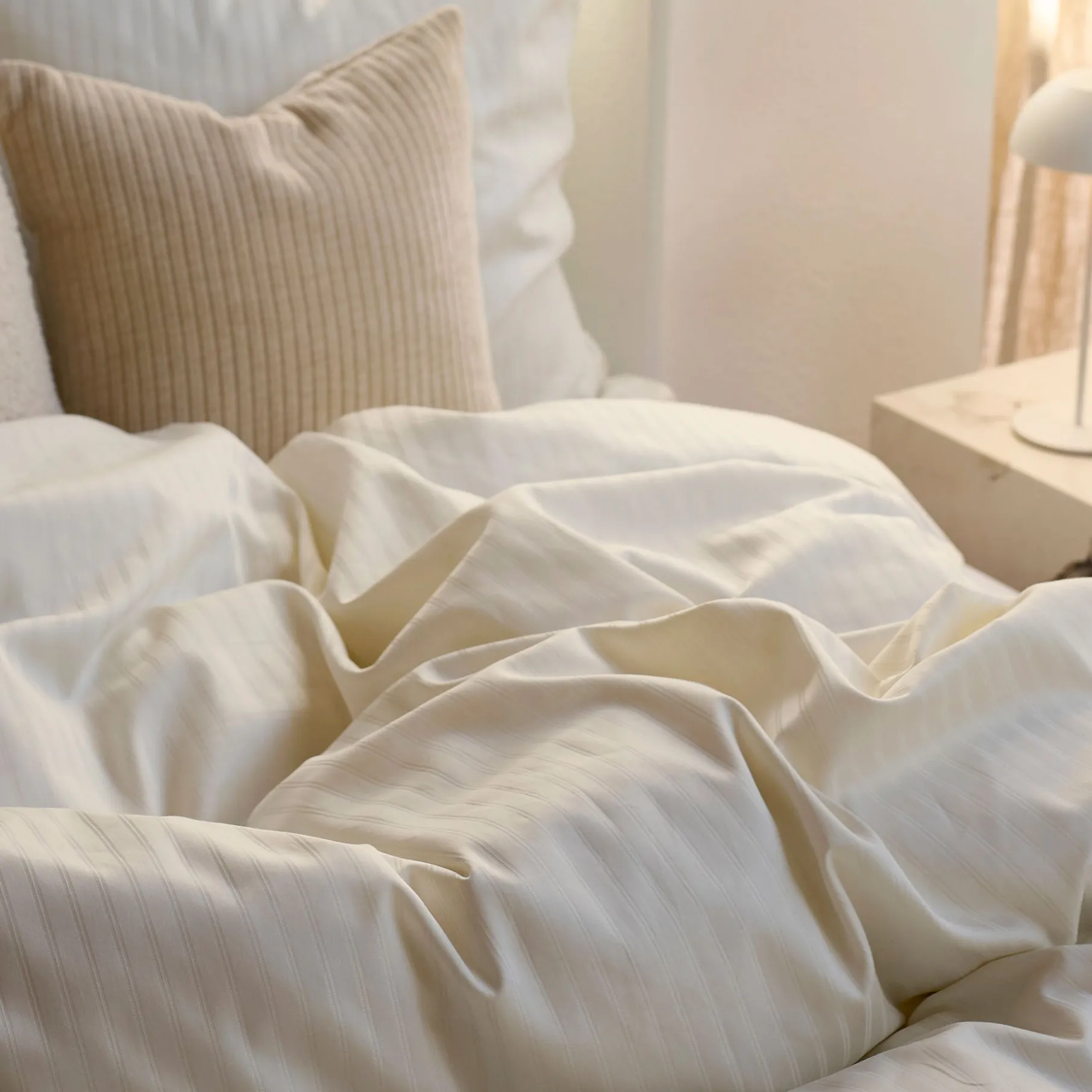 Satin-vævningen giver stoffet en glat, blød og let glansfuld overflade, som ofte forbindes med luksus og hotelstemning. Det føles køligt og silkeblødt mod huden.