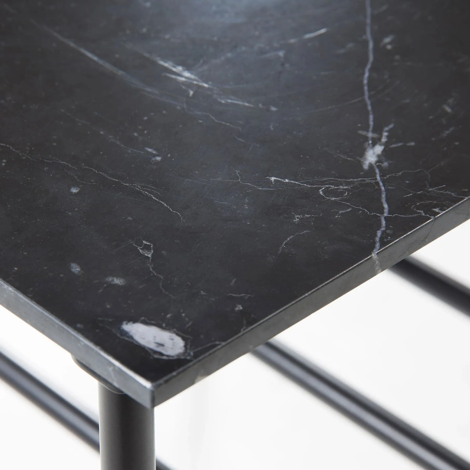Stilrent sofabord tegnet i minimalistiske rene linjer i marmor. Bordpladen har en skrå afskæring på kanten, som giver sofabordet en lethed. Det slanke stel er lavet i sort metal. Højden på bordet matcher siddehøjden på en almindelig sofa. Stellet er designet med fokus på funktionalitet og stabilitet. Stellet er justerbart i benenes ender, så det ikke vipper, og under bordet er der plads til fx at stille en lille bakke eller en bog.