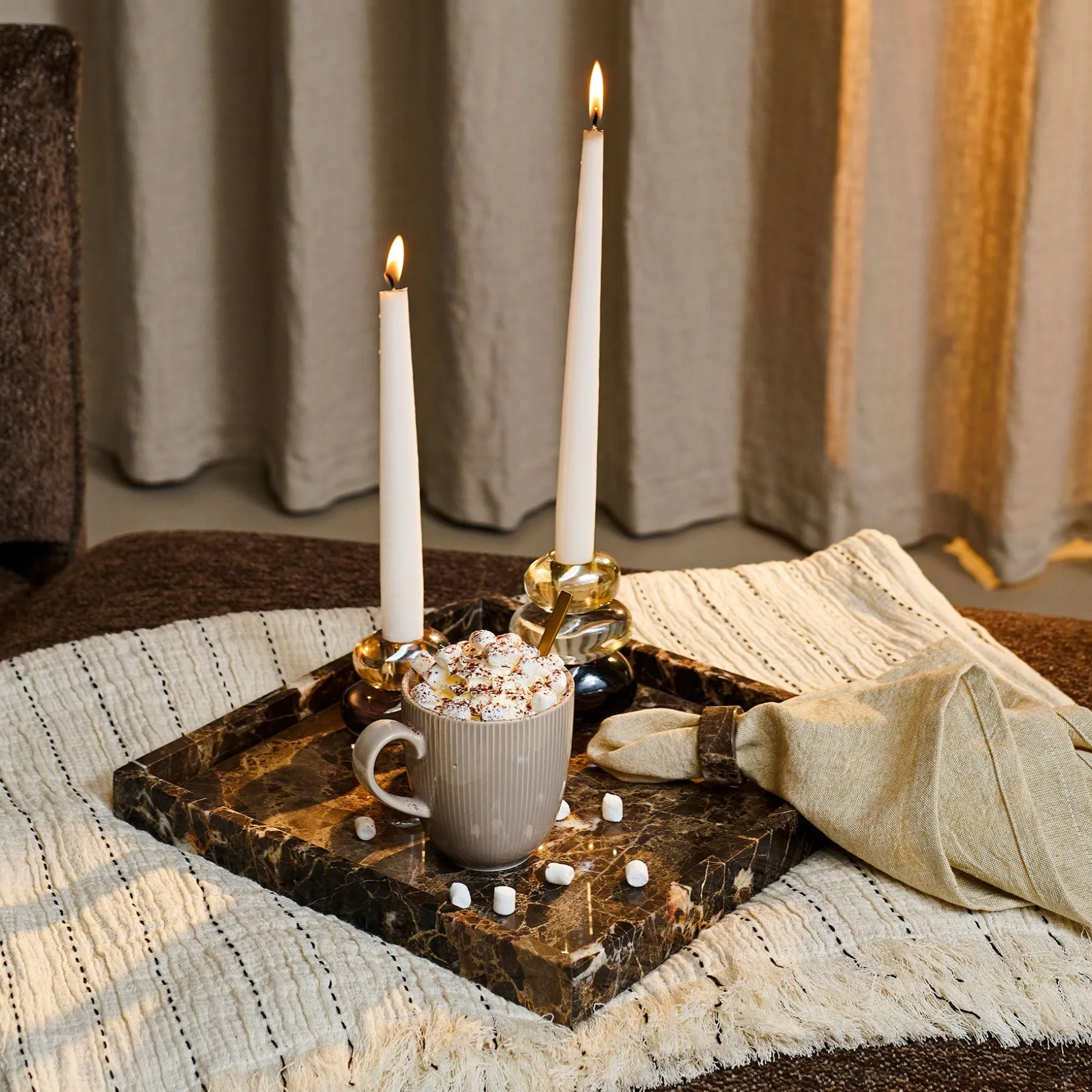 Firkantet bakke med en lille kant. Bakken er lavet i marmor, i varme brune nuancer og en blank overflade.