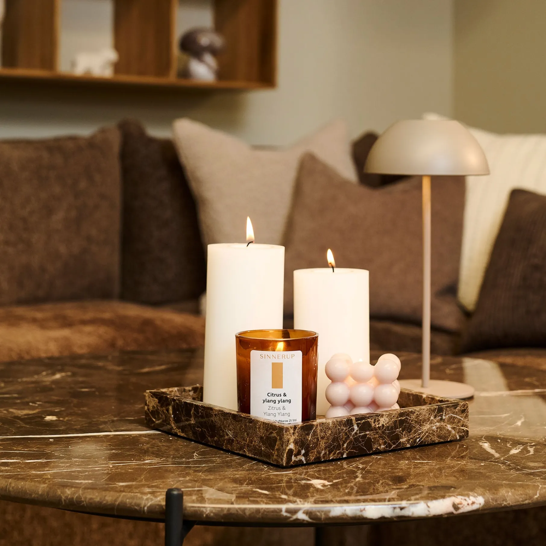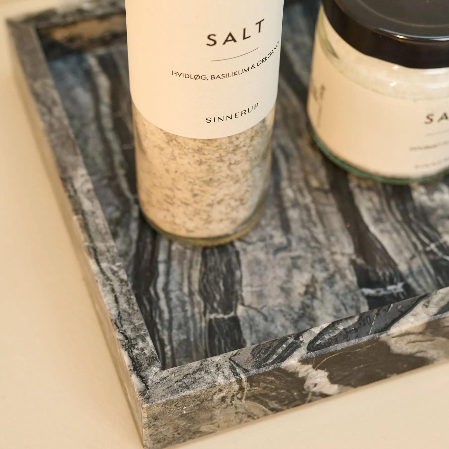 Marmorbakkerne er et stilfuldt dekorationselement til indretningen, og er her alle muligheder åbne. Den kan bruges til at samle dekorationsgenstande, som f.eks. en vase og et stearinlys. Den kan også bruges på badeværelset til en urtepotte, sæbe og duftlys, eller i køkkenet til at samle et udvalg af fine krydderier.