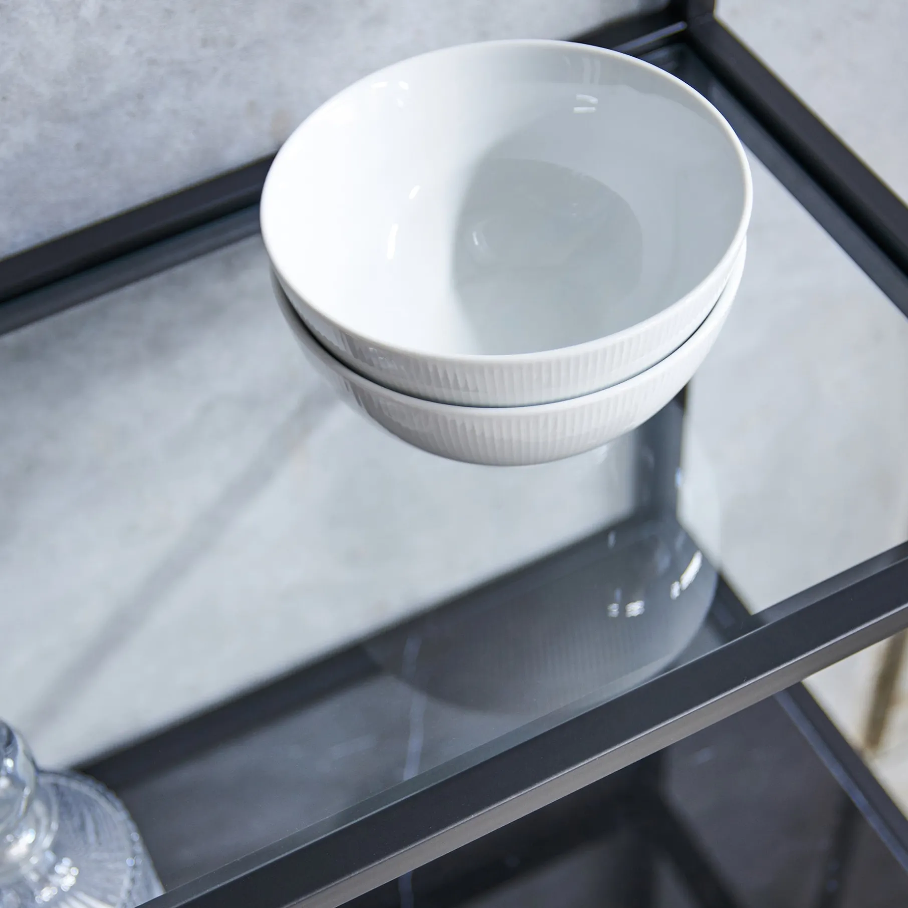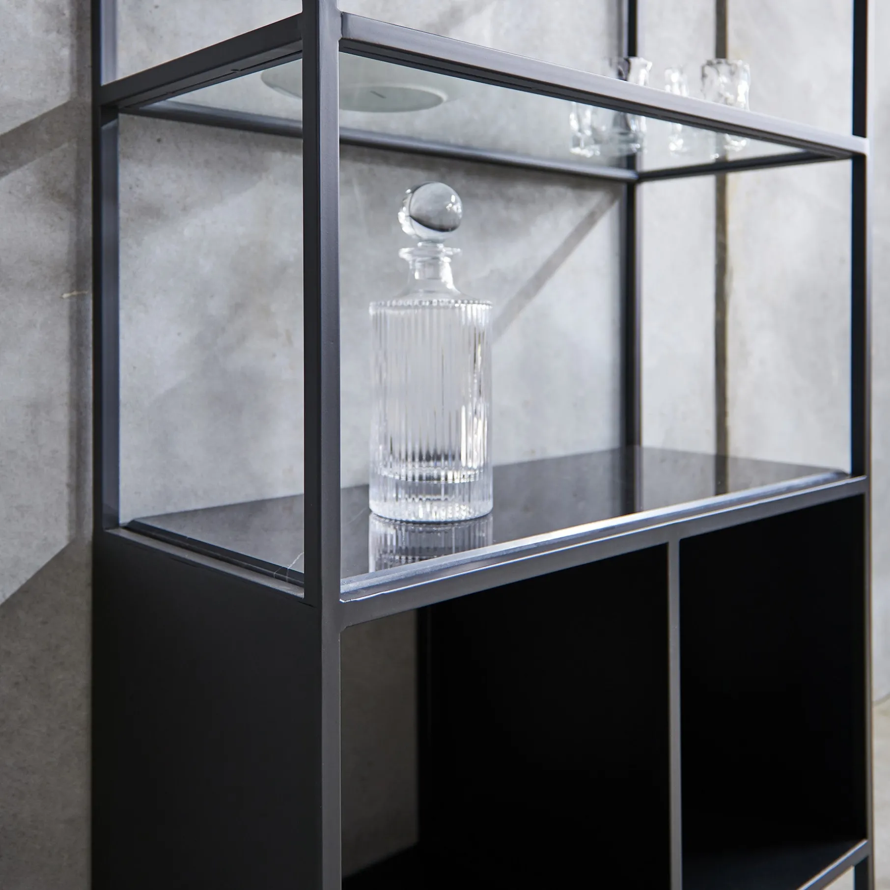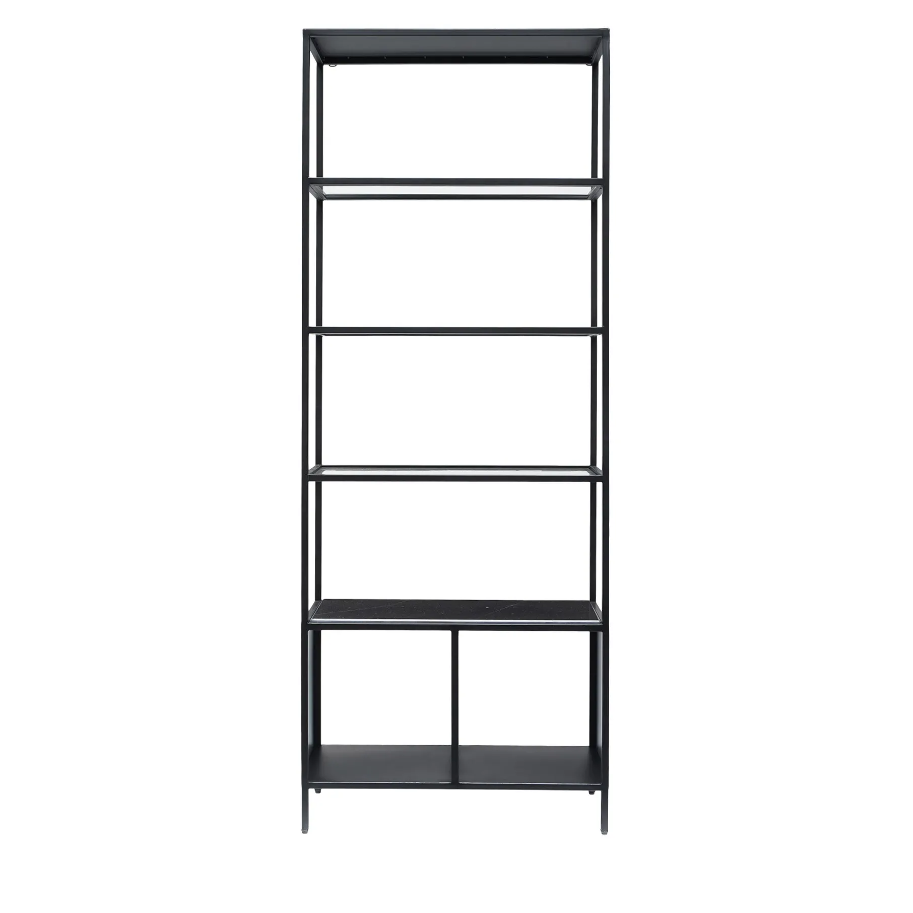 De rå, pulverlakkerede metaloverflader møder udskifteligt marmor i en sofistikeret kontrast og giver skabet en skarp karakter – industriel og raffineret på én og samme tid. Det åbne design lader lyset vandre frit og giver dit interiør plads til at ånde og træde frem. Nederst skaber de åbne rum en praktisk opbevaring, hvor dine ting får plads til at stå frit og tilgængeligt – uden at fylde for meget i rummet.