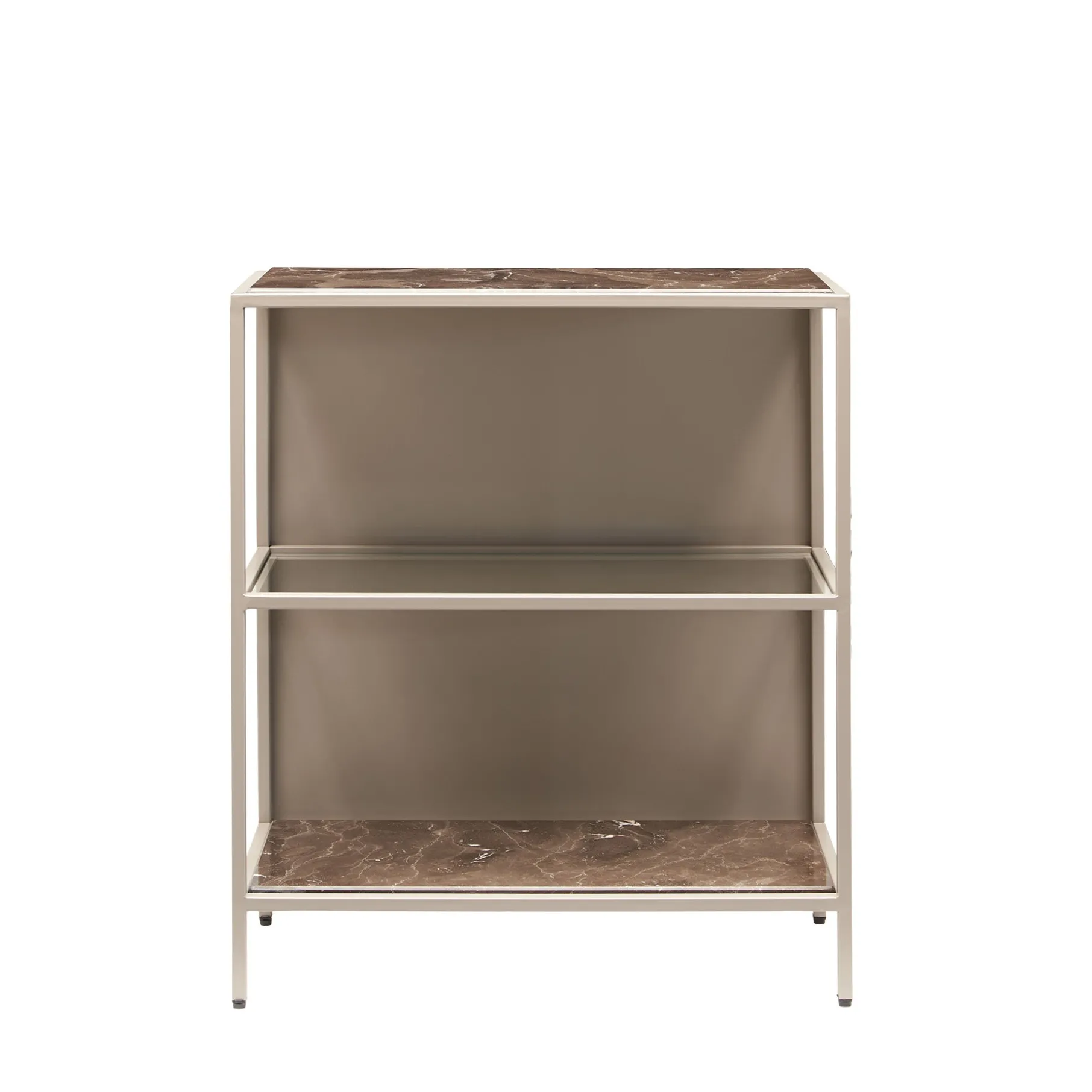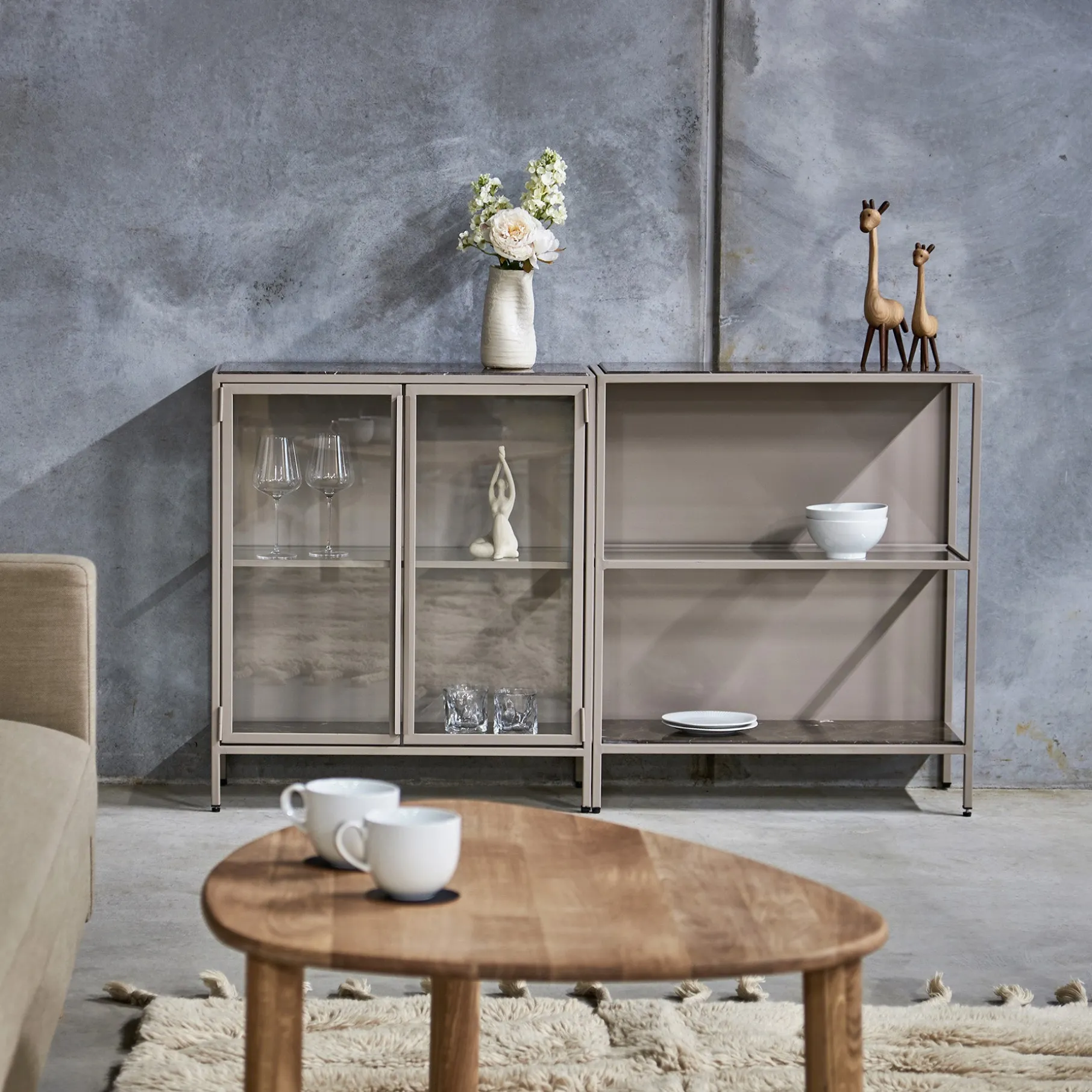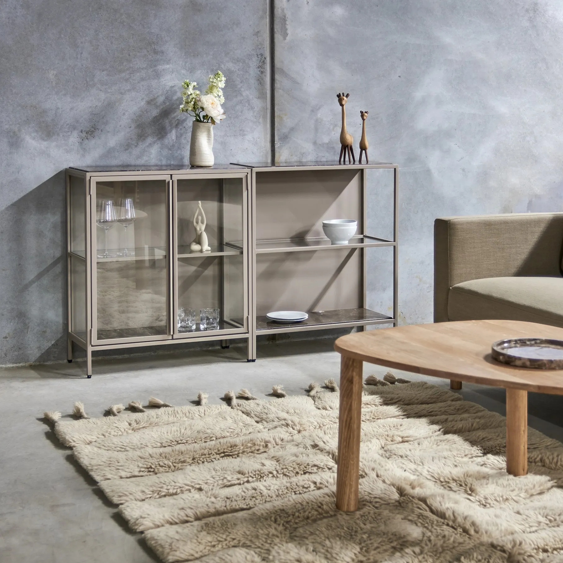 De rå, pulverlakkerede metaloverflader møder udskifteligt marmor i en sofistikeret kontrast og giver skabet en skarp karakter – industriel og raffineret på én og samme tid. Det åbne design lader lyset vandre frit og giver dit interiør plads til at ånde og træde frem.