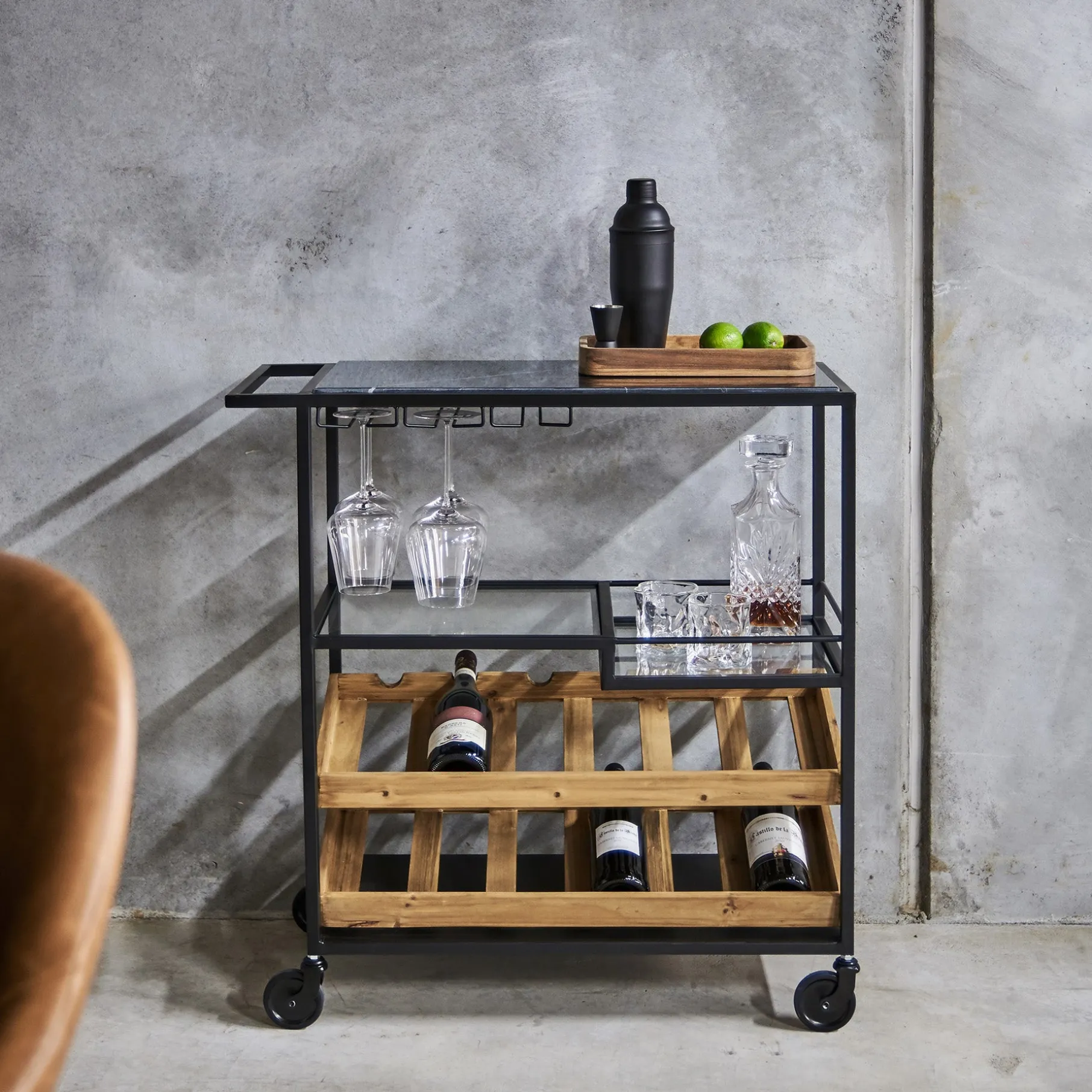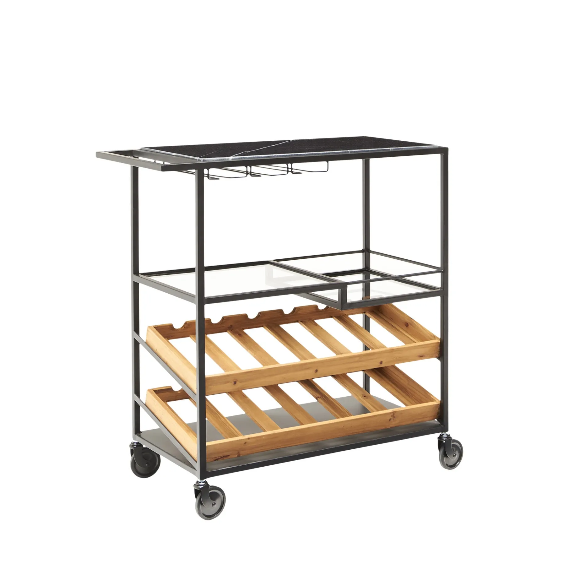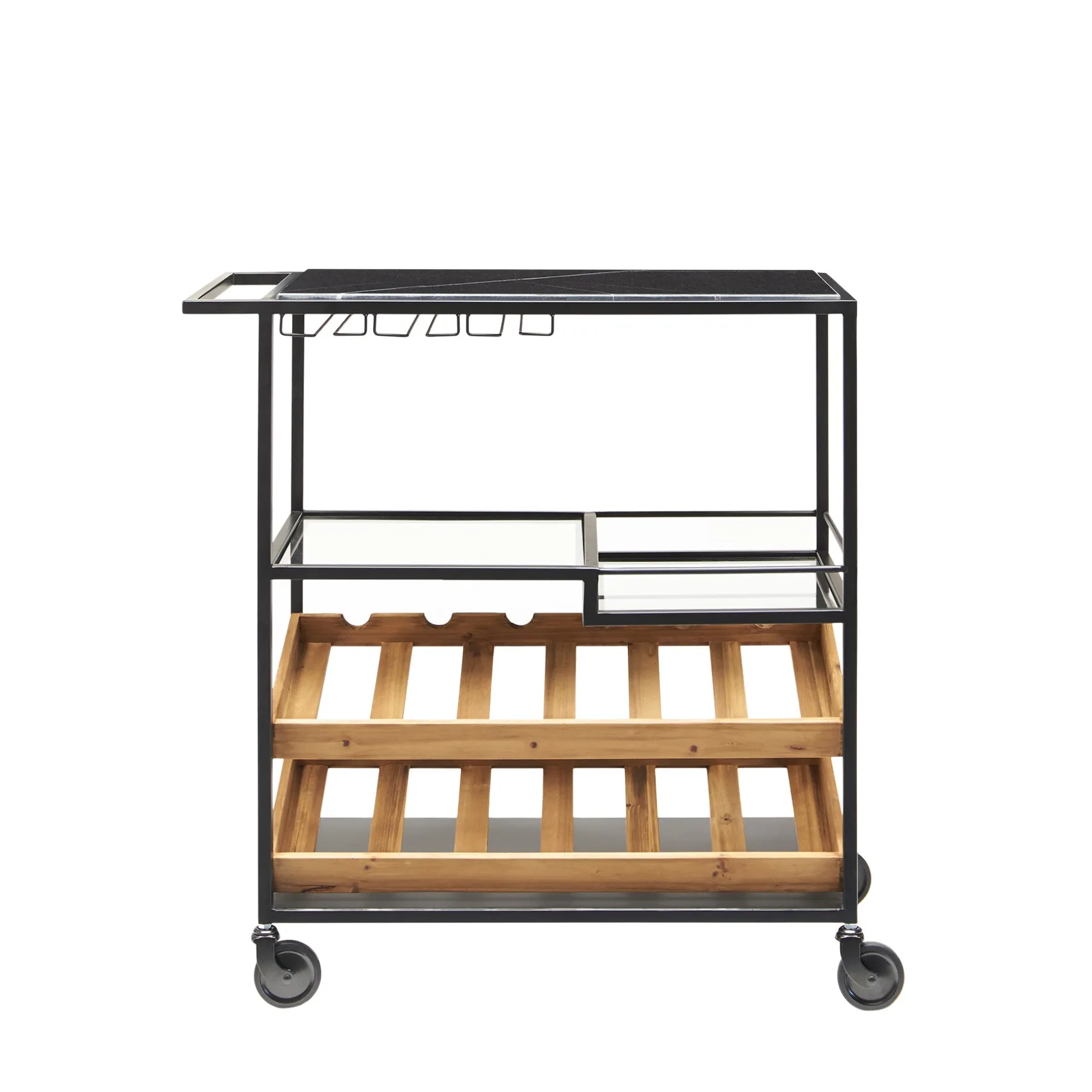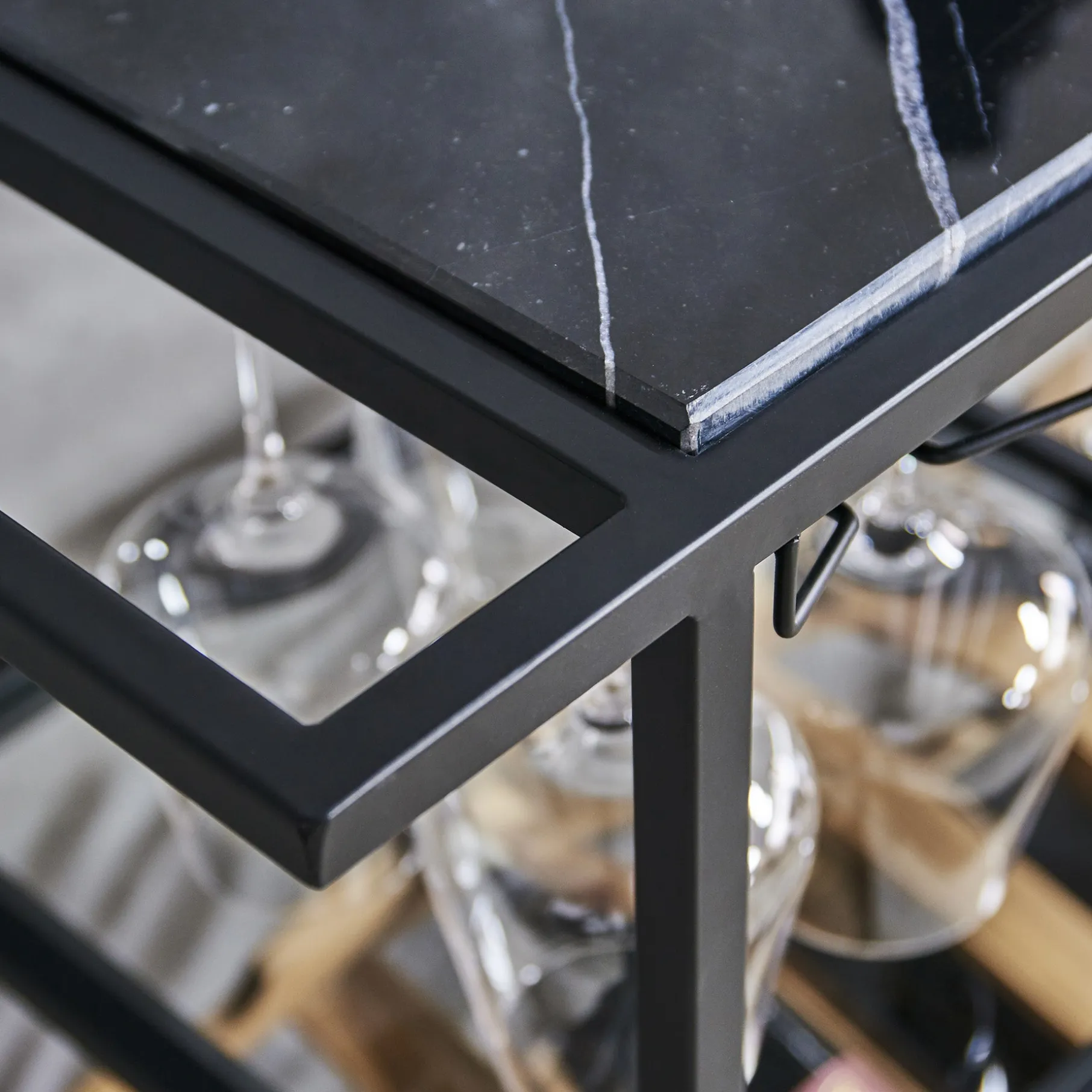De rå, pulverlakerede metaloverflader møder udskifteligt marmor i en sofistikeret kontrast, og sammen med de varme trædetaljer signalerer barbordet kvalitet og gennemført design. Hjulene gør det nemt at flytte bordet, mens integrerede håndtag giver et godt greb og fuld kontrol. Vinglasholderen holder dine glas flot og sikkert på plads, og vinbakkerne præsenterer dine vine med stil – perfekt til både servering og udstilling.