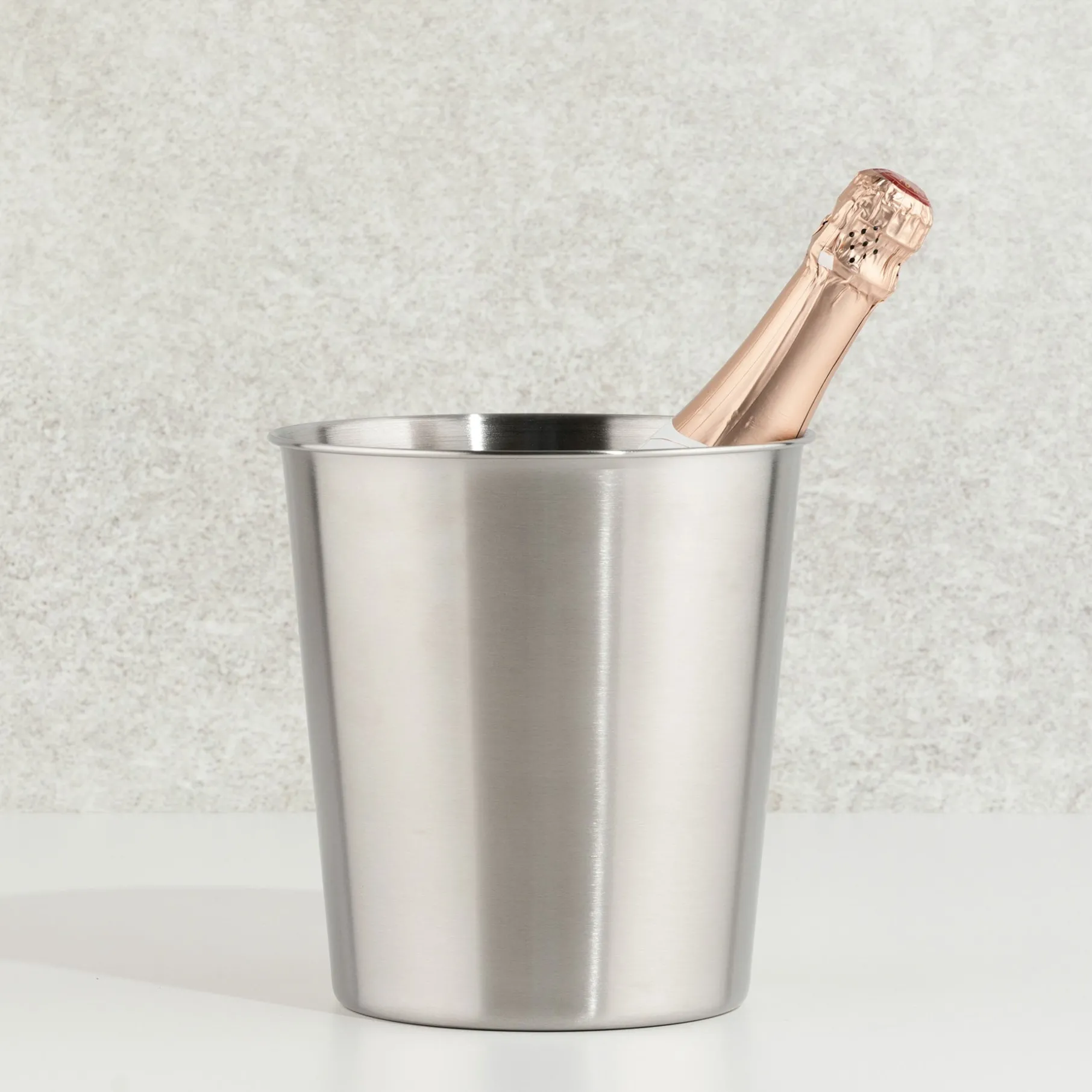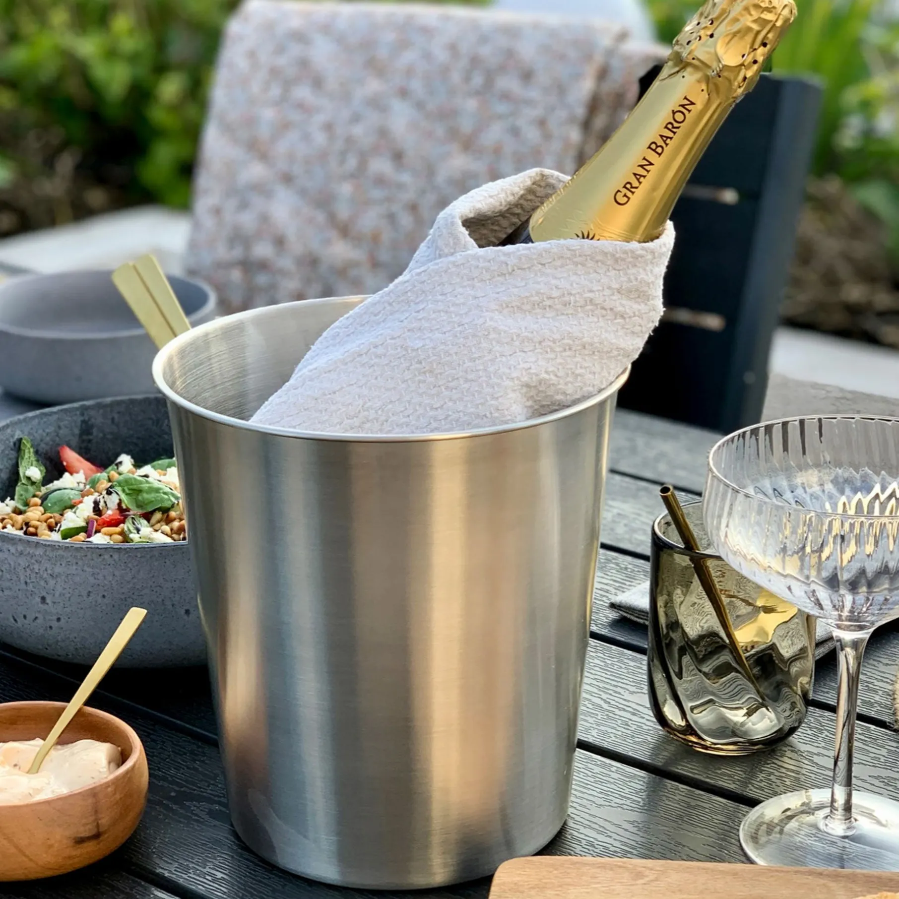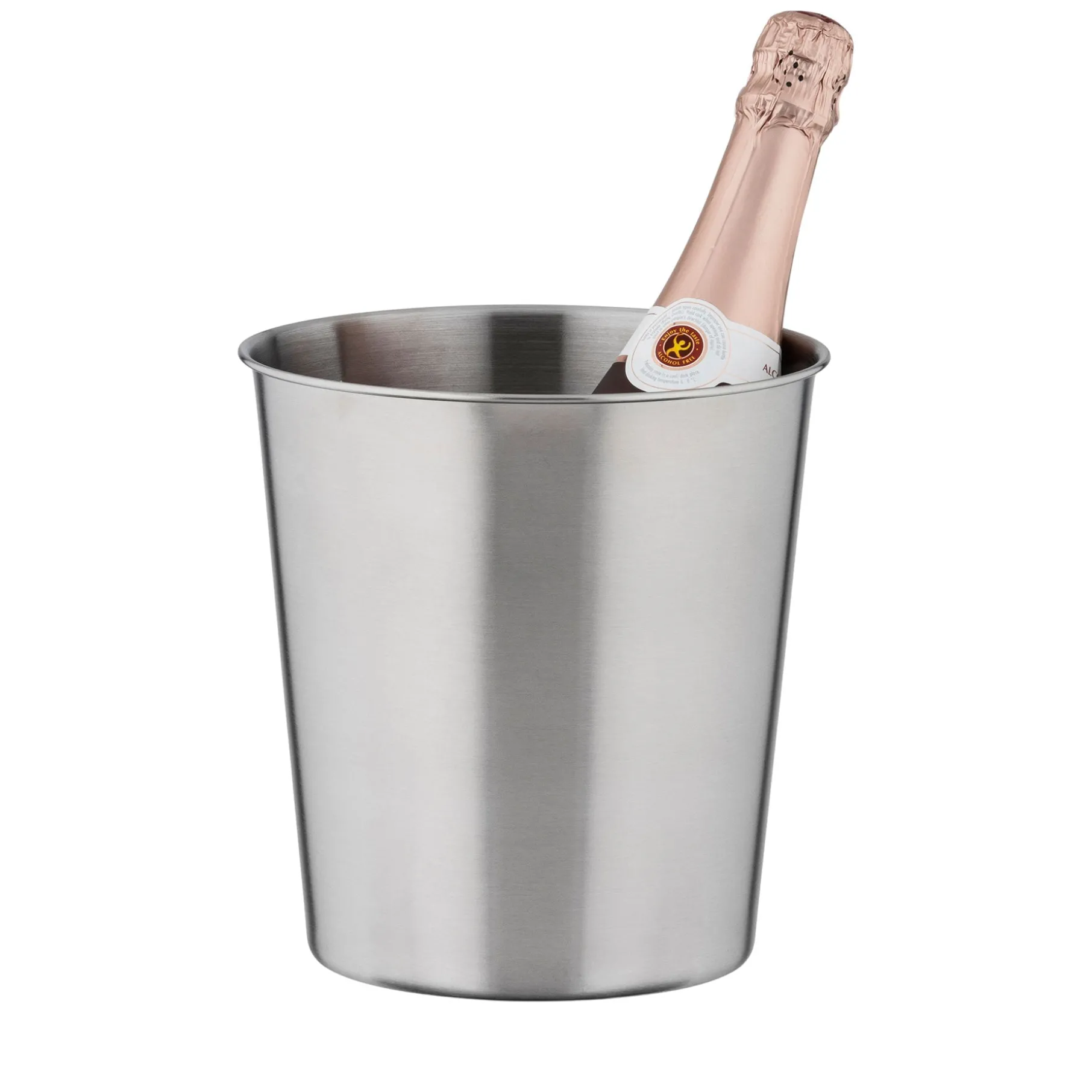 Vinkøleren er lavet af blankpoleret rustfrit stål og er lavet i et minimalistisk design. Den kan indeholde mange isterninger og nedkøle både champagne og vinflasker på en elegant måde.